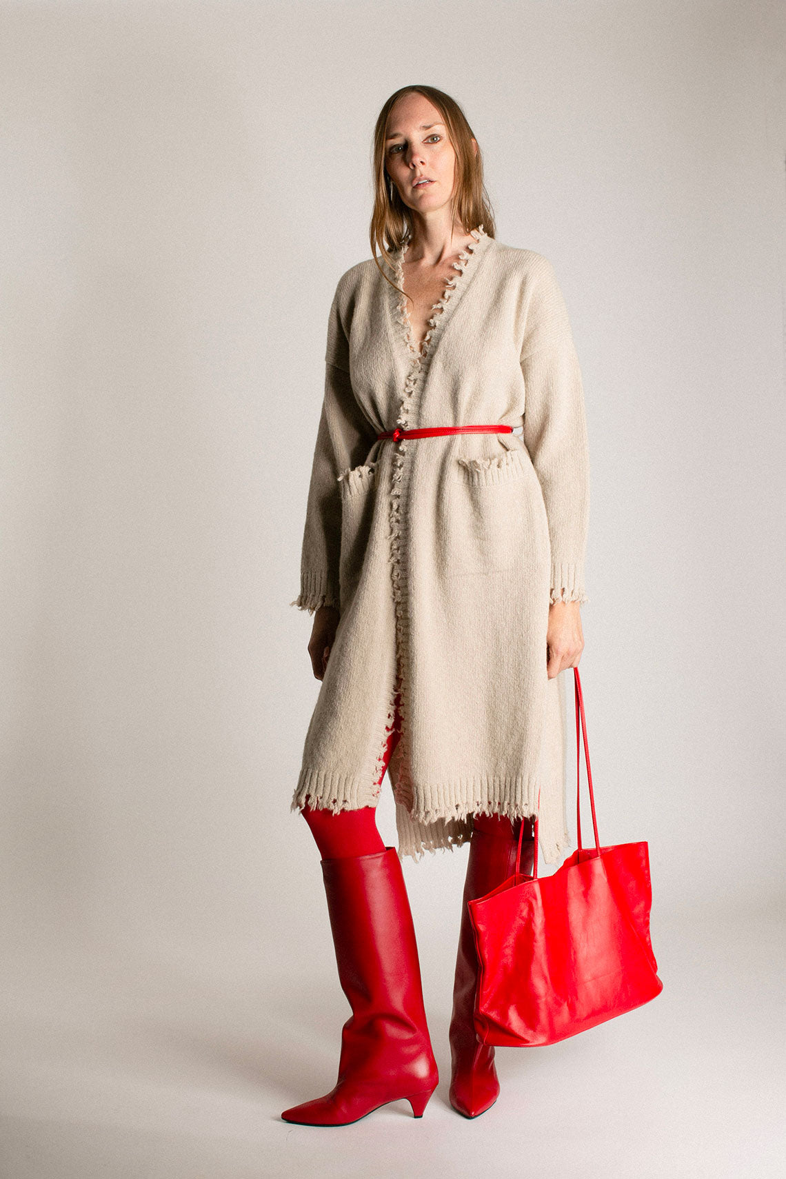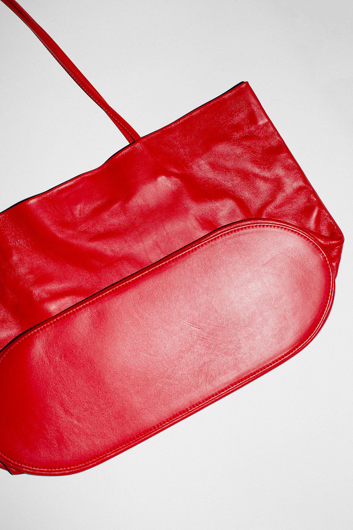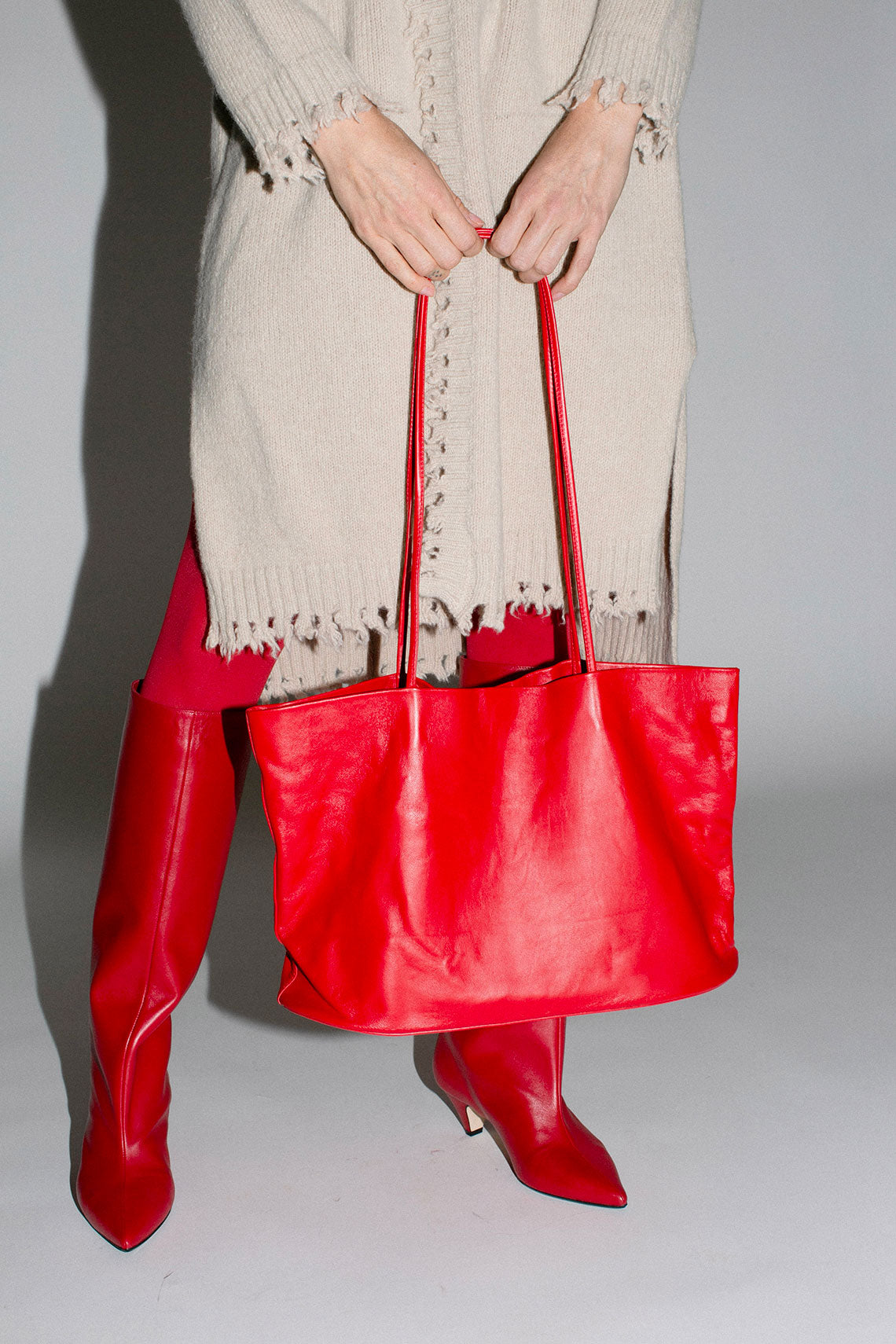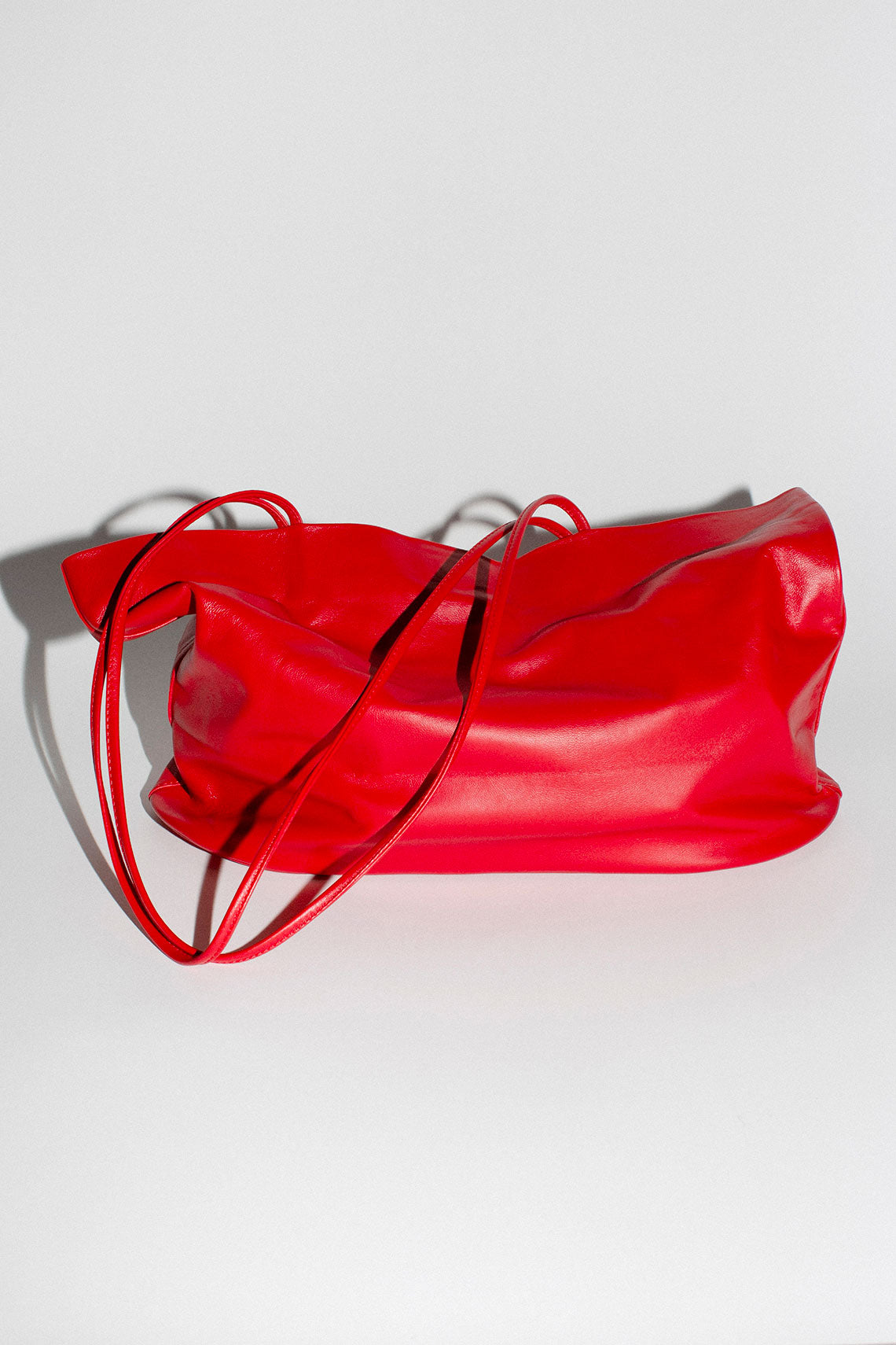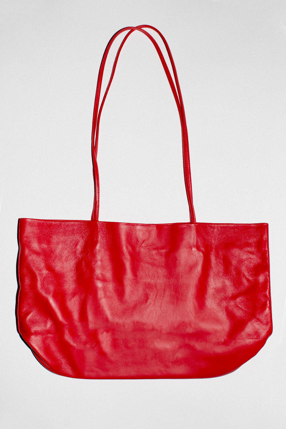 Wide oval base tote with skinny straps. Unlined with magnetic closure. Tote measures 14"w x 11"h. bottom depth - 5" Strap drop length 15". Fabric is 100% Italian lamb leather.