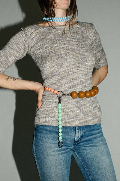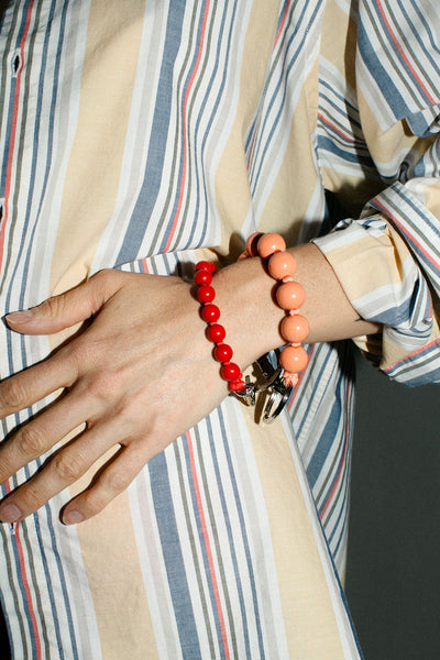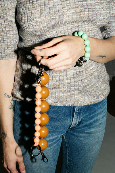 Chunky, 16mm lax peach painted wooden bead bracelet or keychain with a metal key ring and snap clasp. 8.5" total length. Varnish is vegan and non-toxic. Also available in pastel green.