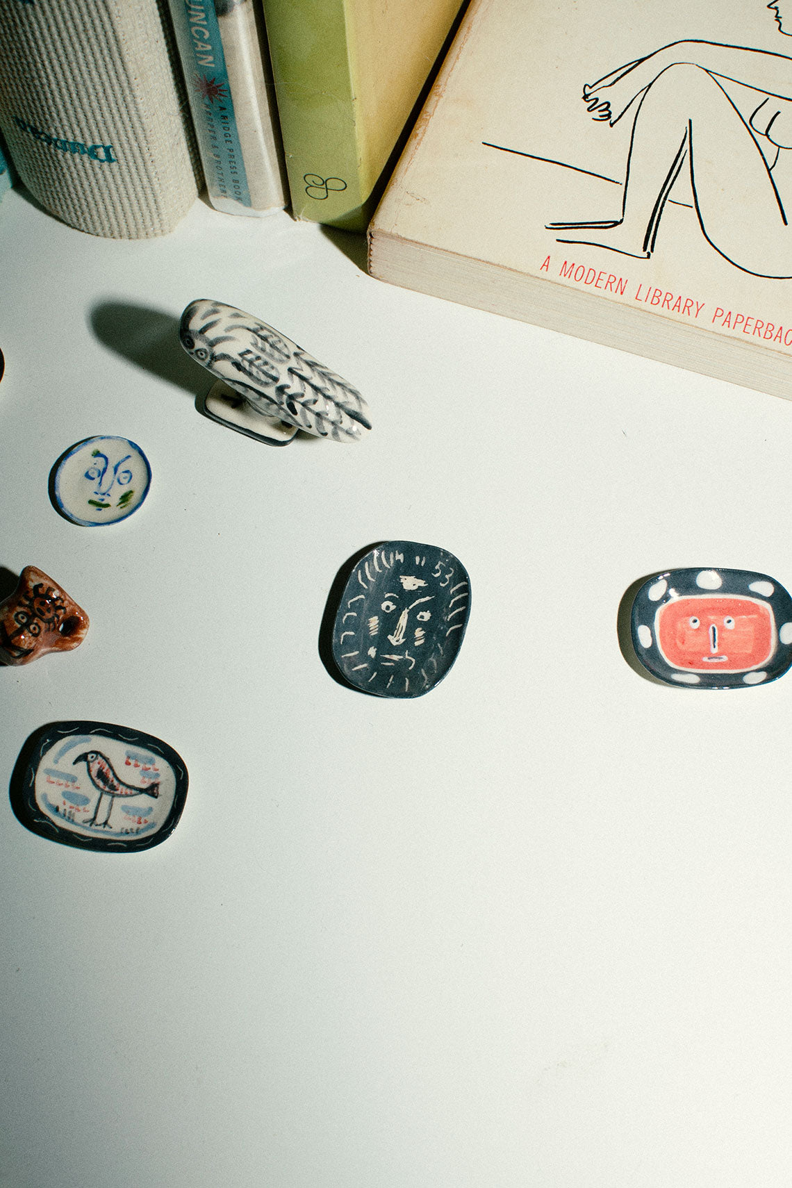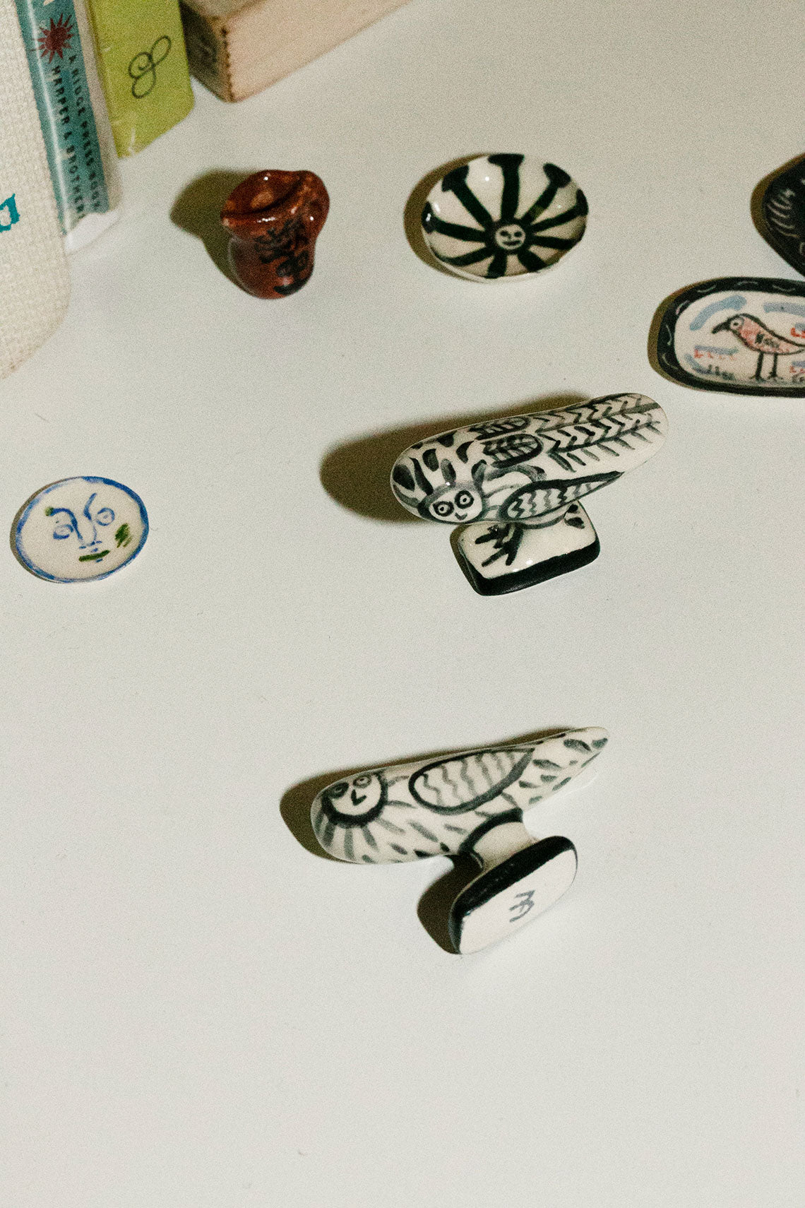 Tiny Picasso-inspired ceramic owl sculpture. All items are handmade from start to finish, using clay, underglaze paint, several glazes, china paint. Measures 1 1/4 inch high by 1 3/4 inch long.