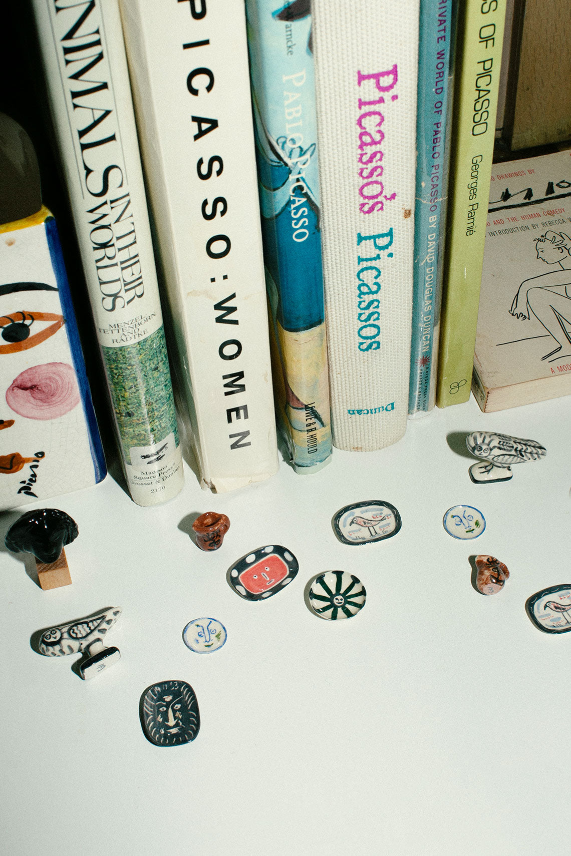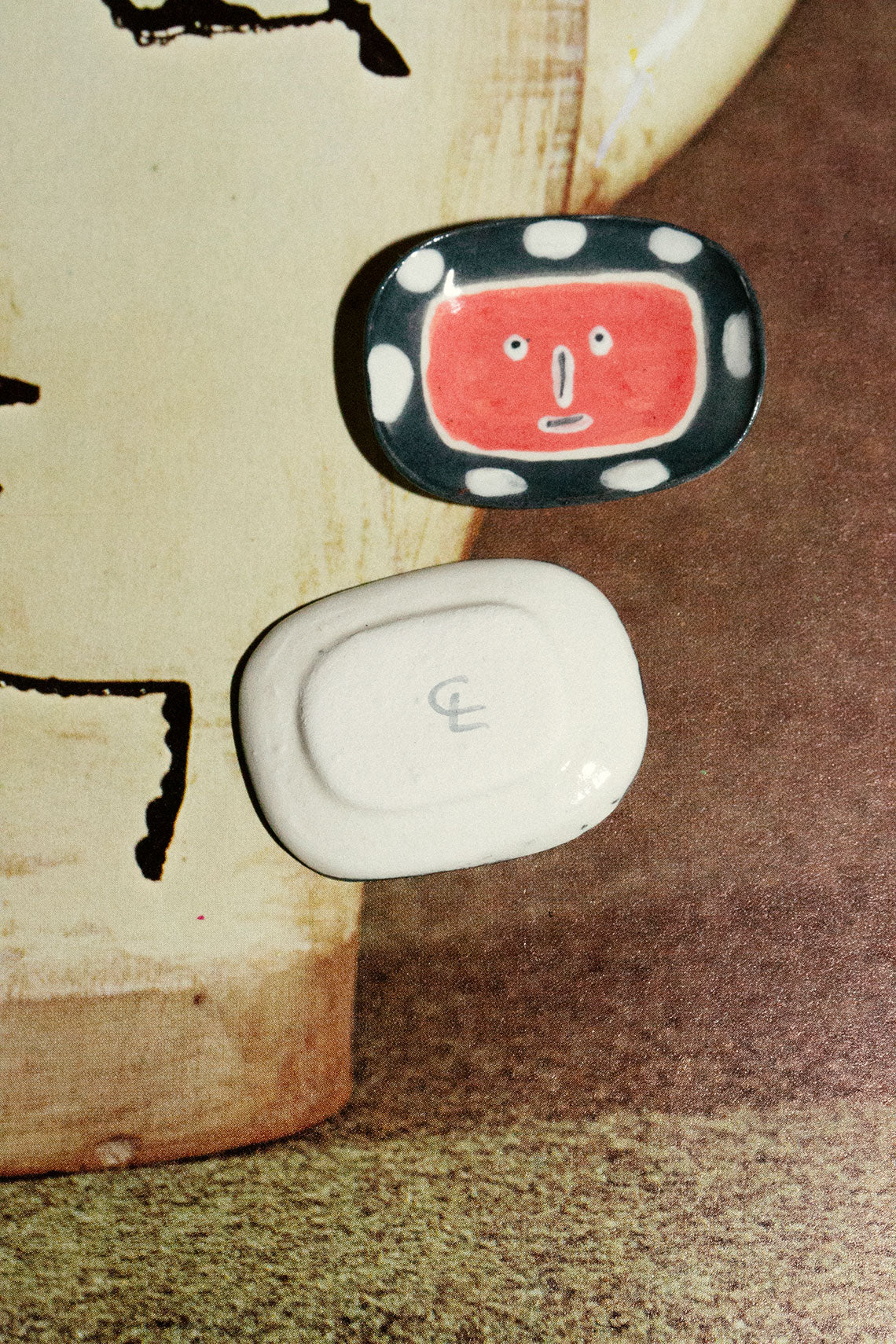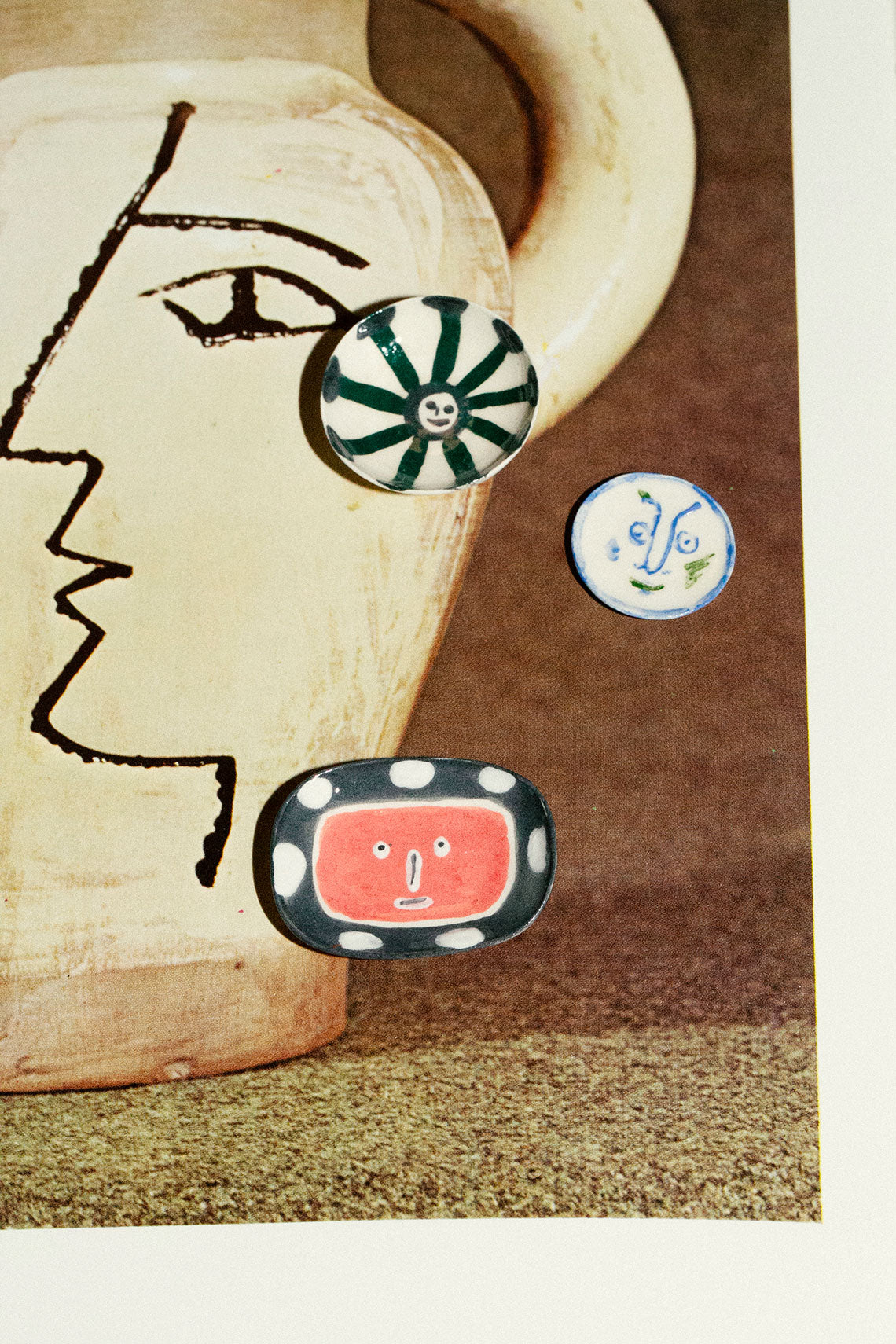 Tiny Picasso-inspired ceramic platter with red face. All items are handmade from start to finish, using clay, underglaze paint, several glazes, china paint. Measures 1 inch by 1 1/4.  Very Fragile.