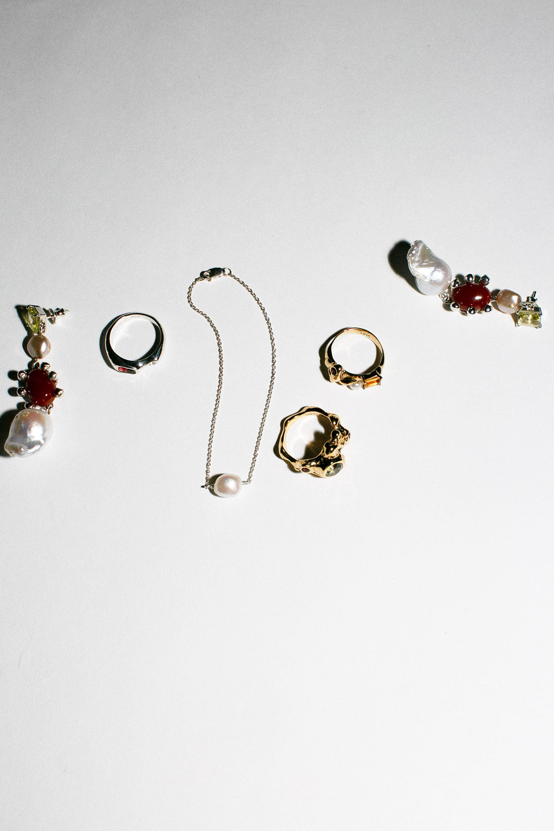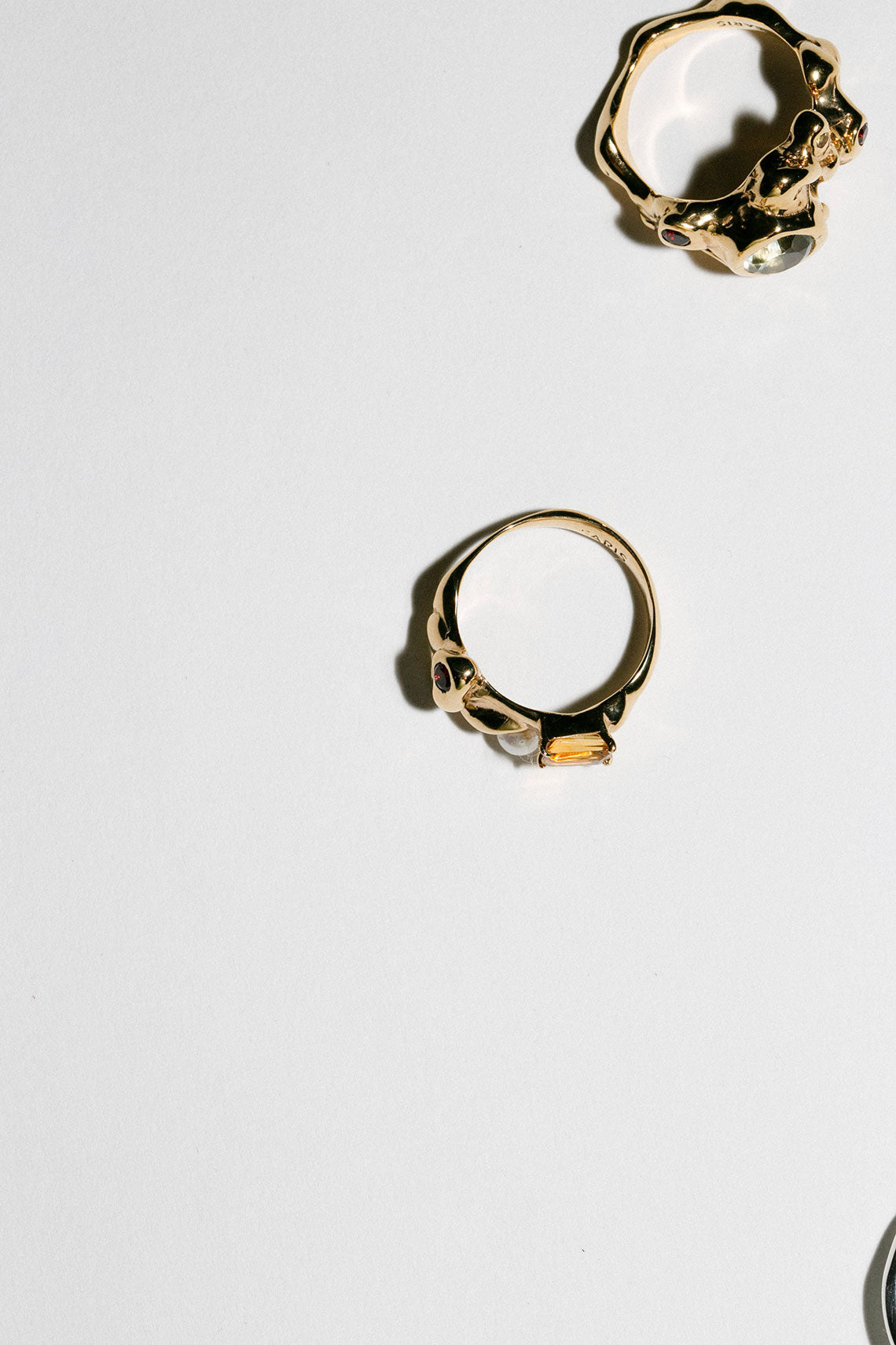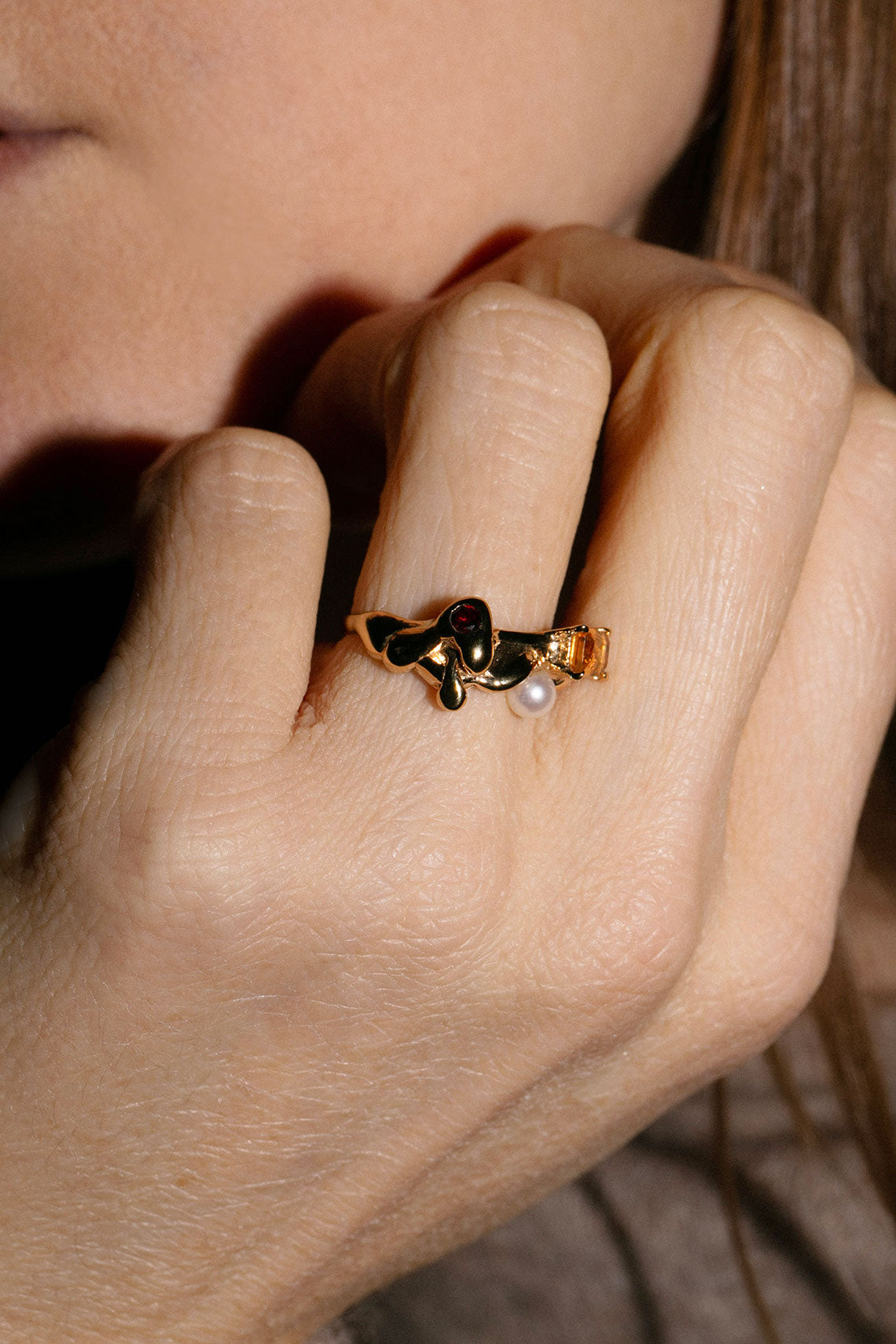 A collage of molten metal, gems and a single freshwater pearl. Gold-plate and adorned with garnet, citrine and a fresh water pearl.