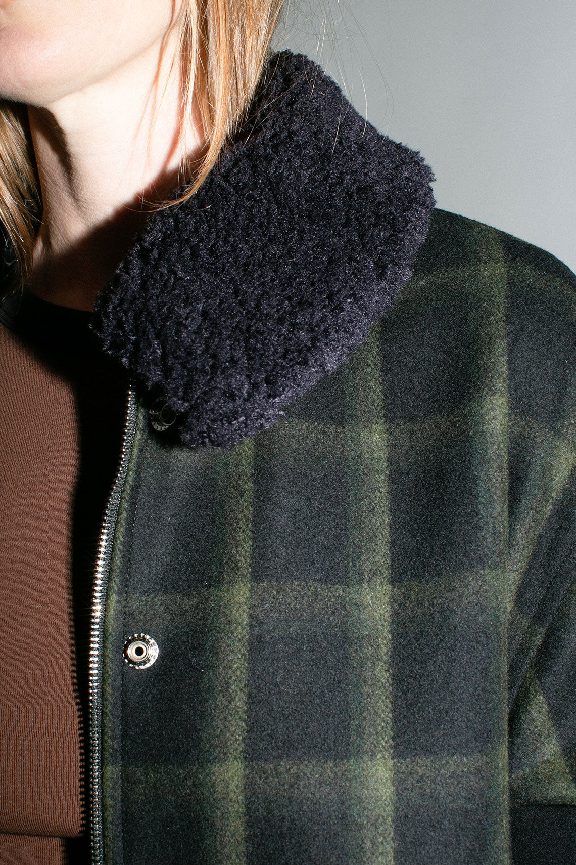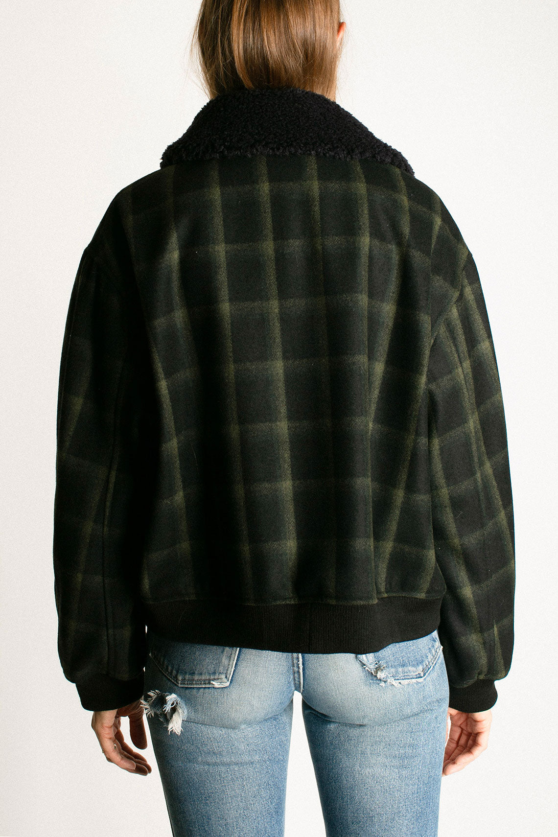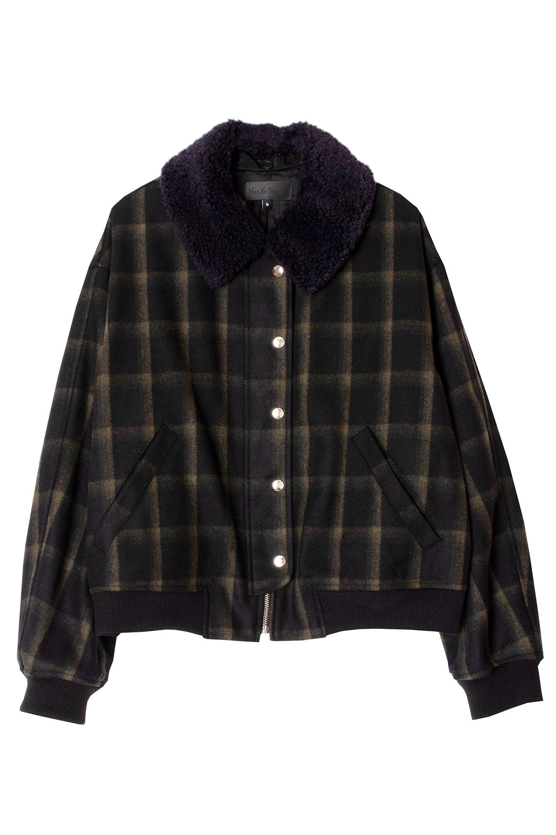 Plaid wool jacket with a slightly cropped, boxy fit and removable faux fur collar. Contrasting ribbed waistband and cuff as well as a hidden zip closure with front snap placket. Fabric is  80% wool and 20% poly. Made in USA.