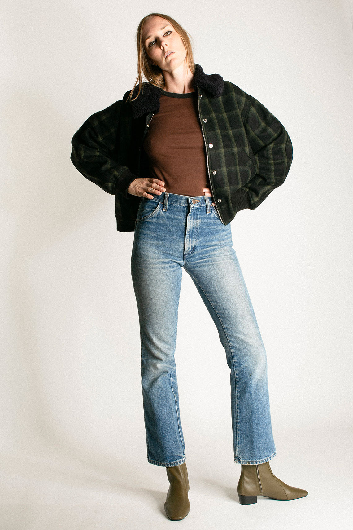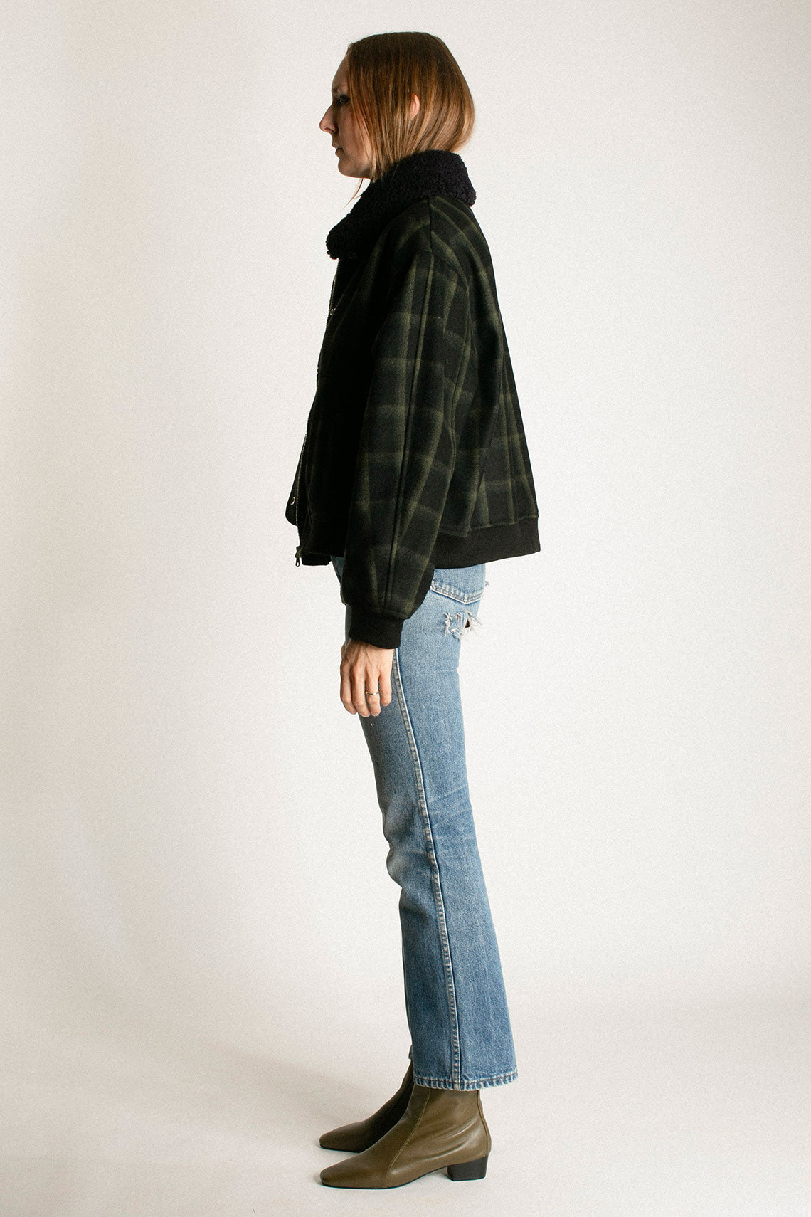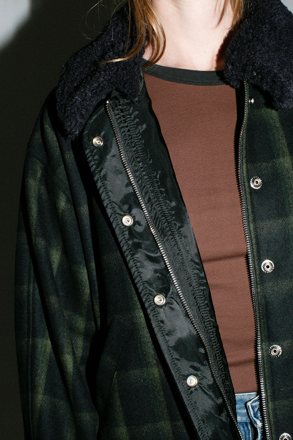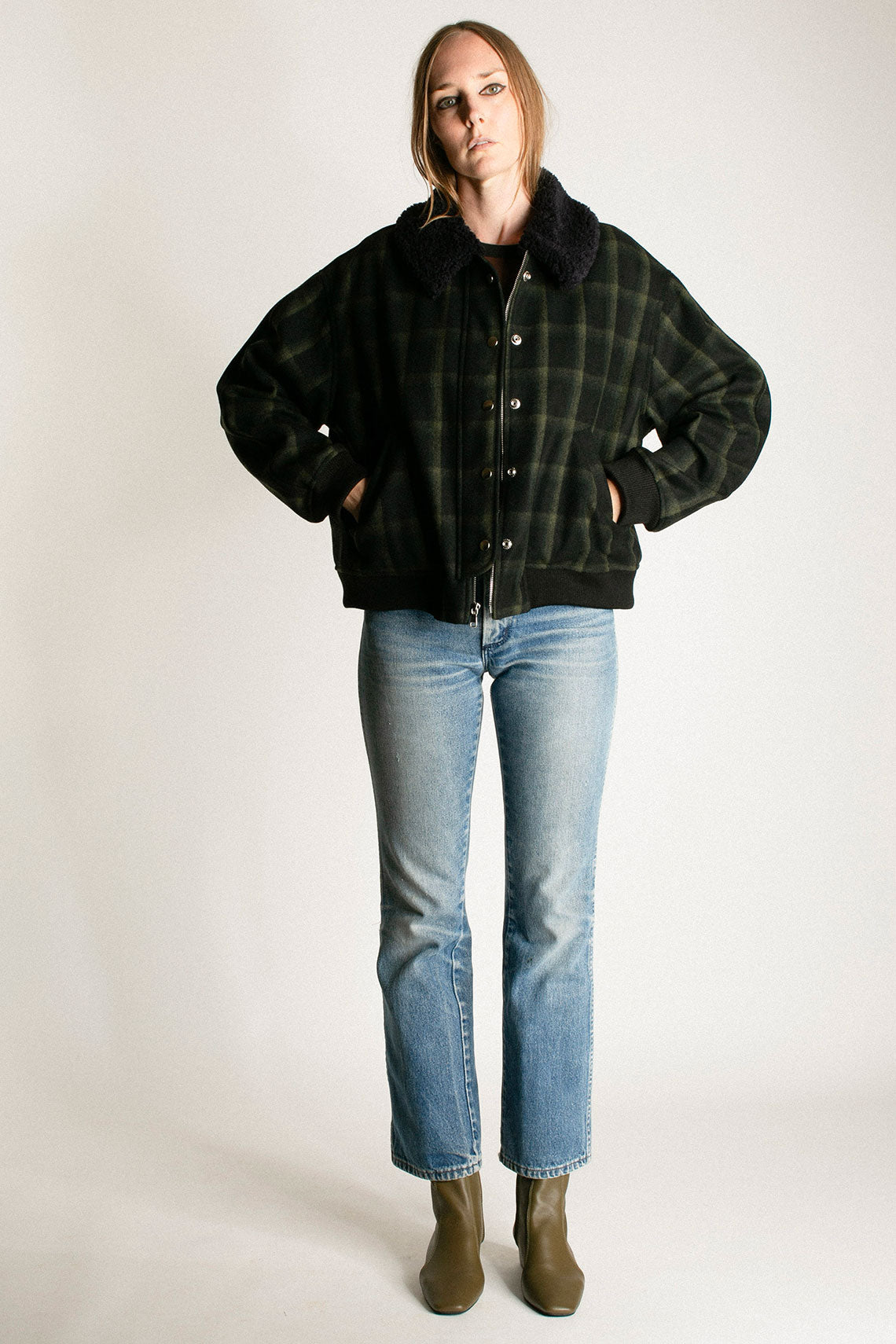 Plaid wool jacket with a slightly cropped, boxy fit and removable faux fur collar. Contrasting ribbed waistband and cuff as well as a hidden zip closure with front snap placket. Fabric is  80% wool and 20% poly. Made in USA.