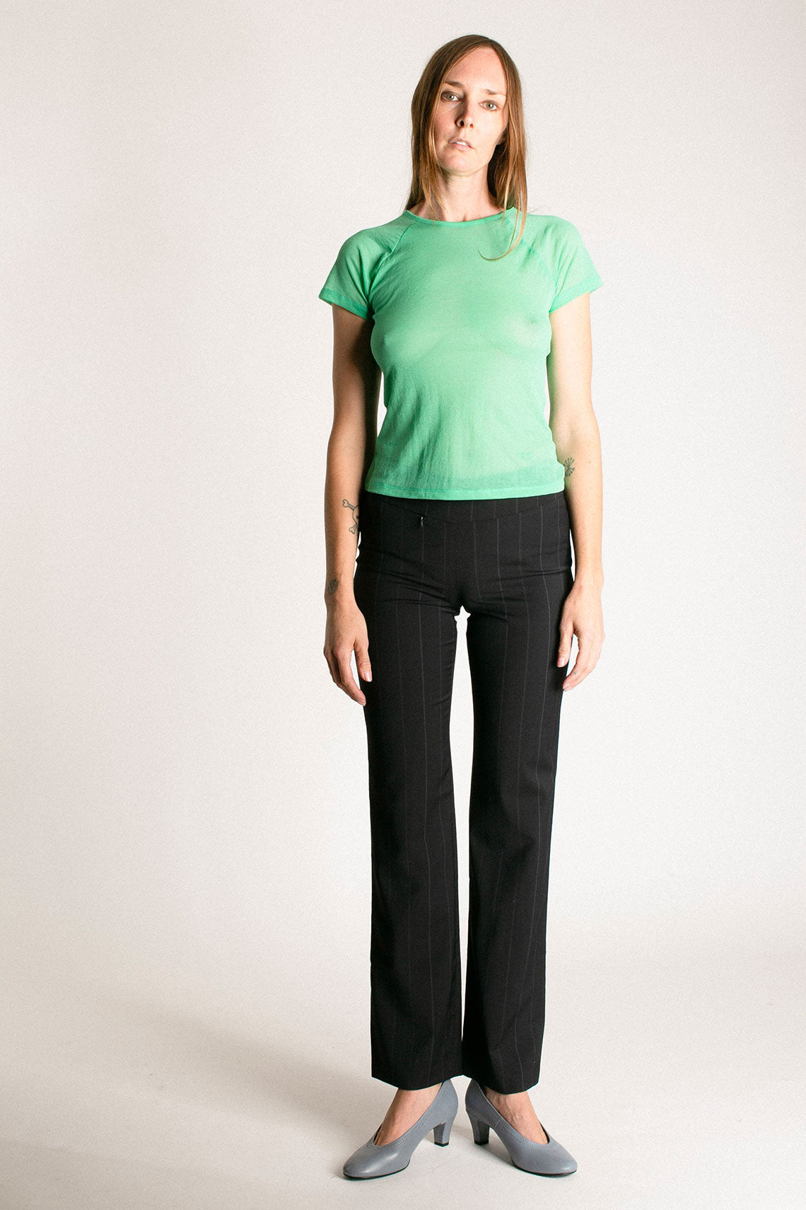 Slightly sheer cap sleeve tee with Paloma Wool embroidery at the bottom. Fabric has a soft hand feel reminiscent of crepe. Fabric is 70% organic cotton 30% polyamide.