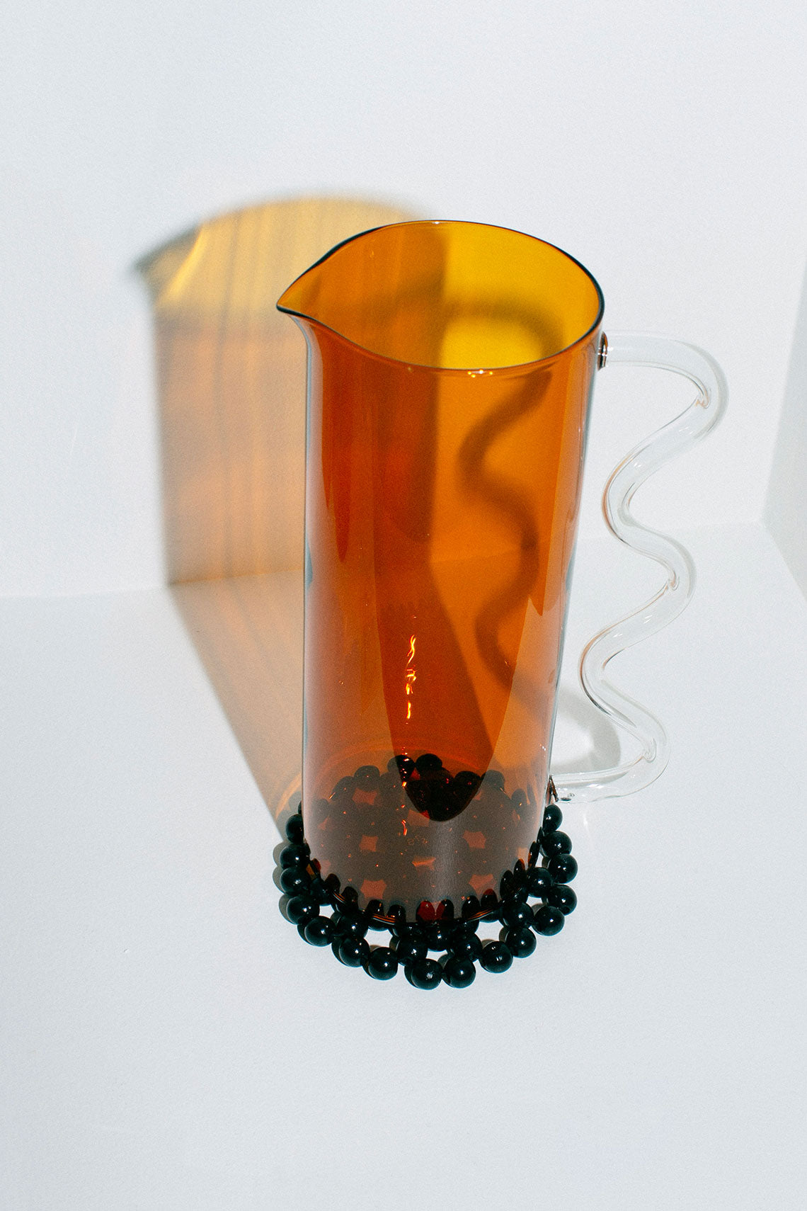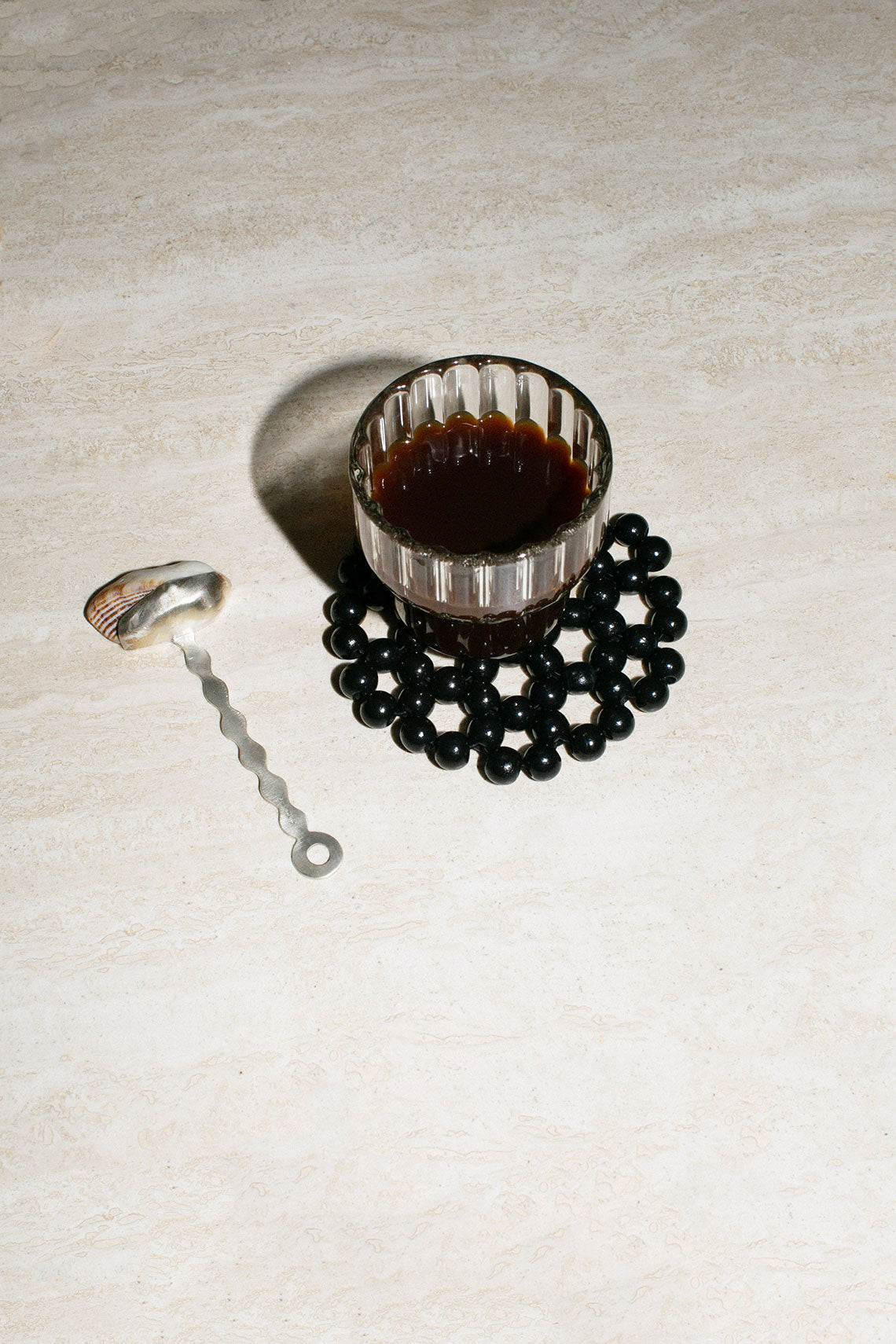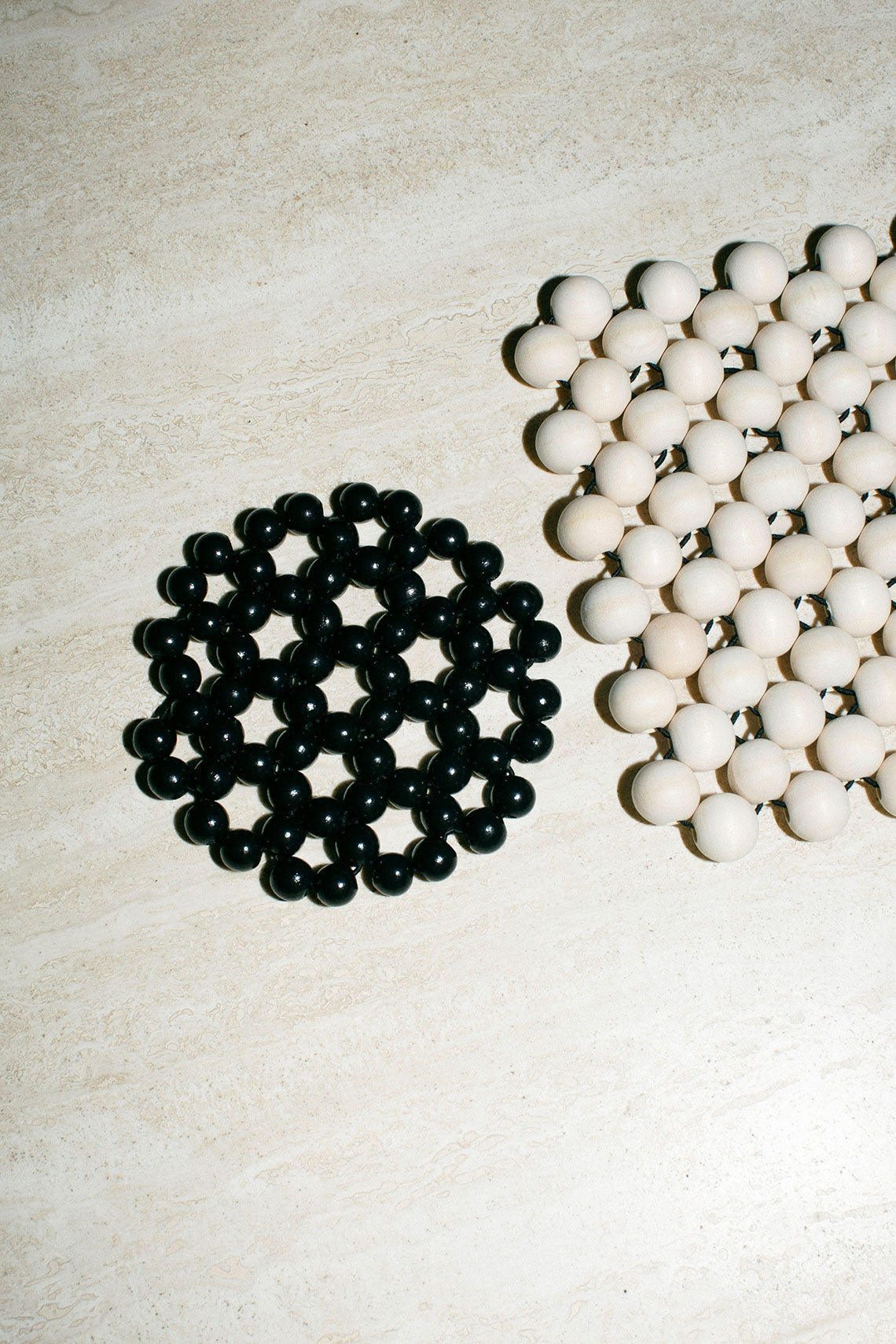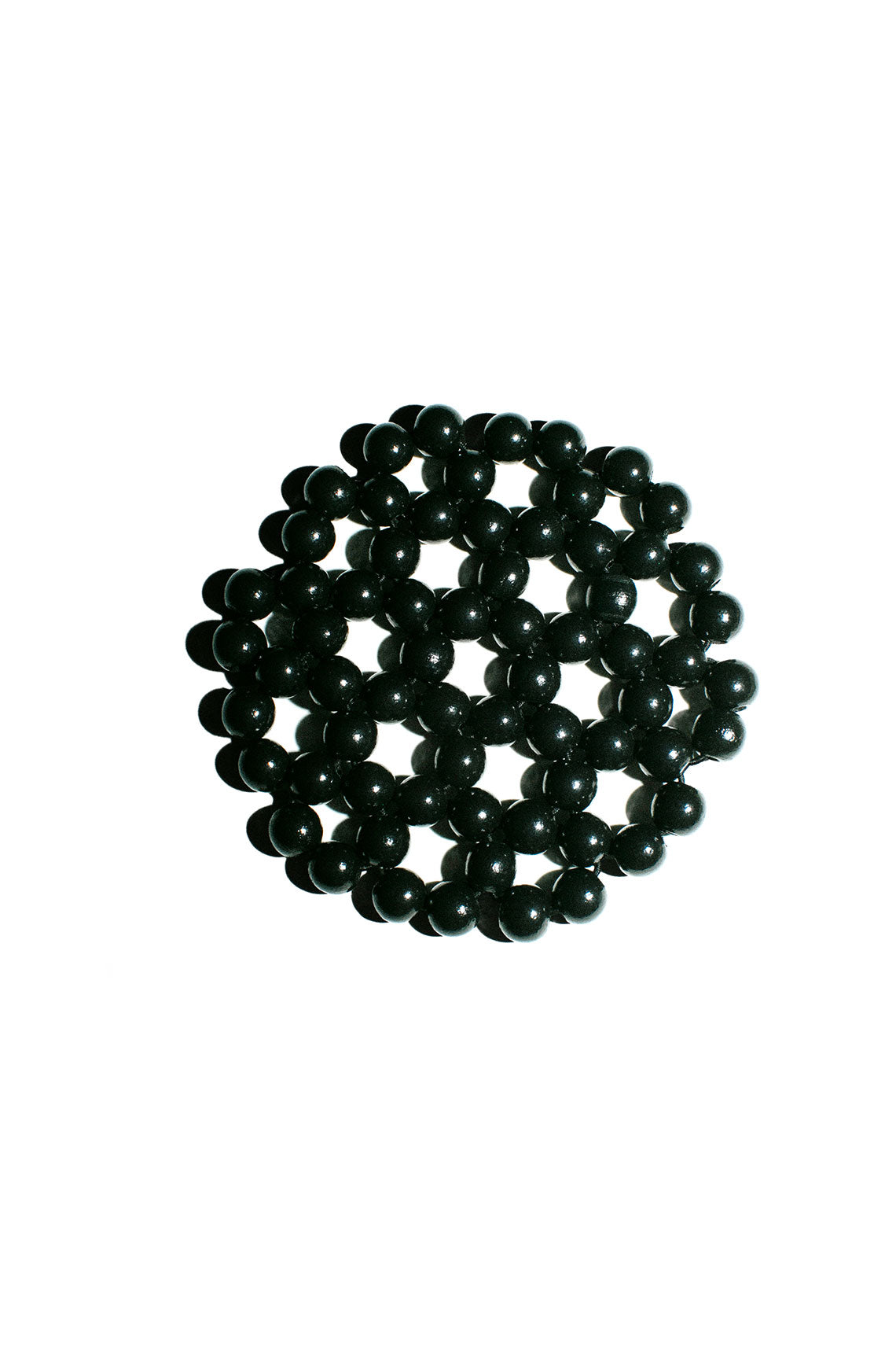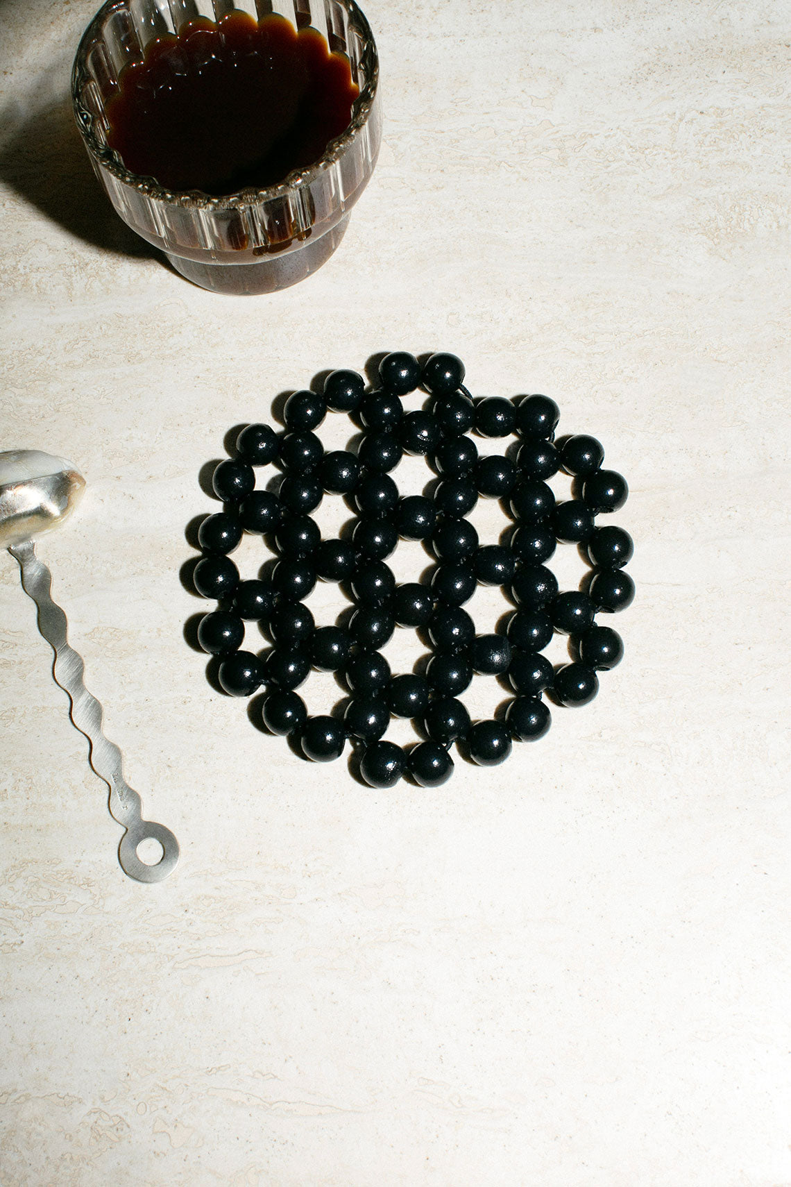 Round coaster made from black glossy wooden beads and black elastic cord. Handmade in the netherlands. Heat resistant. Measures: 4.7", bead size 12mm.