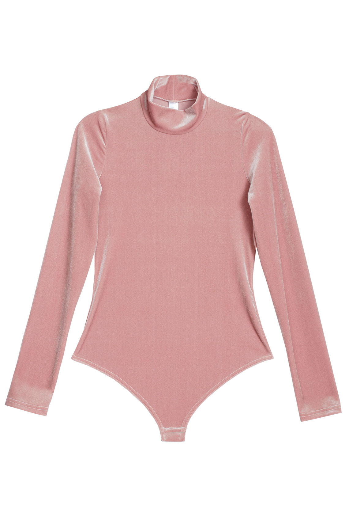 Long-sleeved stretch velvet bodysuit with two snaps at crotch and a mock neck. Fabric is 90% polyester, 10% elastane.