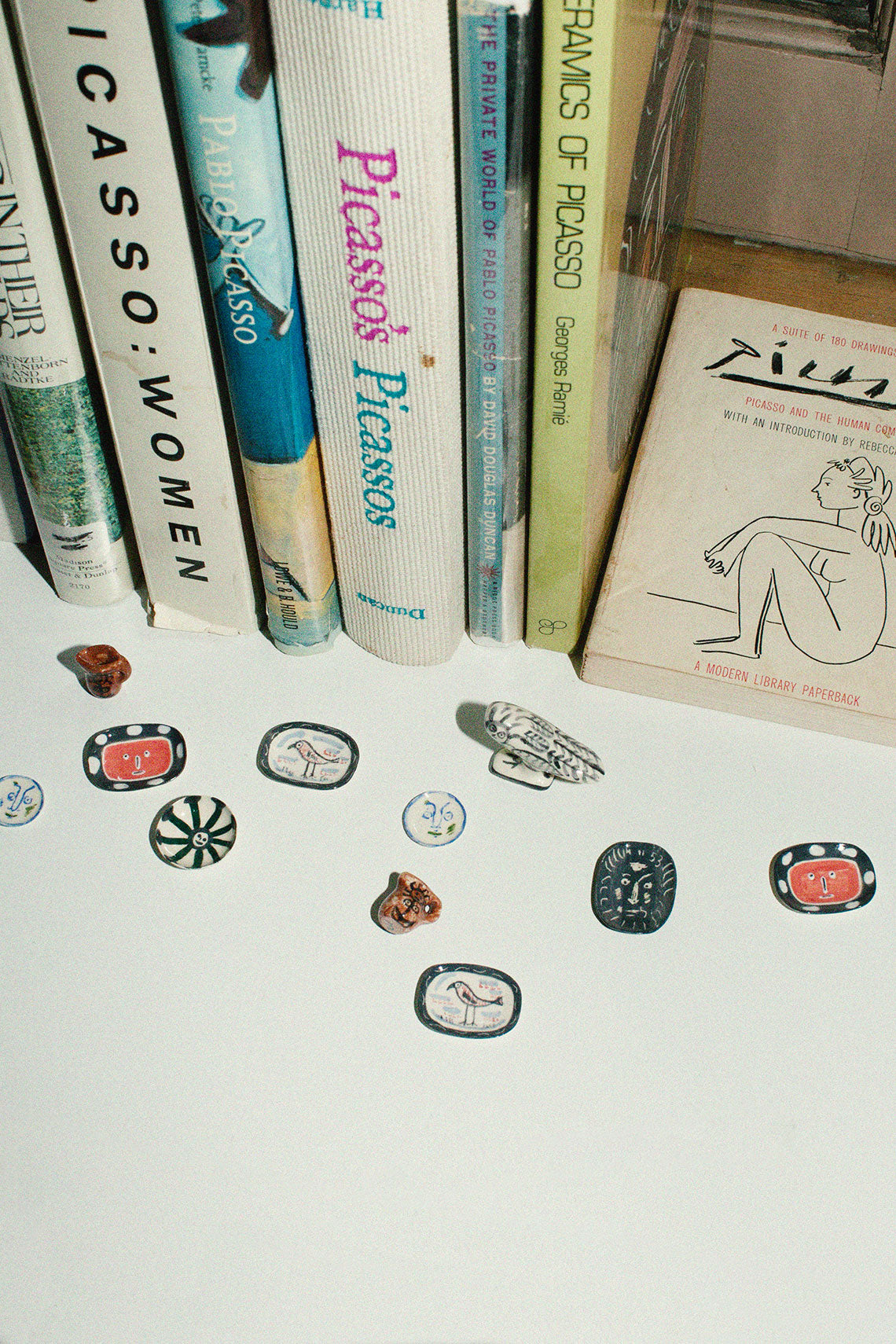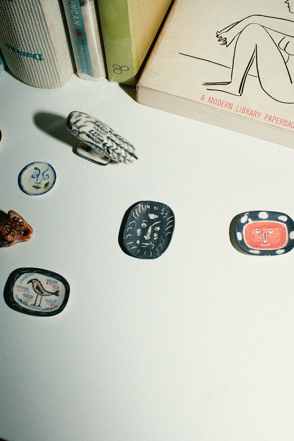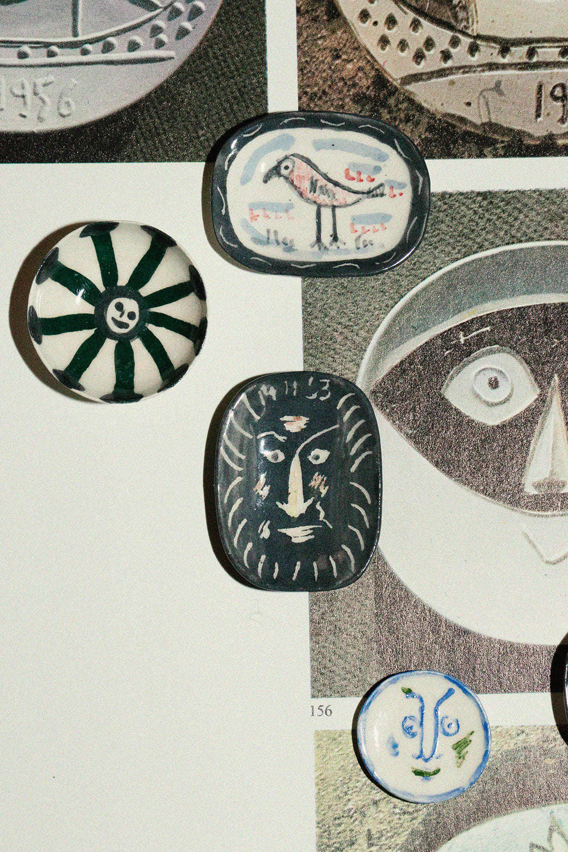 Tiny Picasso-inspired ceramic platter with black & white face. All items are handmade from start to finish, using clay, underglaze paint, several glazes, china paint. Measures 1" by 1 1/4".  Very fragile.