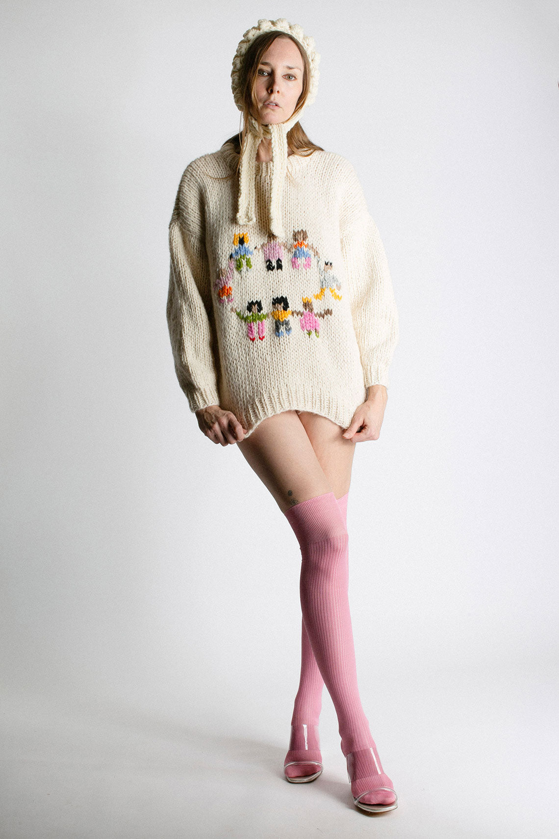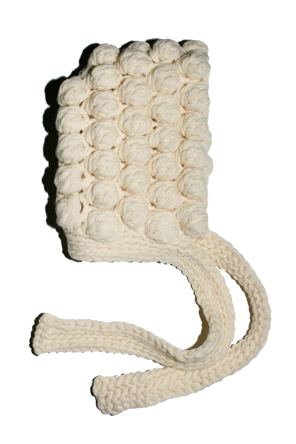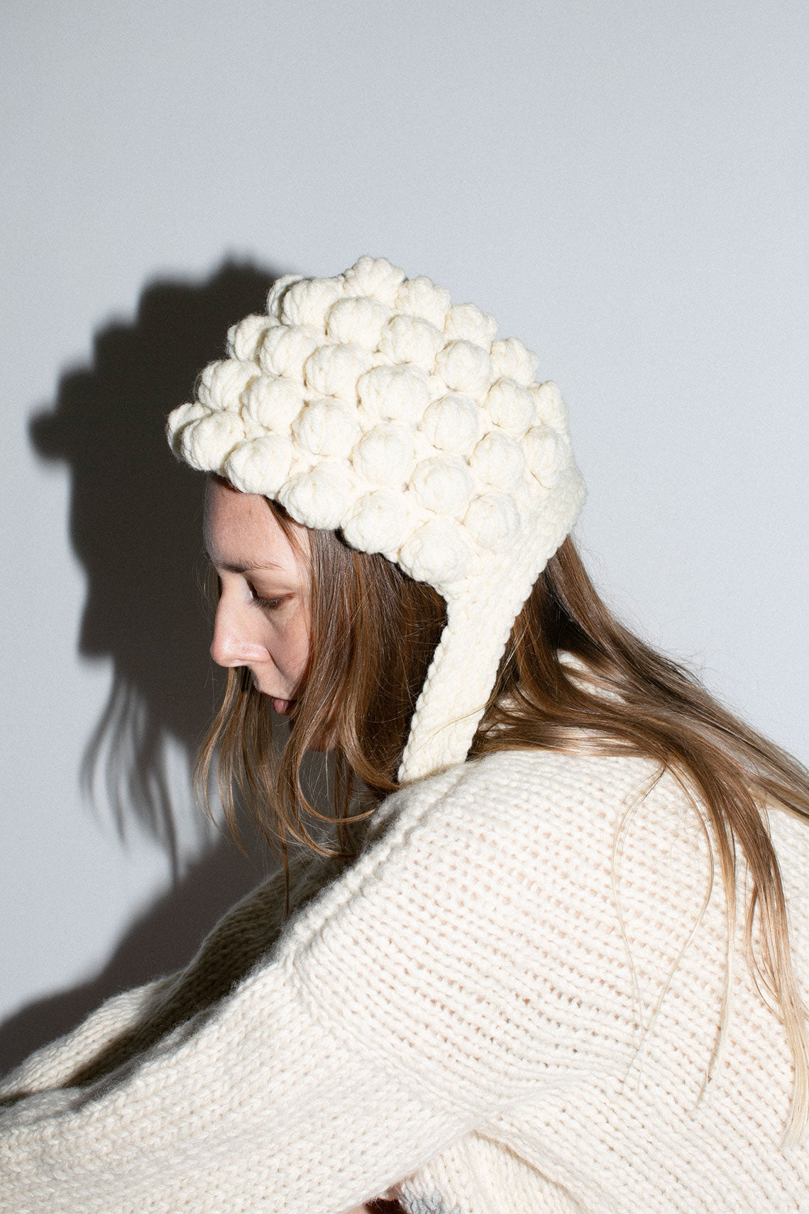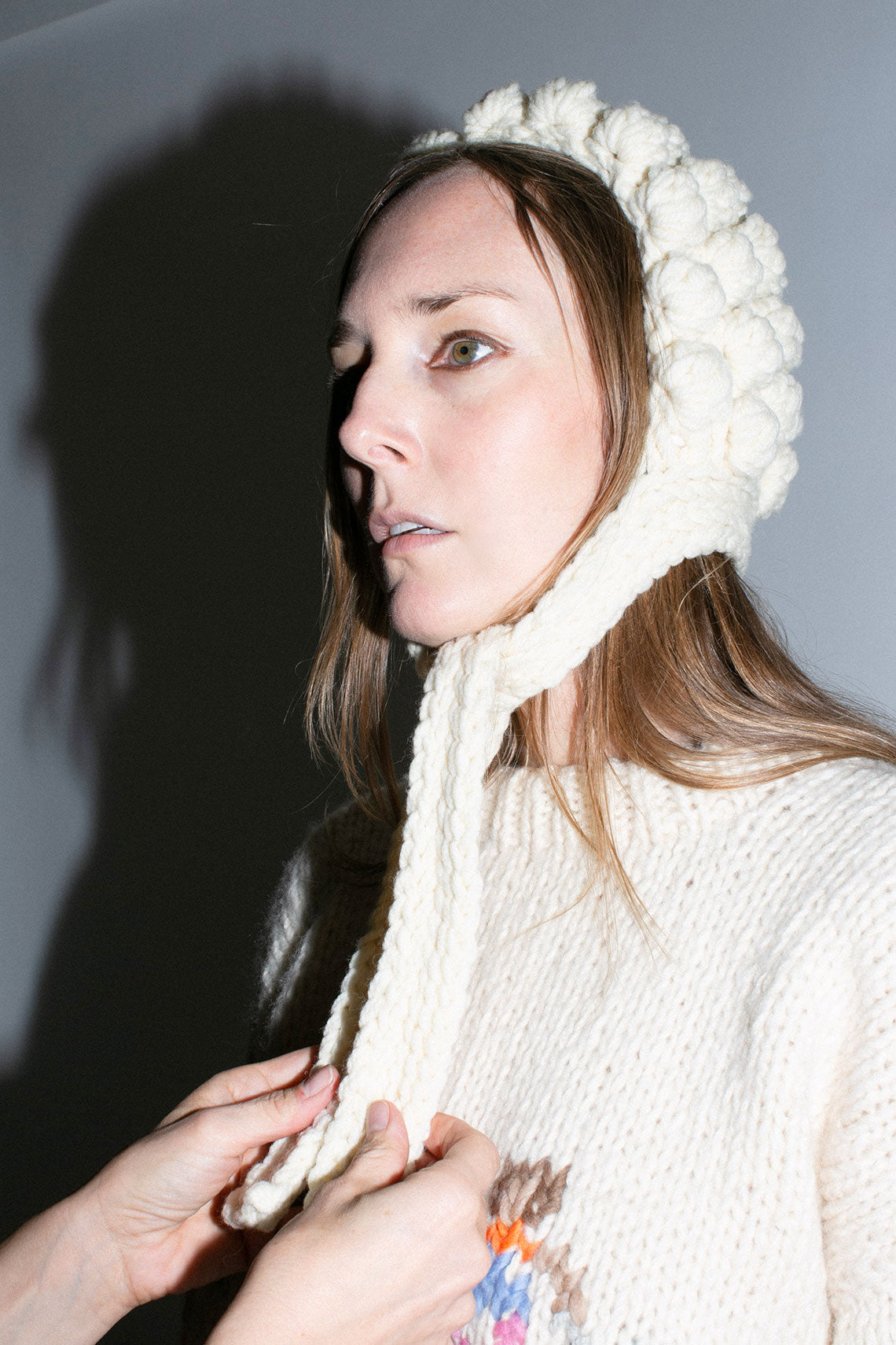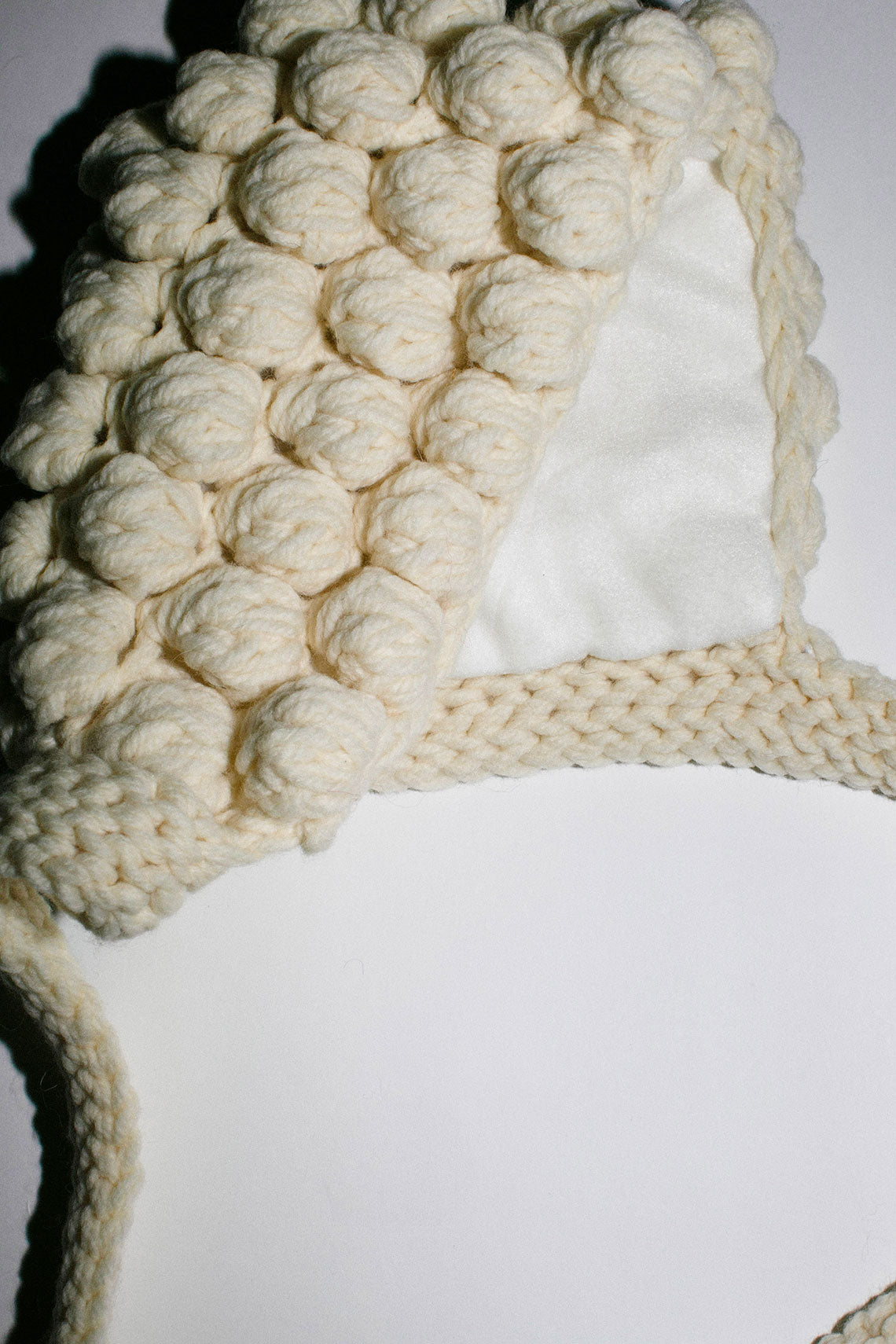 Hand-knit bonnet with ties. Fabric is 100% wool, lining 100% polyester. Hand wash at 30°C and dry flat, or dry clean only.