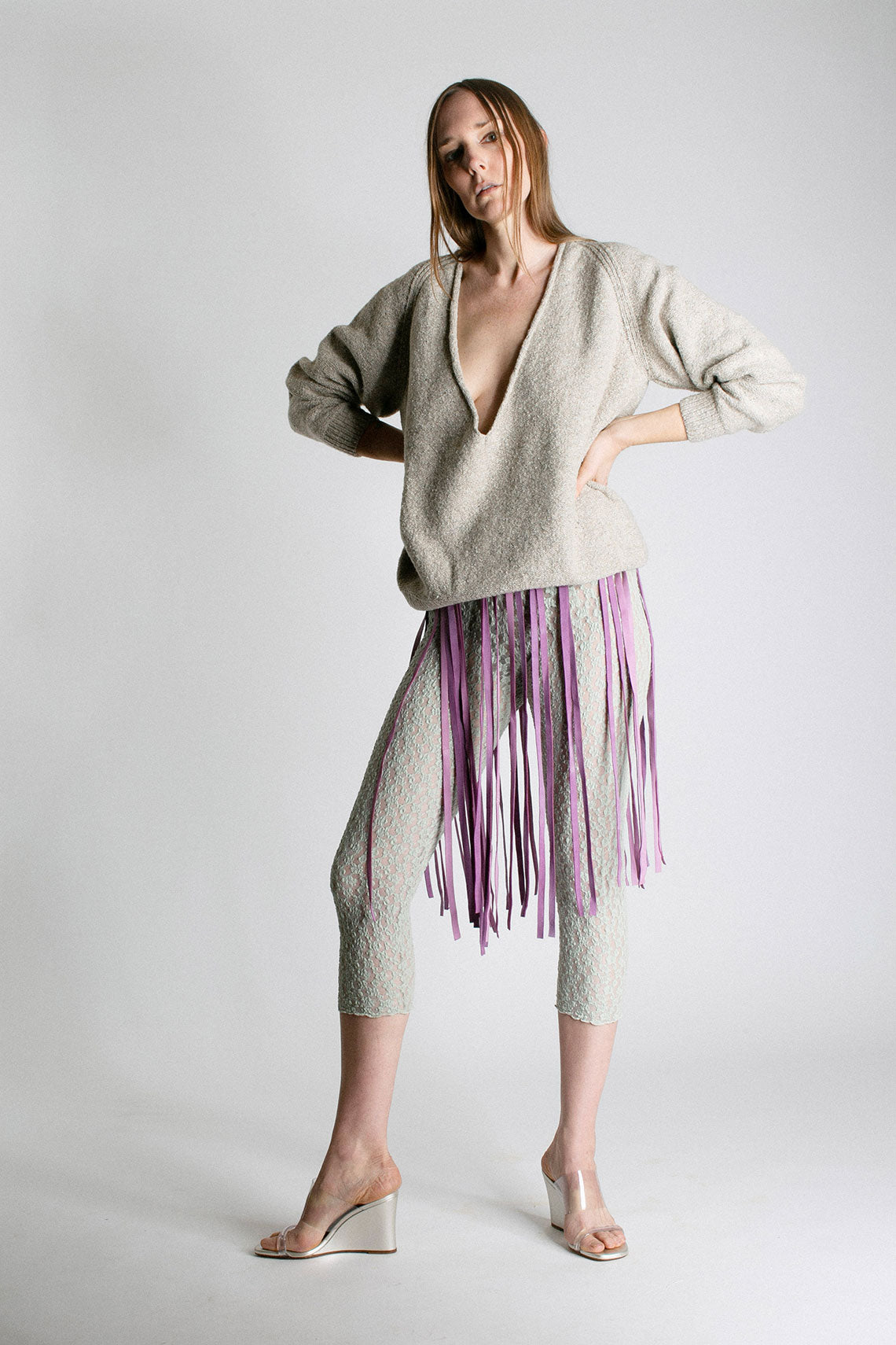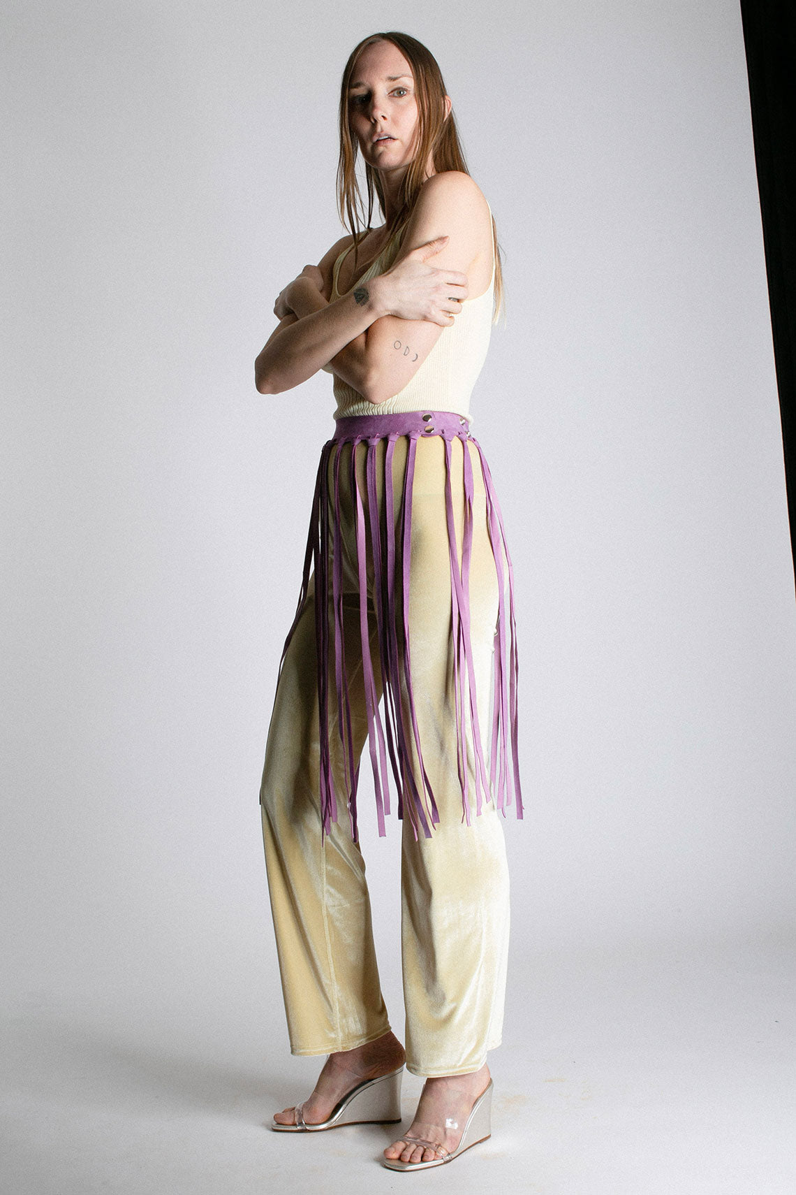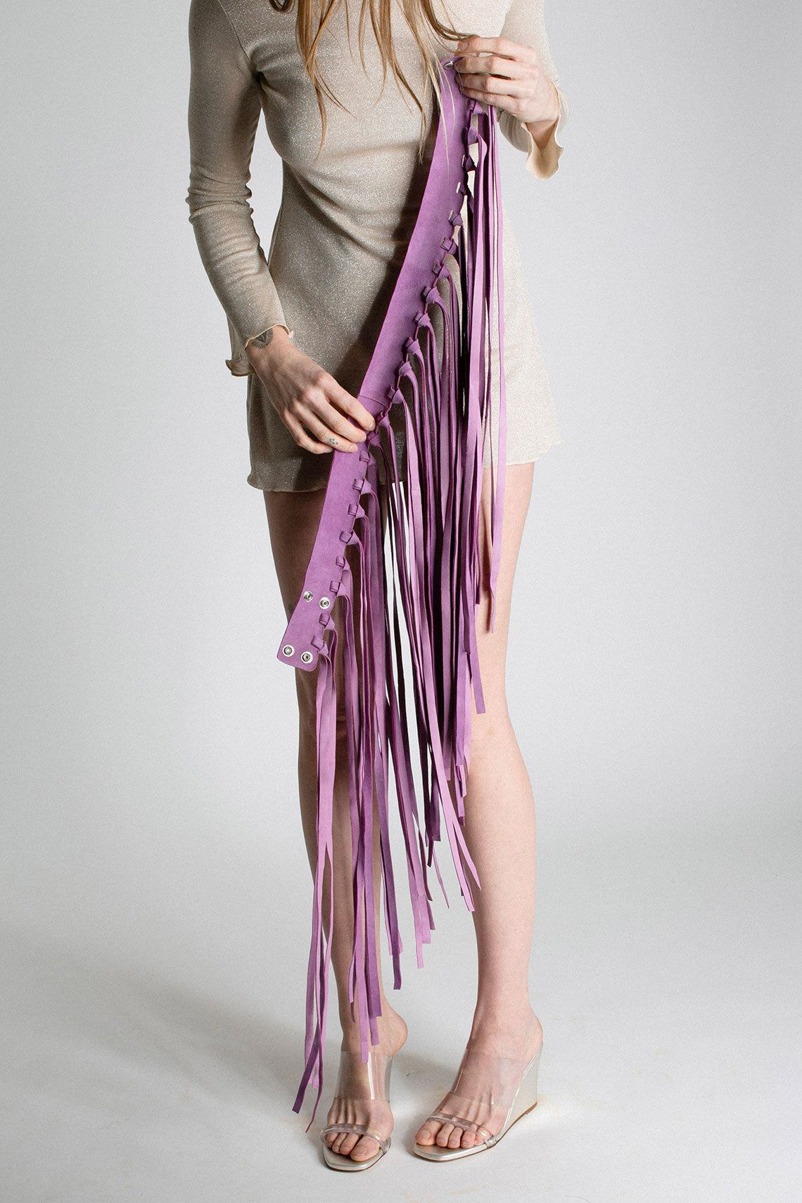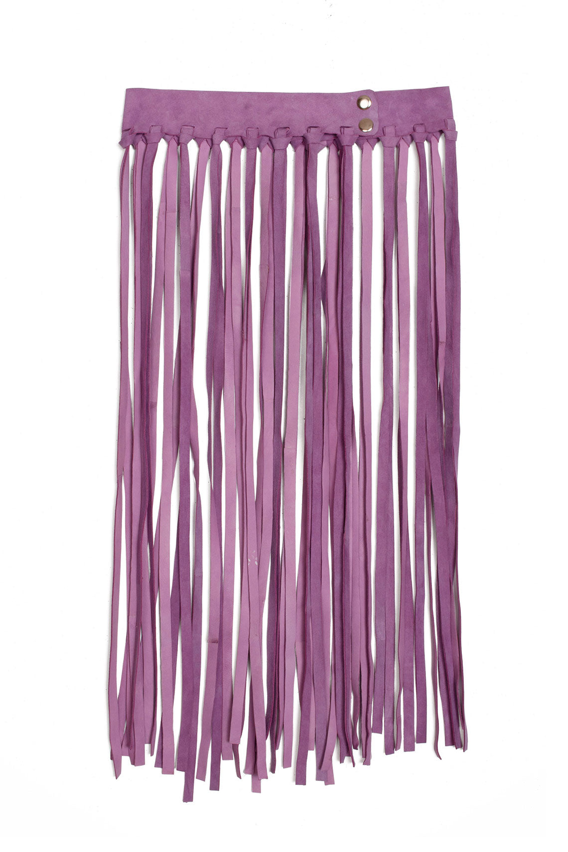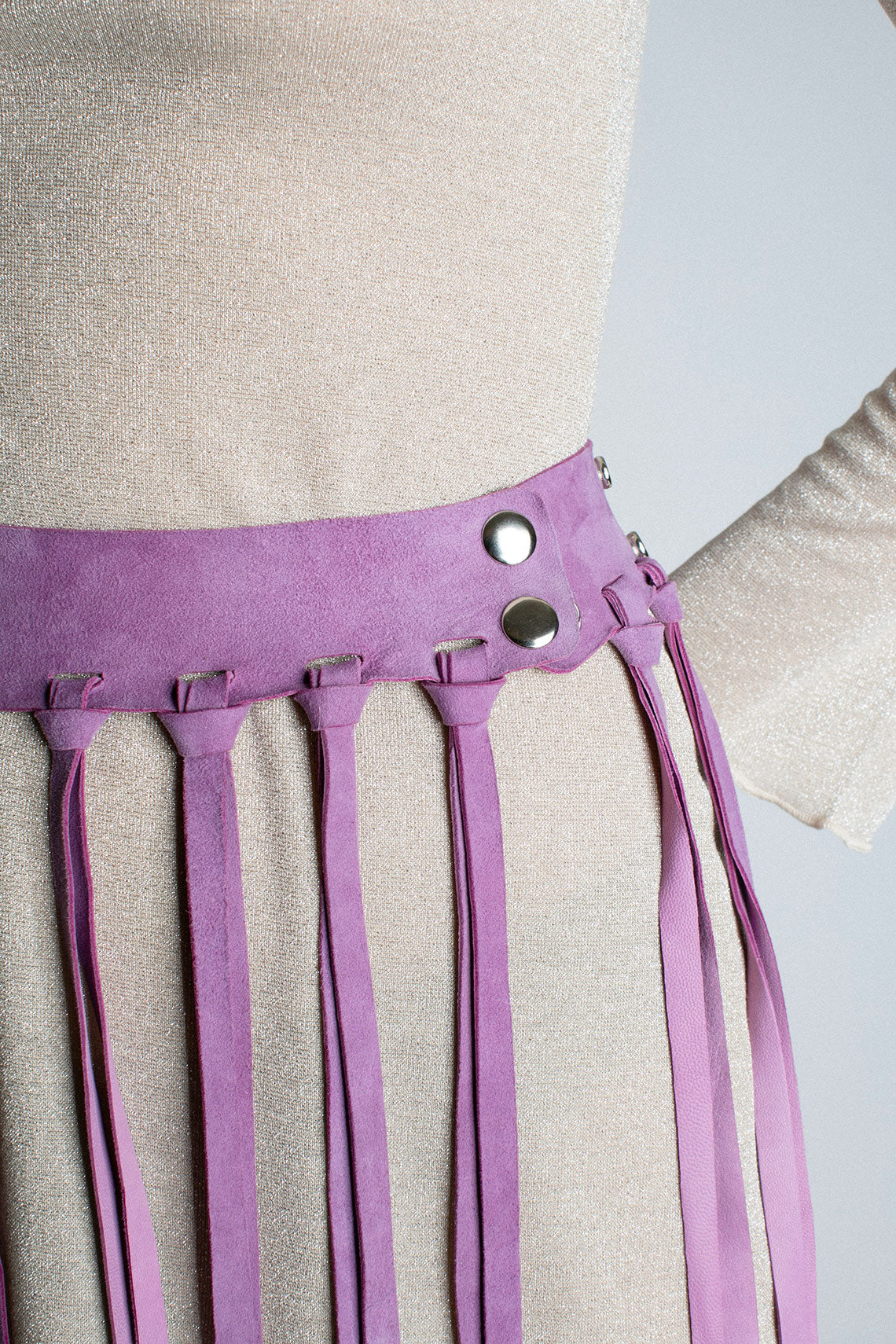 Soft lavender suede fringe belt with silver snaps. Hits at knee or just above. Fabric is 100% leather.