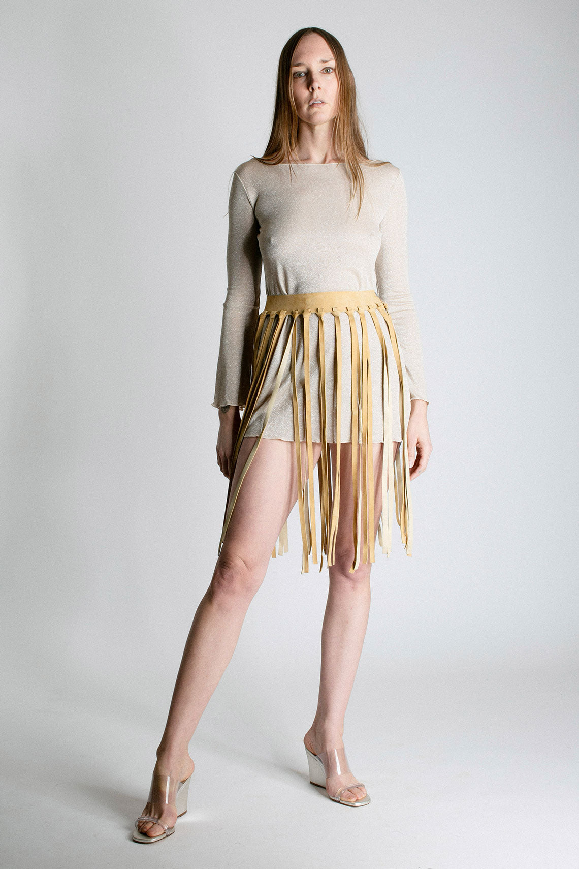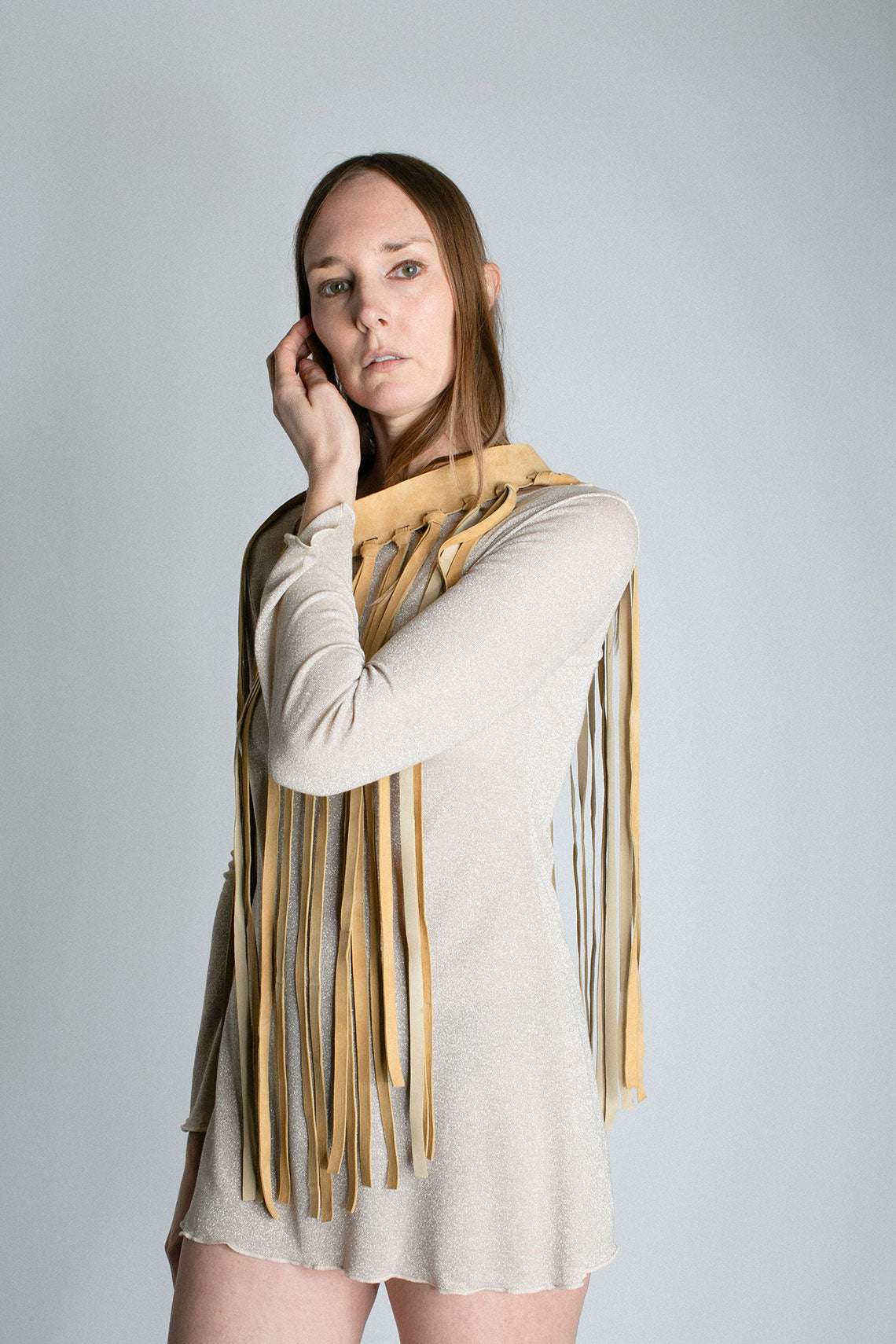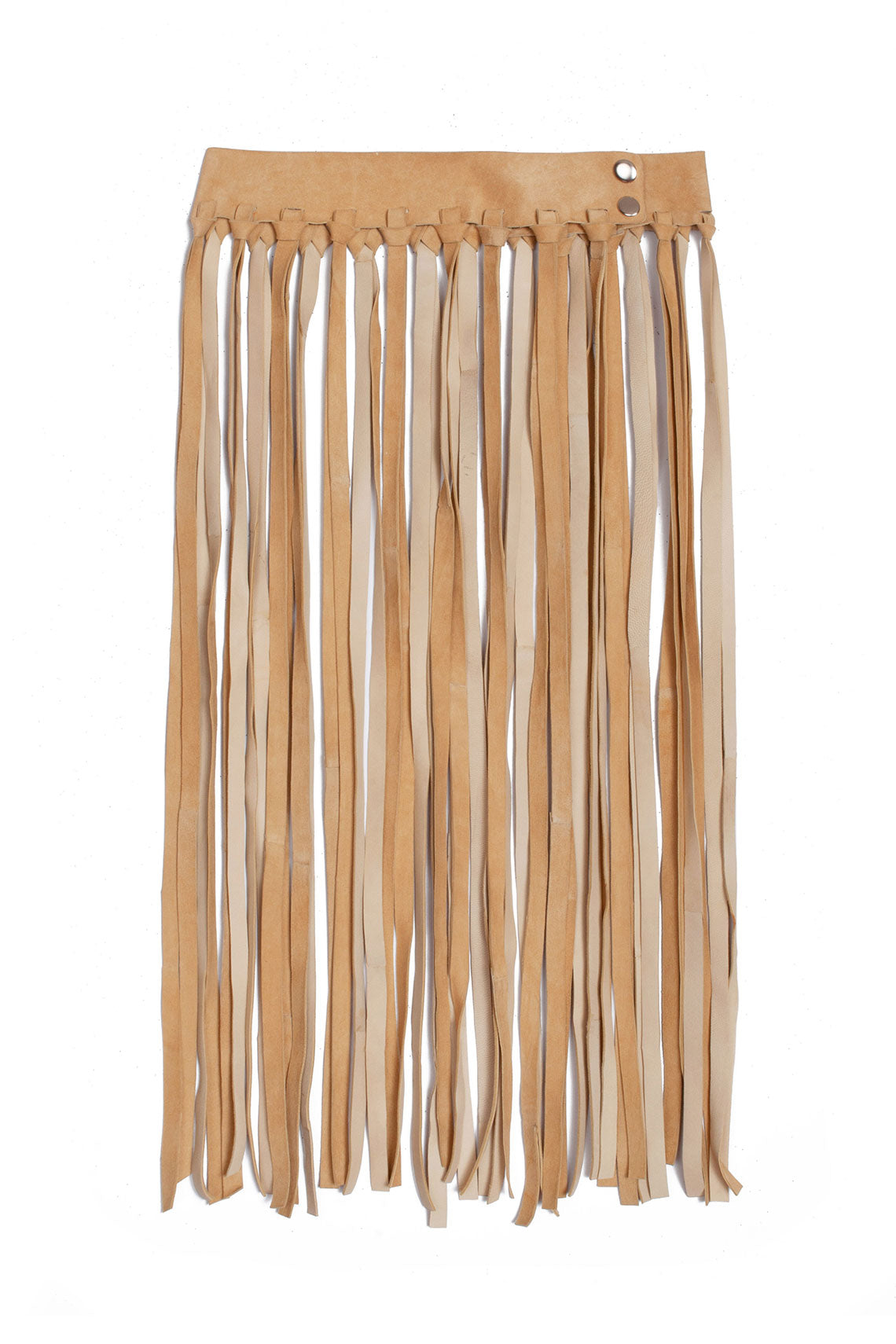Soft tan suede fringe belt with silver snaps. Hits at knee or just above. Fabric is 100% leather.