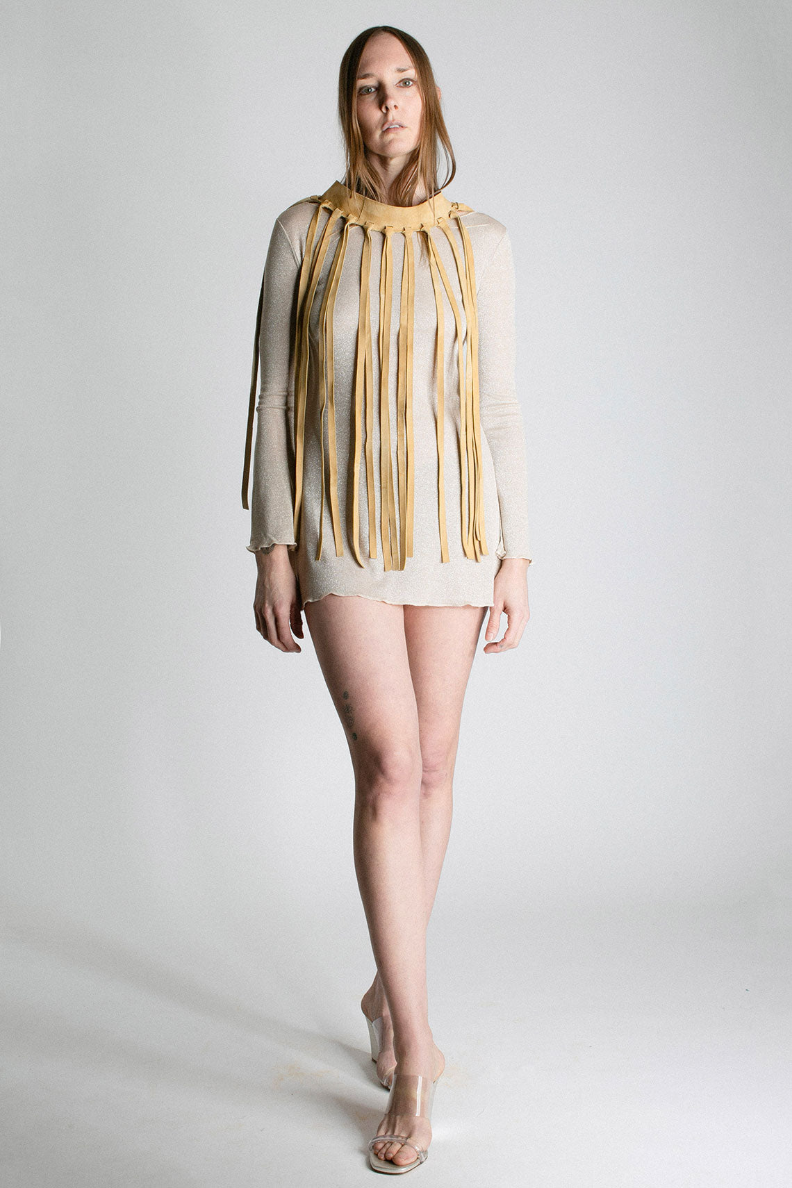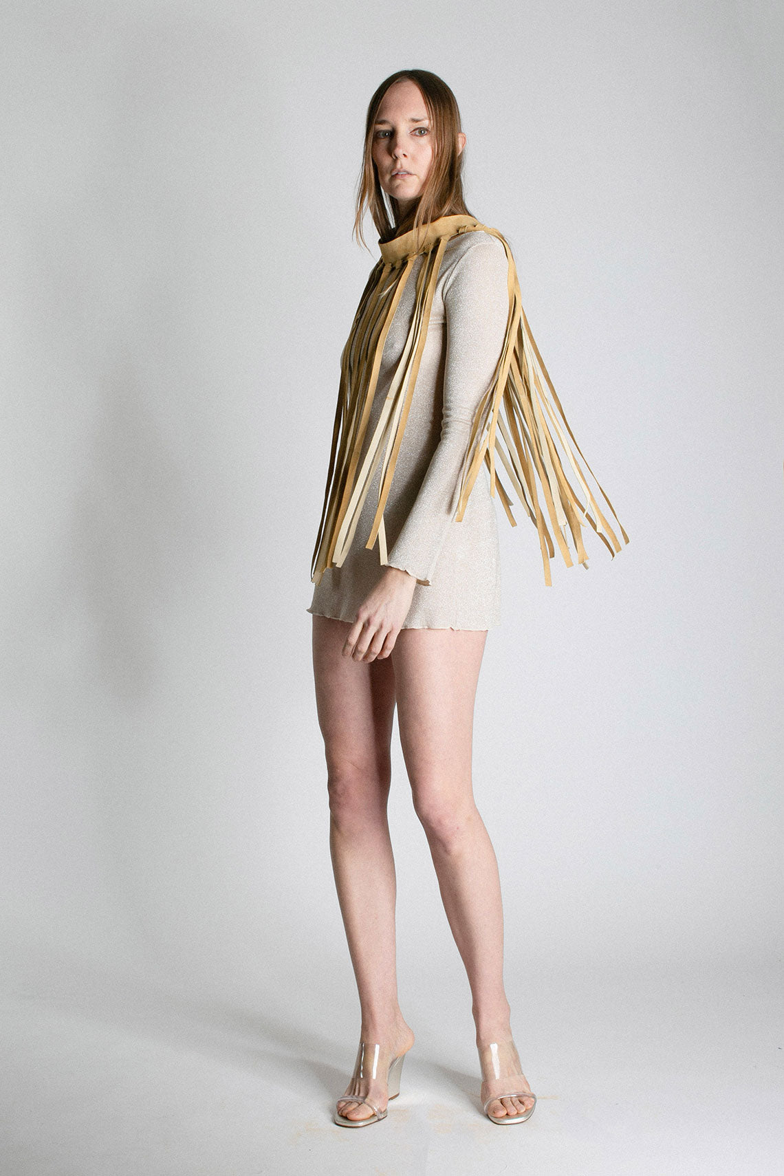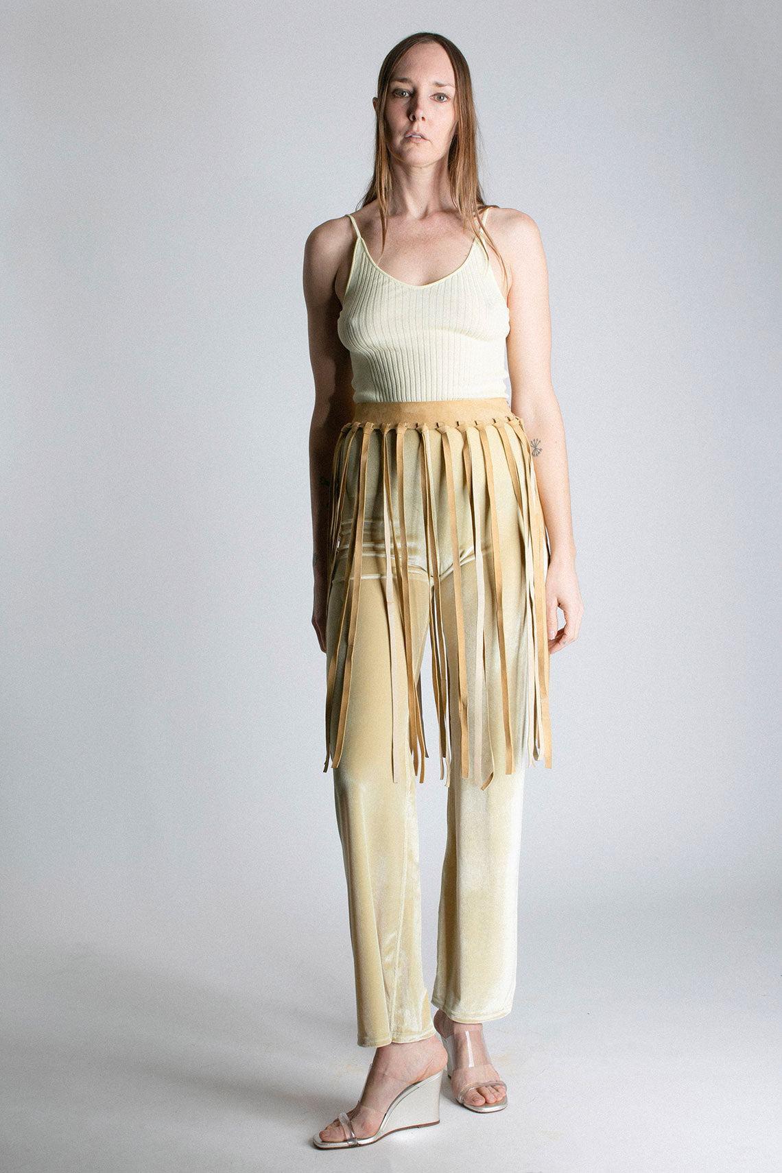 Soft tan suede fringe belt with silver snaps. Hits at knee or just above. Fabric is 100% leather.