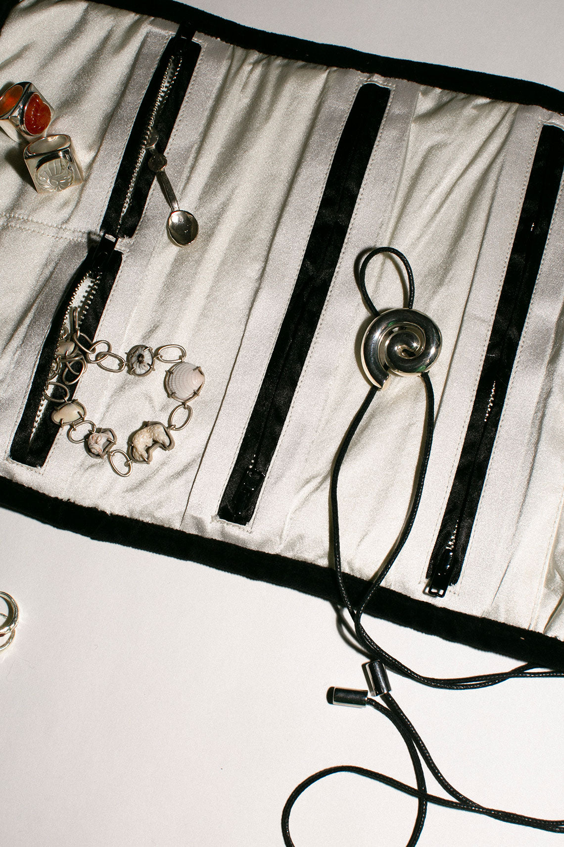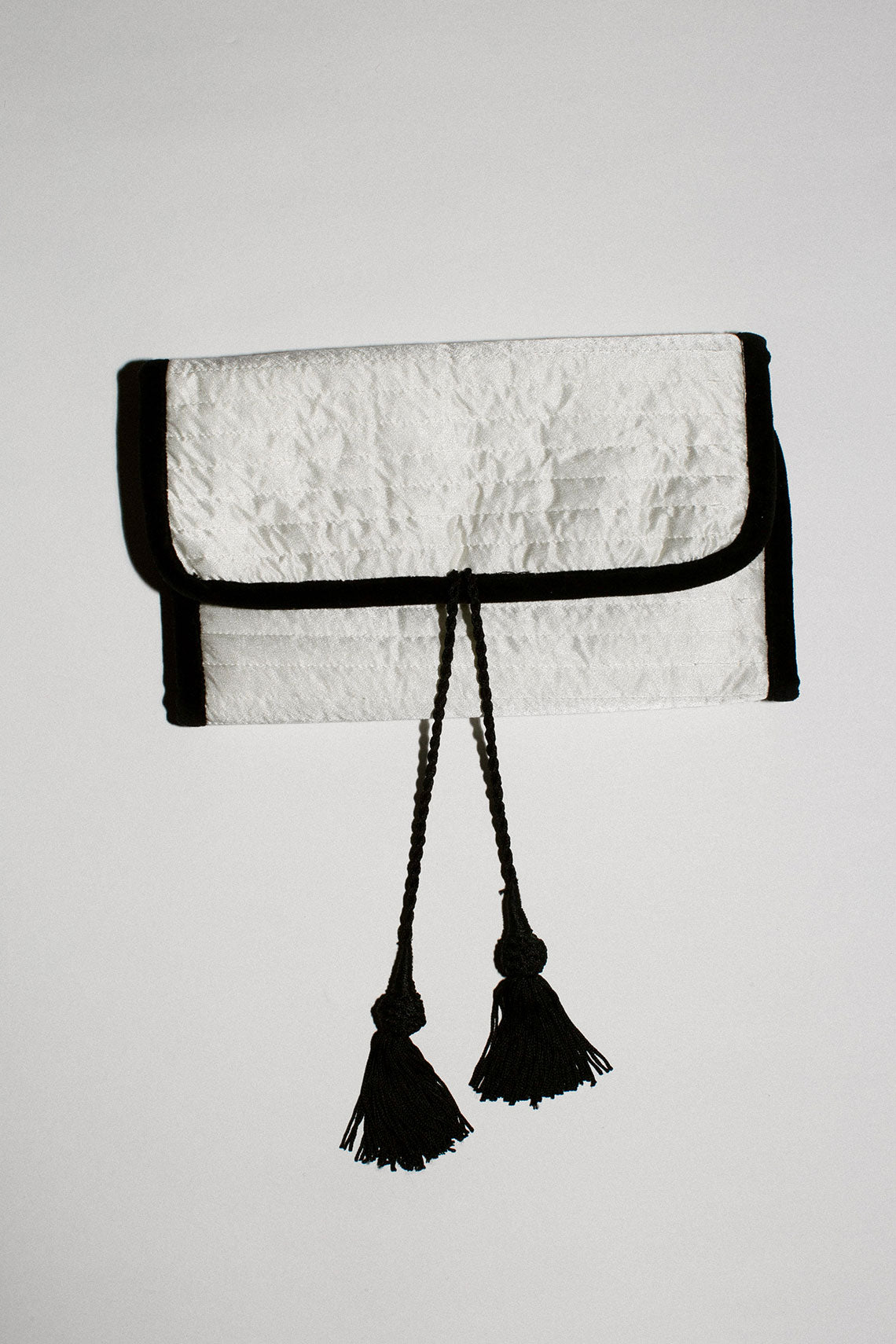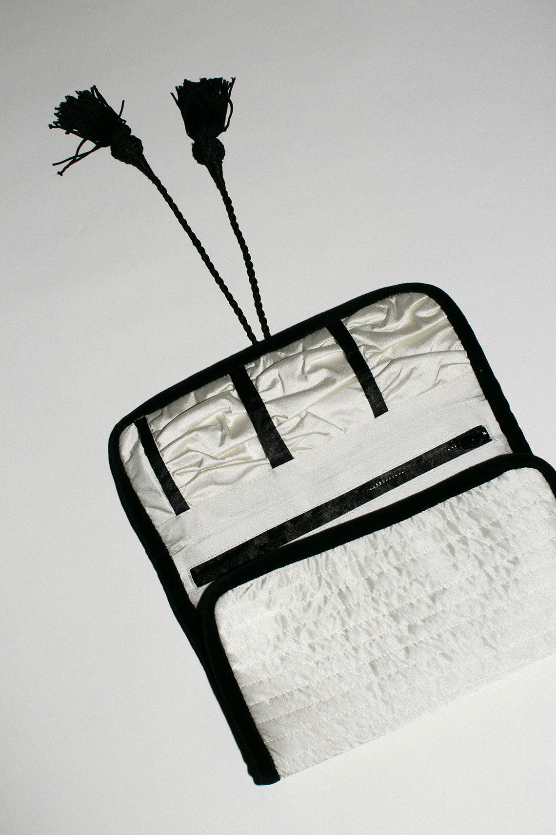 Silk satin and velvet rolled jewelry holder with rope and tassel wrap closure. Four zipper pockets and three regular pockets. Lined.