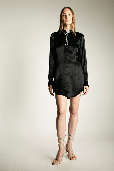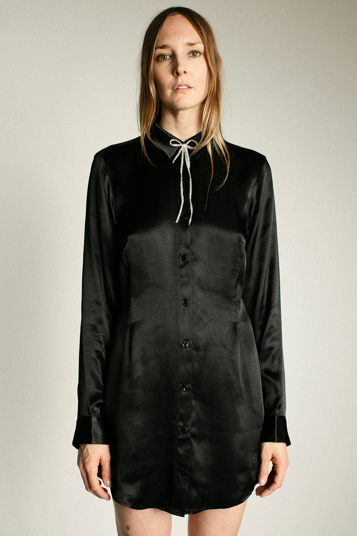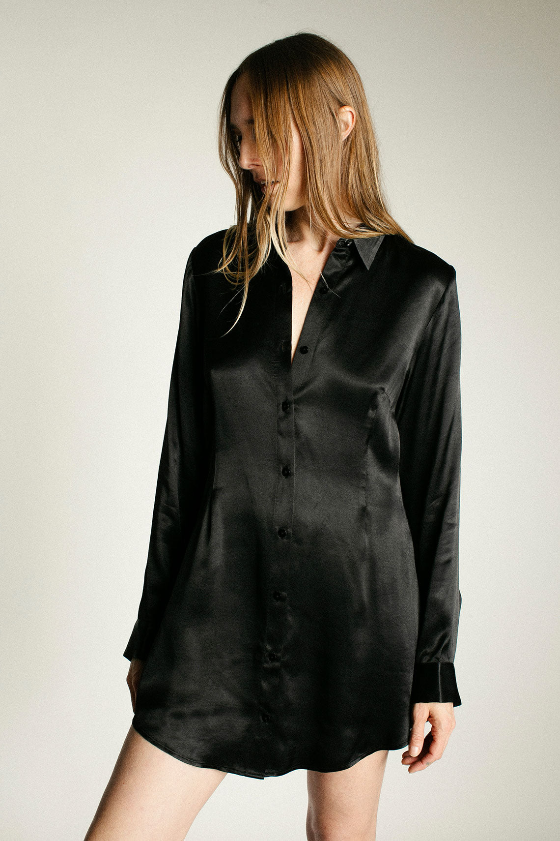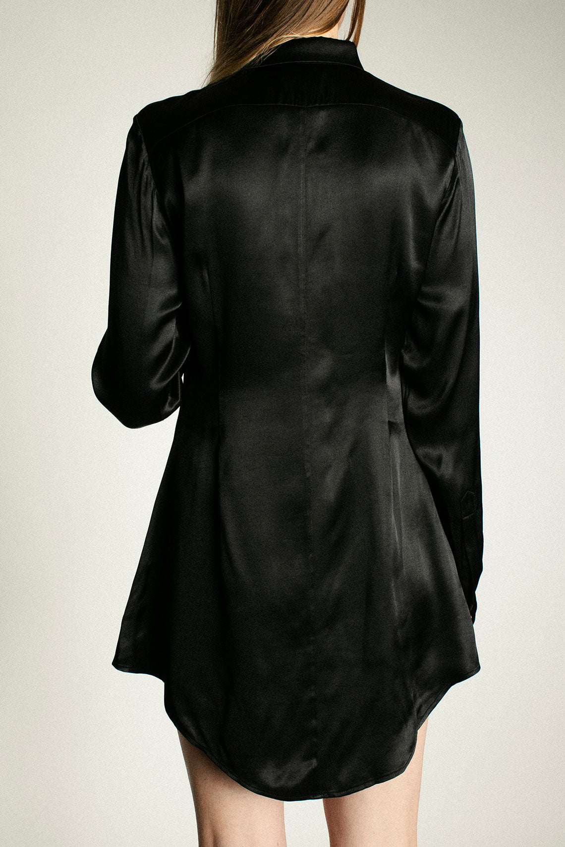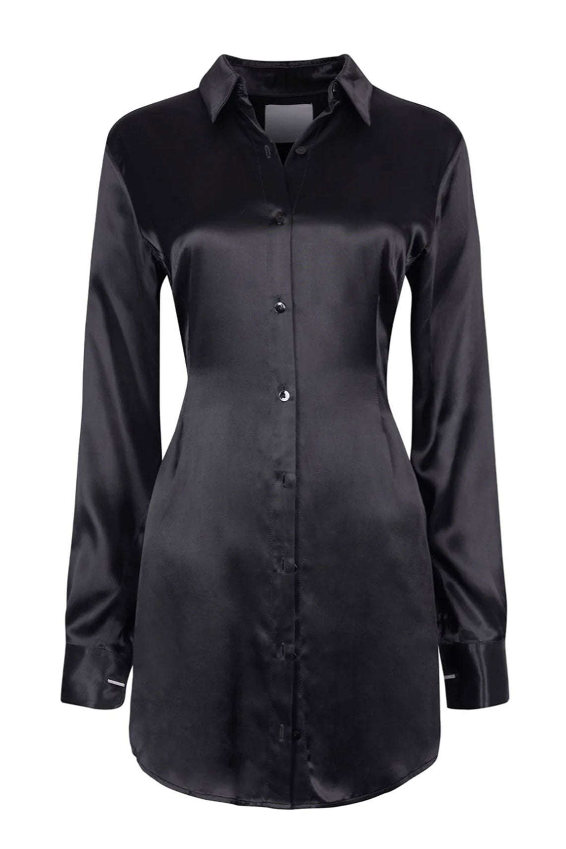Ballerina satin button up shirt dress. Slightly fitted with collar and silver hardware cufflinks. Fabric is 61% viscose,  39% rayon.