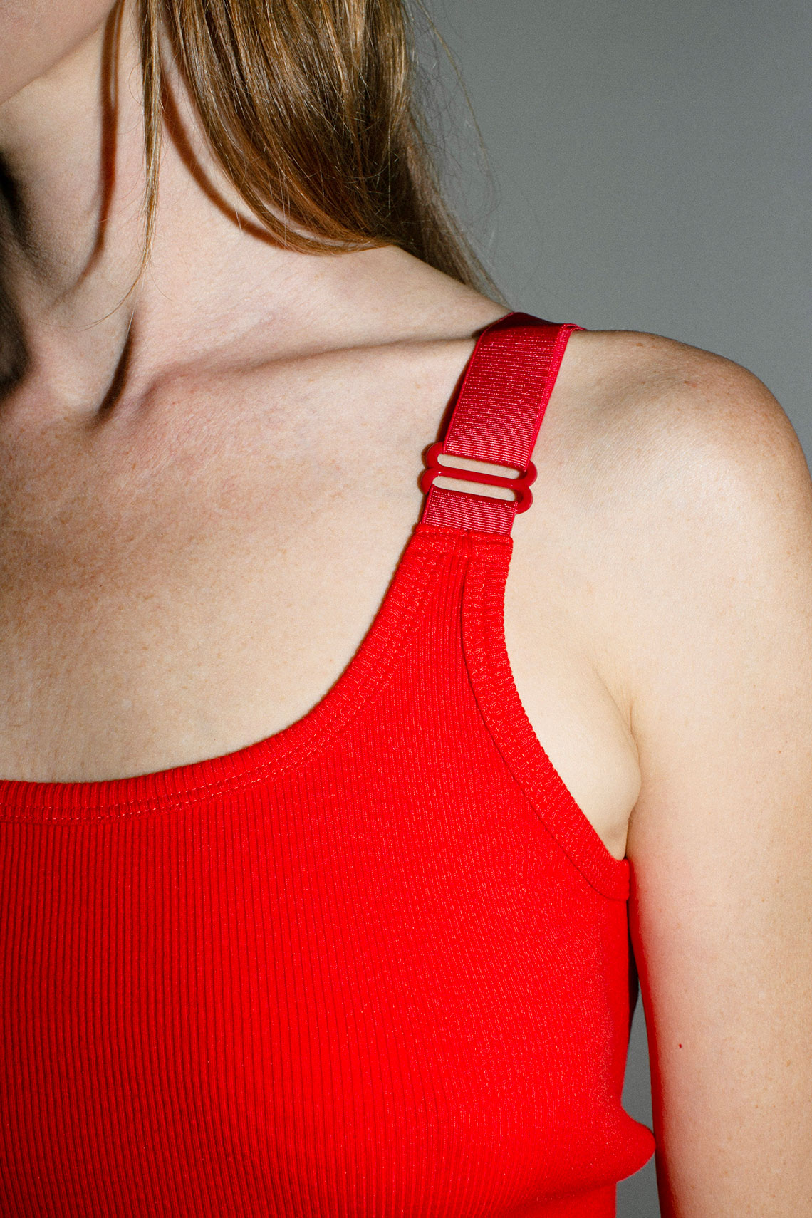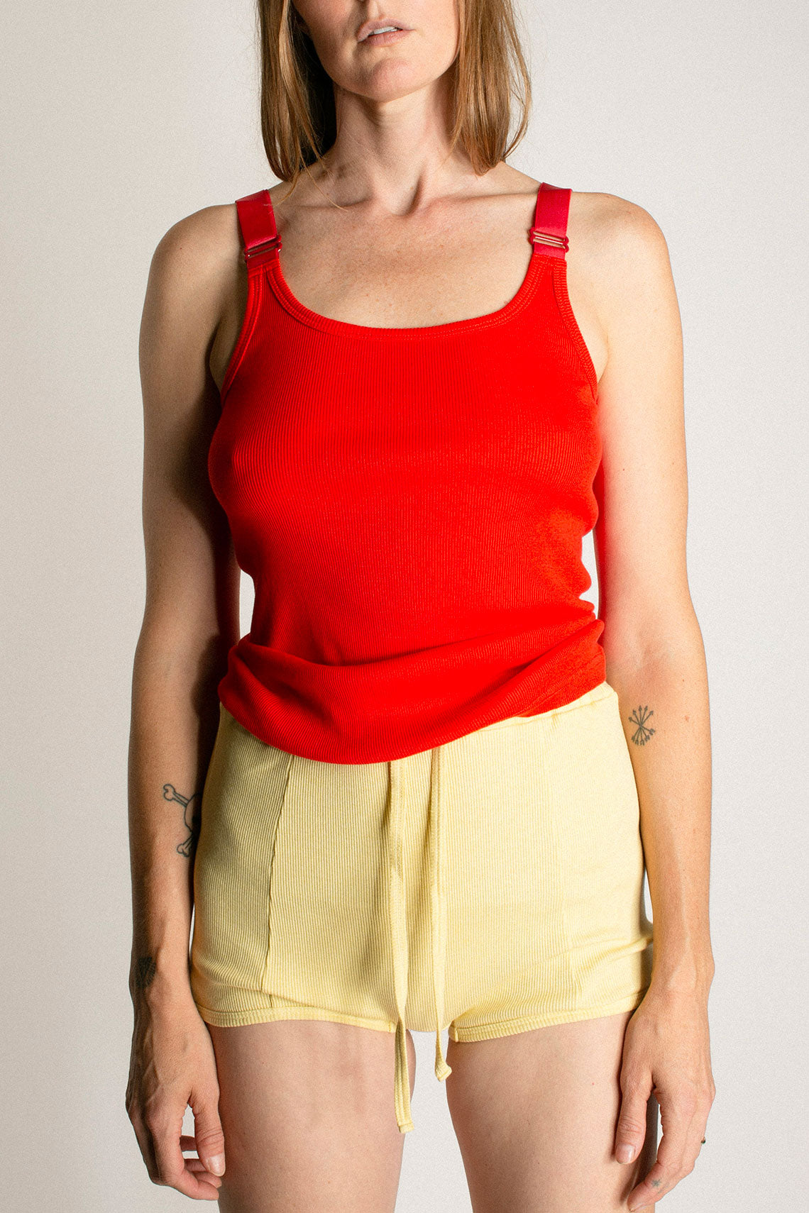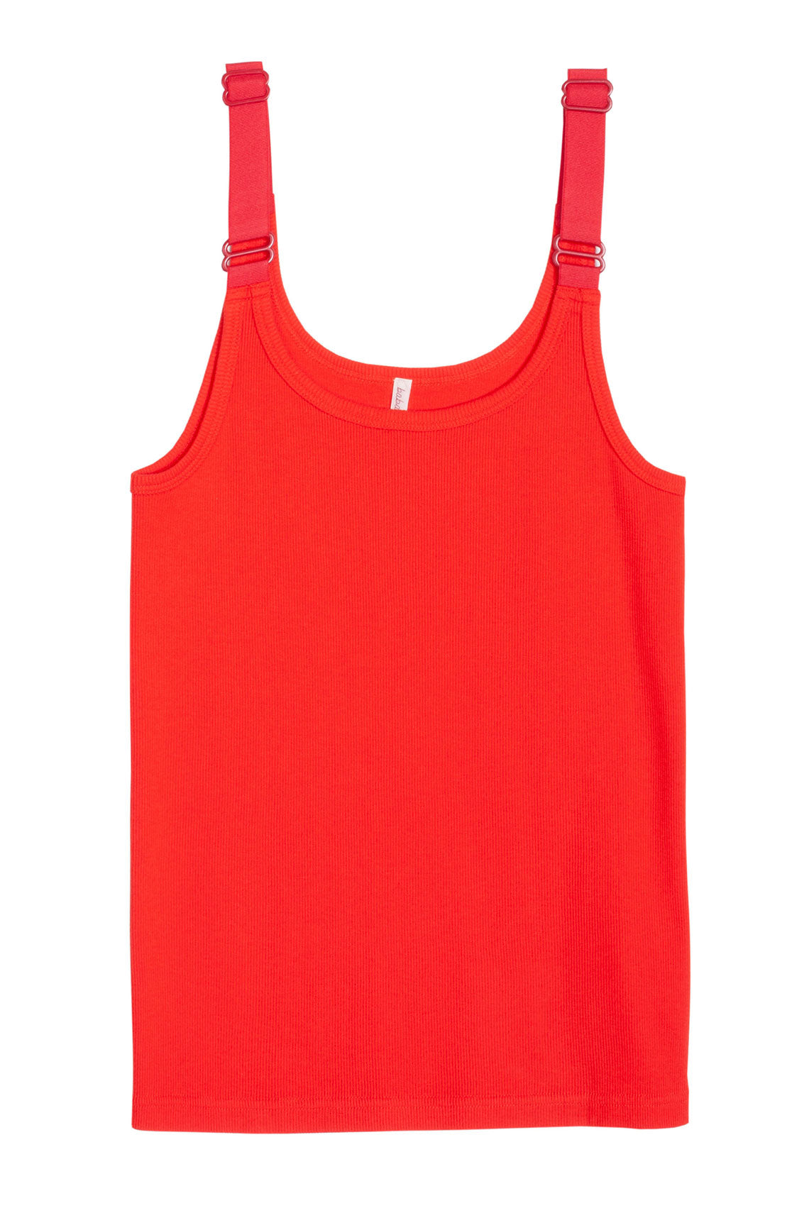 Fine ribbed tank in perfect poppy red. Adjustable straps with metal hardware. Fabric is 80% cotton, 20% silk.