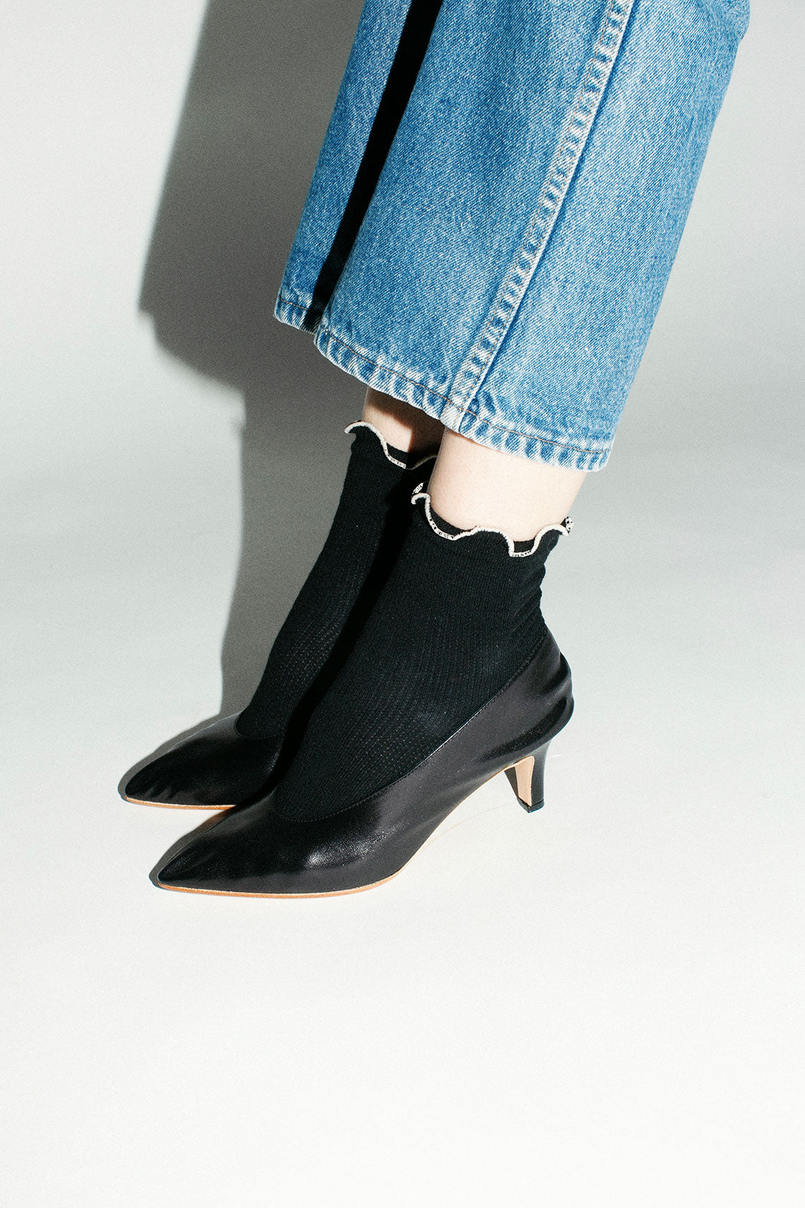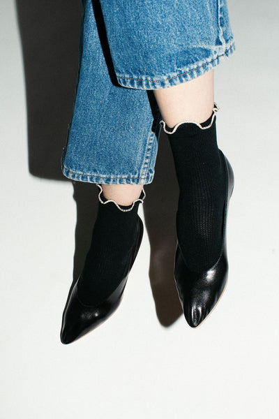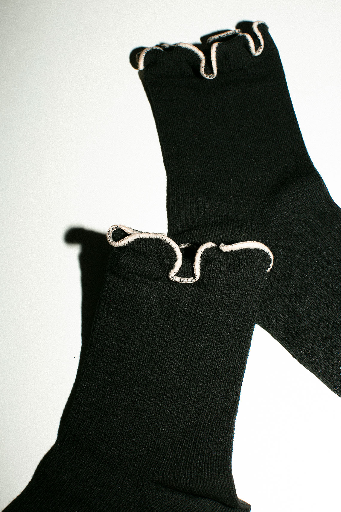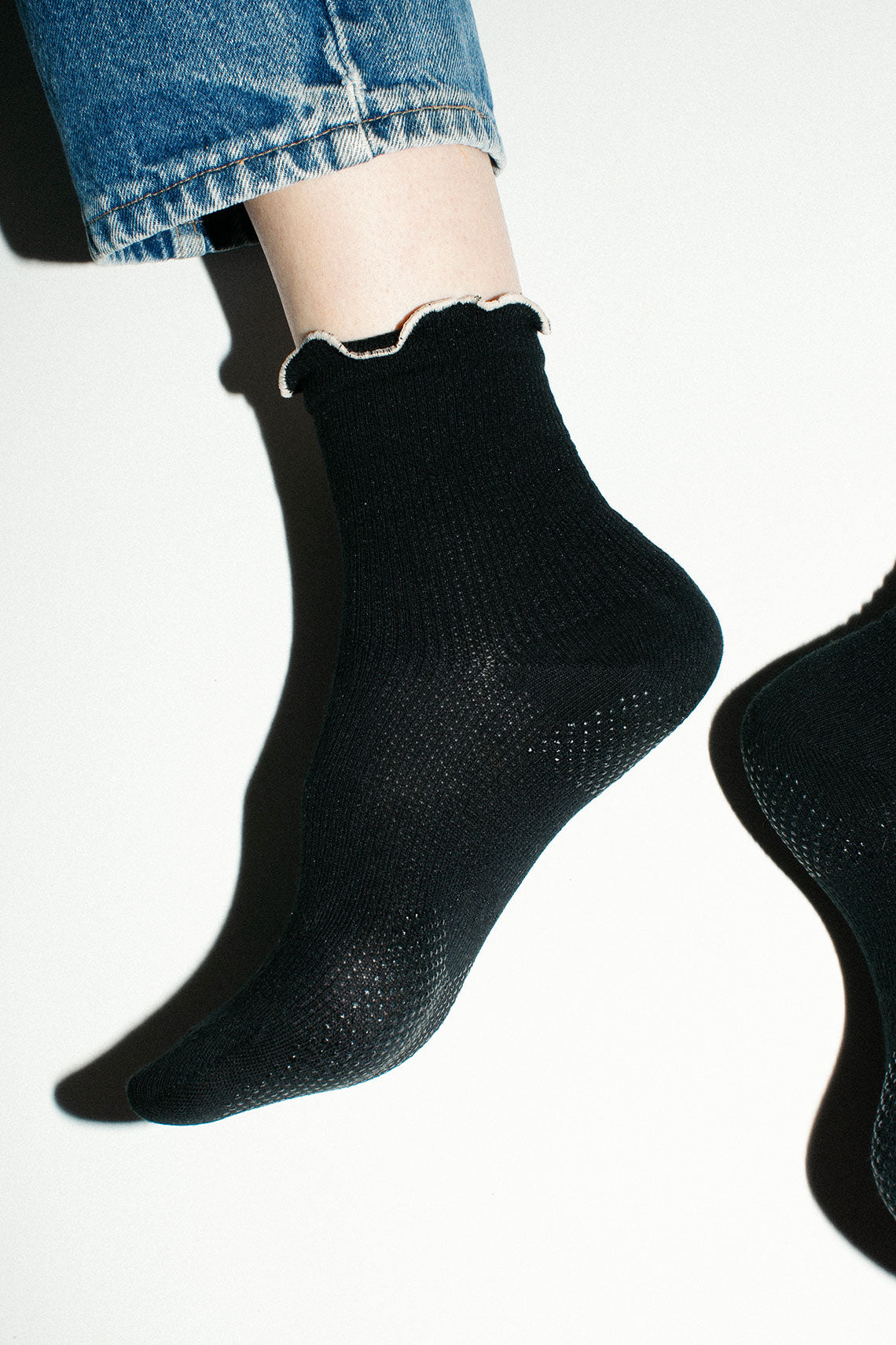 Thermal crew with the sweetest ruffle and sporty grip sole. Made in Japan from combed cotton with a plush terry foot for added cushion and comfort. Fabric is 52% cotton 25% nylon 22% acrylic 1% polyurethane.