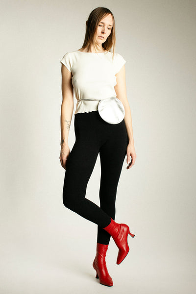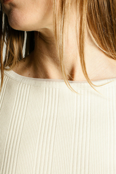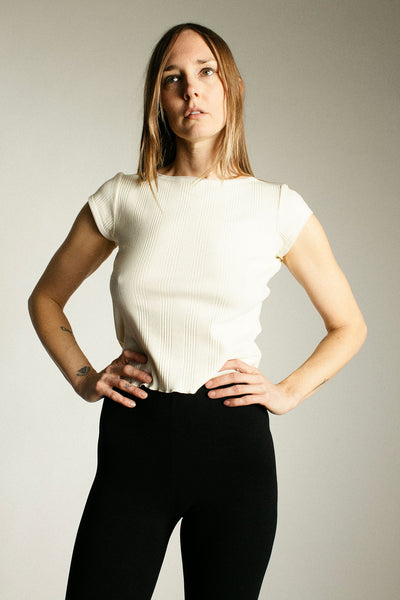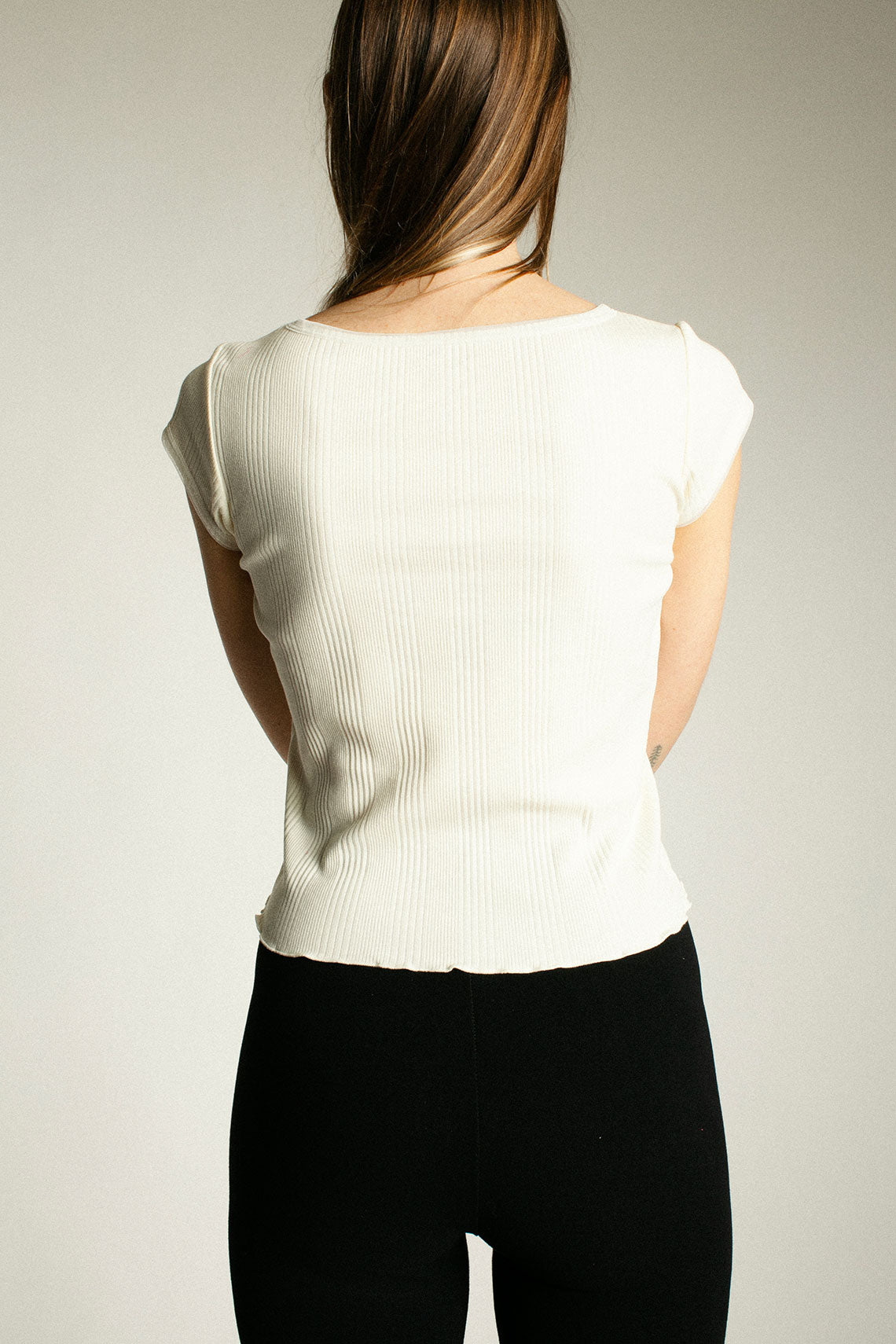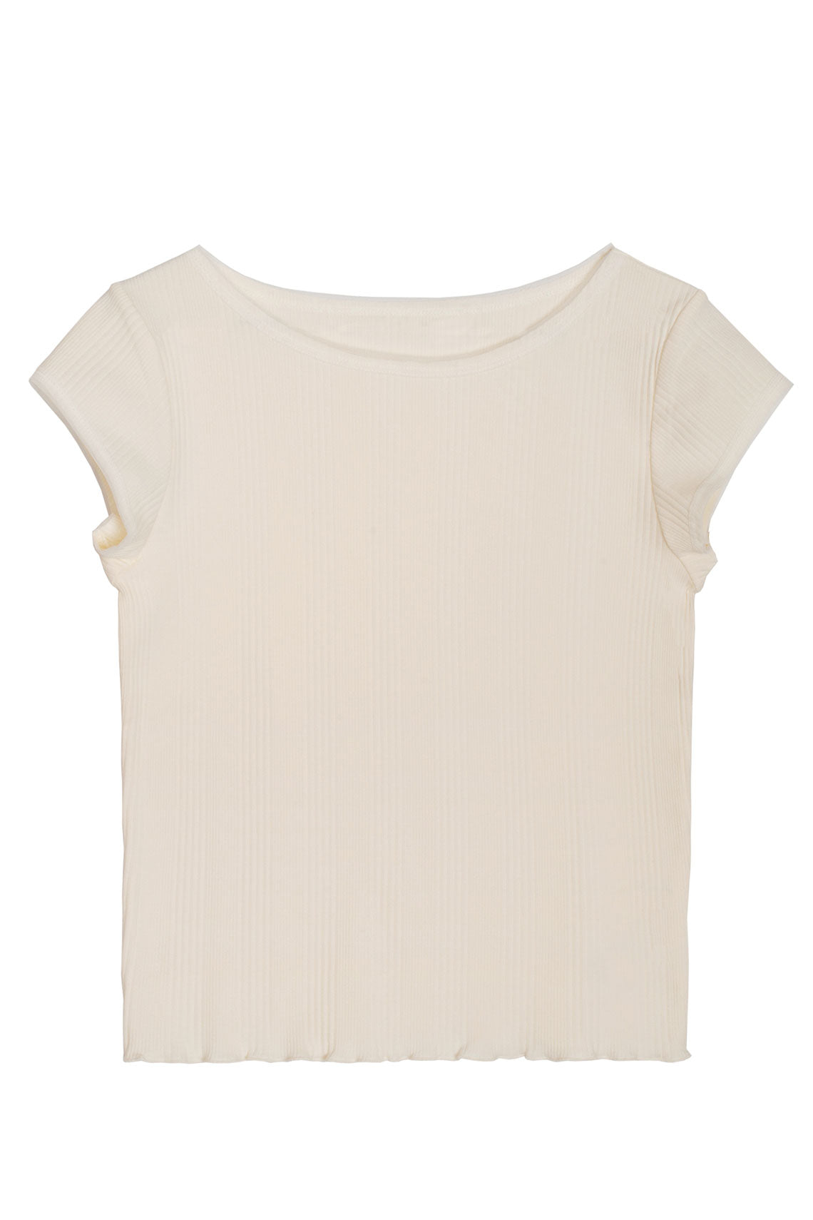 Rib knit tee with cap sleeves and white elastic neckline. Fabric is