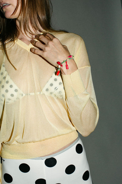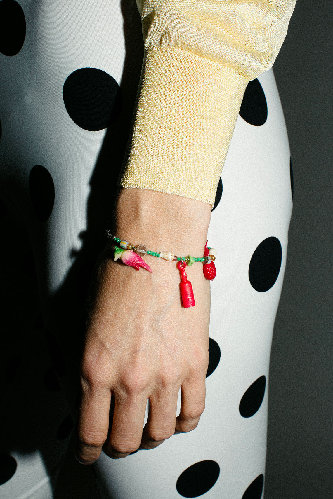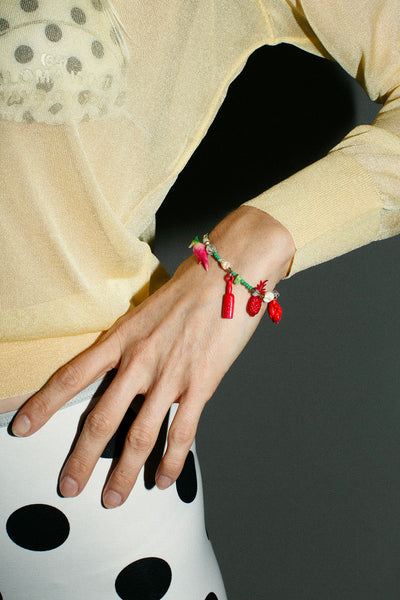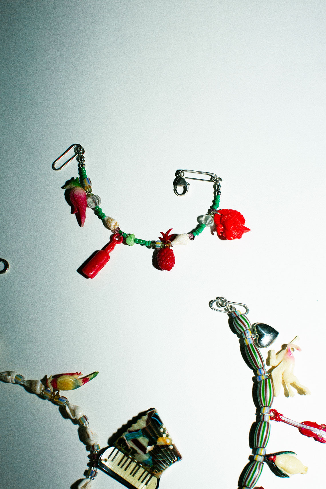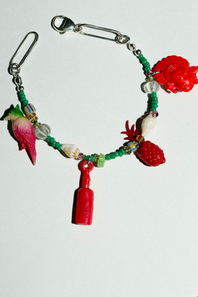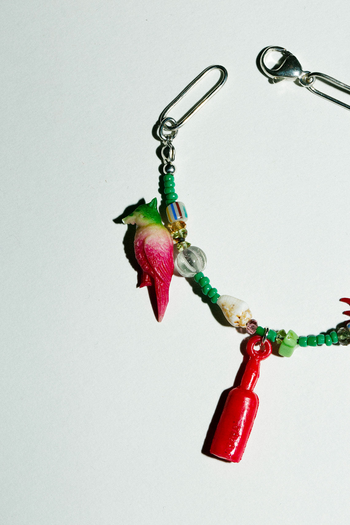 Sterling silver, antique celluloid charms, shell, tourmaline, citrine, peridot, green amethyst, glass and turquoise beads. Sterling silver links and clasp. Handmade in Milwaukee, WI. One of a kind.