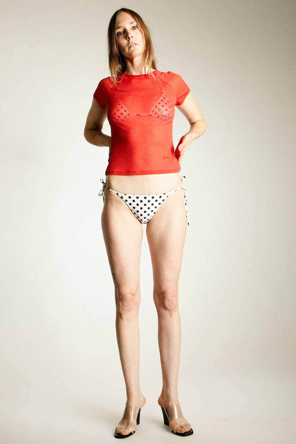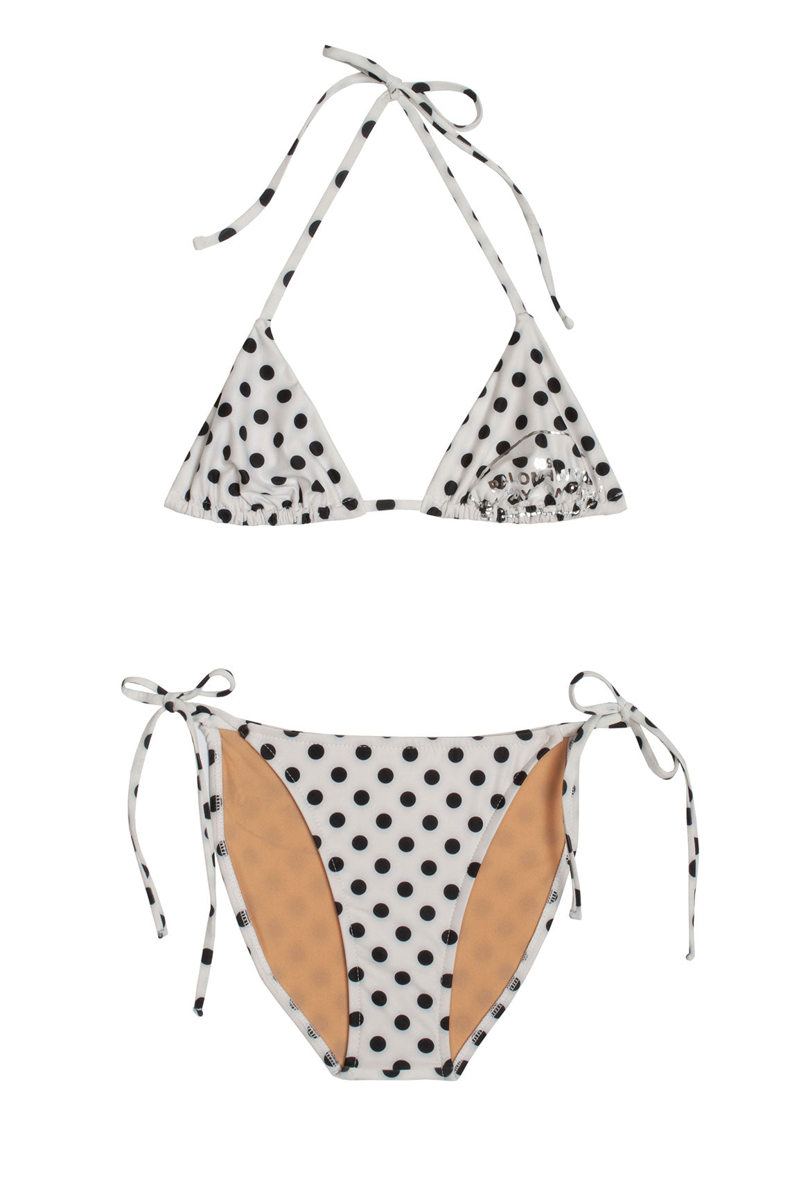 Triangle bikini top and bikini bottom with all over polka dot print with foil stamp overlay and adjustable ties. Slightly smaller than a classic string bikini. Fabric is 85% ecoyarn PES,15% elastane.