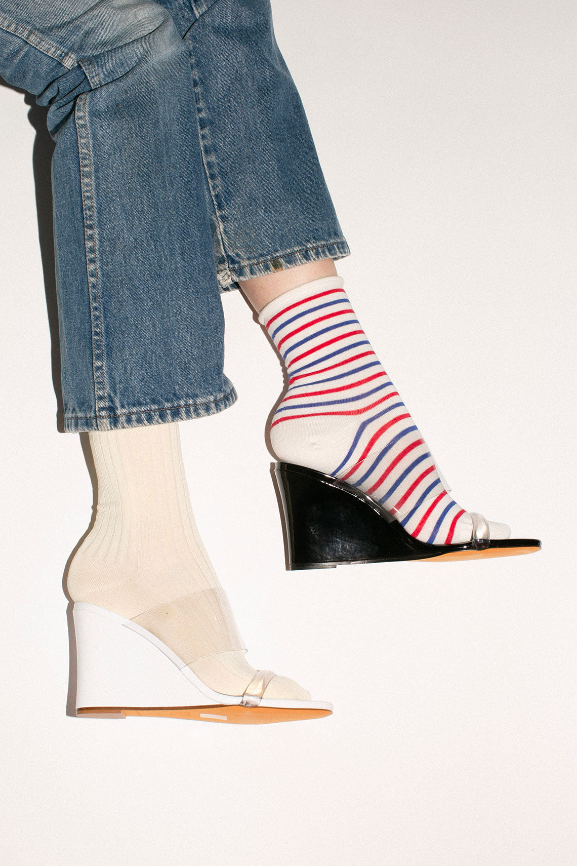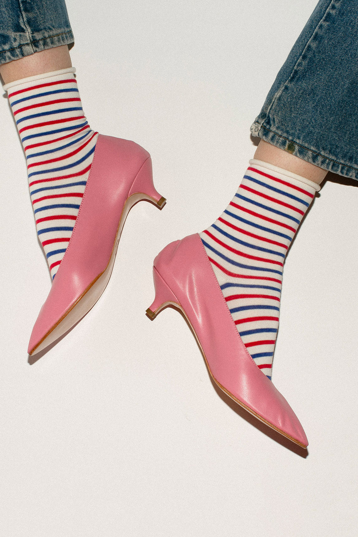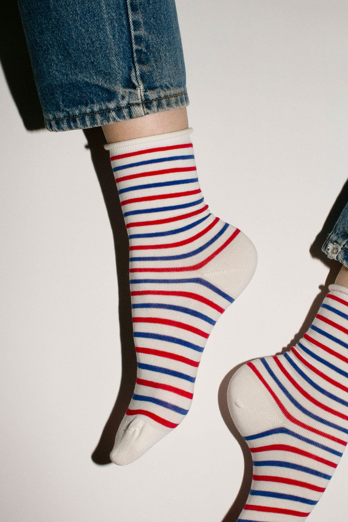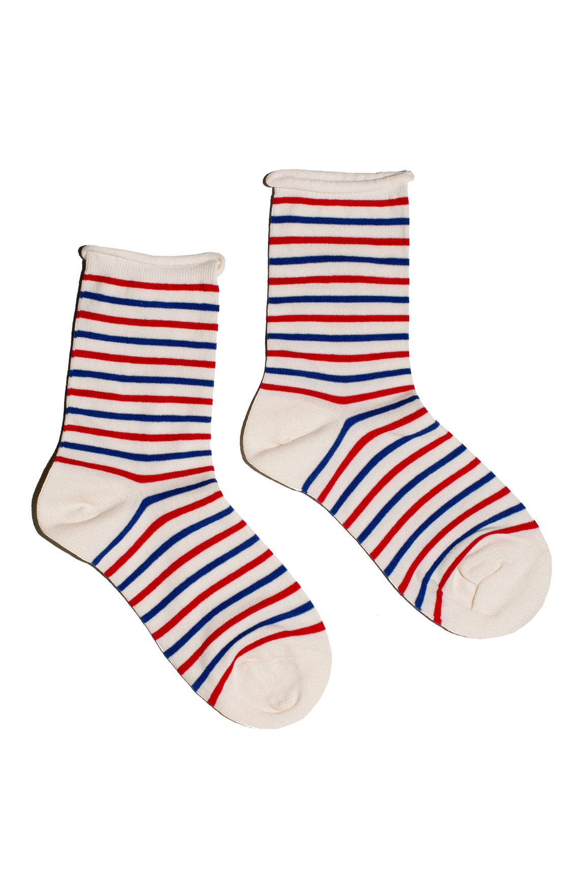 Soft cotton blend striped crew sock in the French red, white, and blue.
