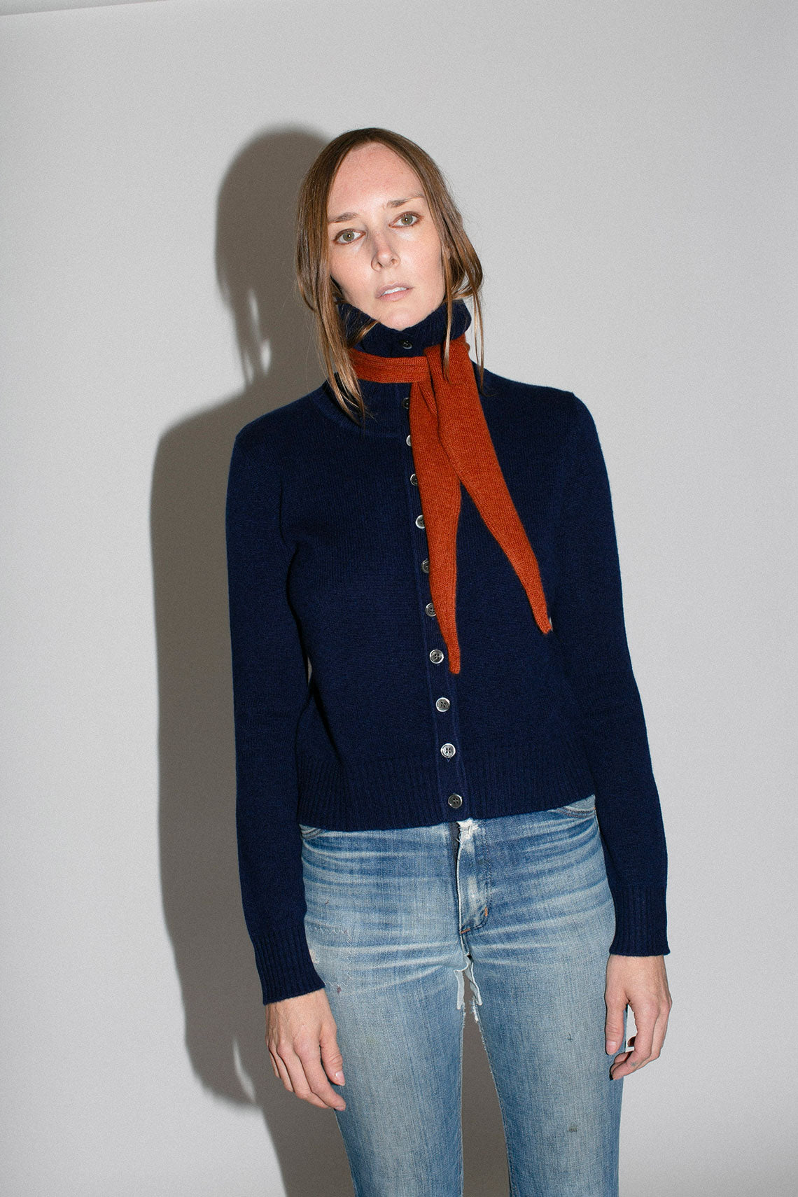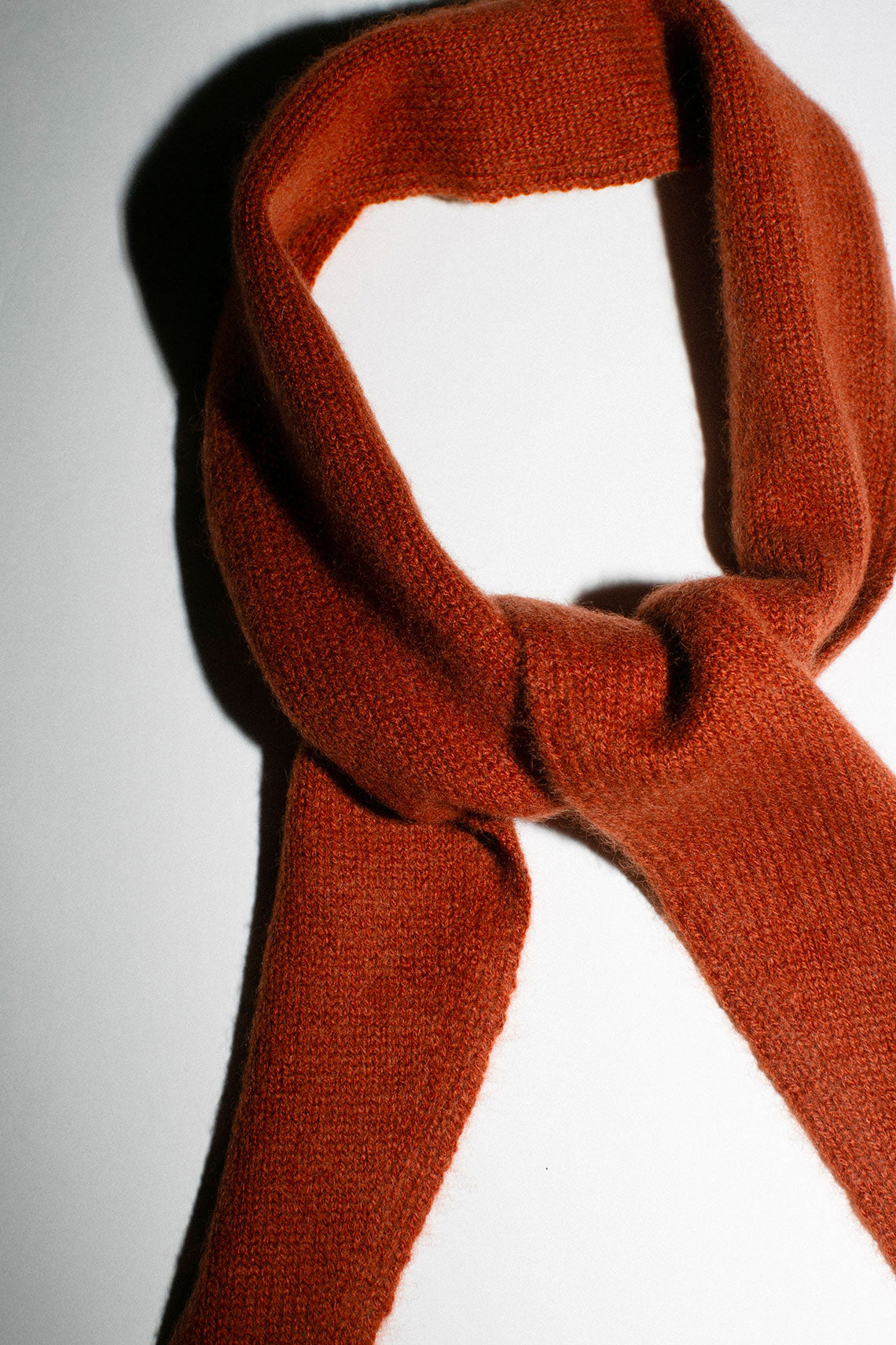 Pure cashmere mini scarf with a slim, elongated silhouette allows for effortless styling. Tie it neatly around the neck or draped casually over the shoulders. Fabric is 100% Mongolian cashmere. Scarf is 43" long.