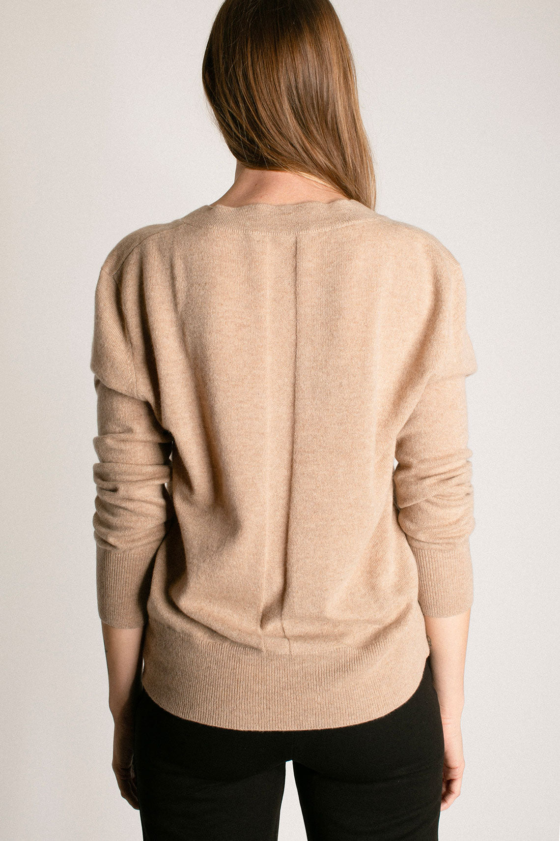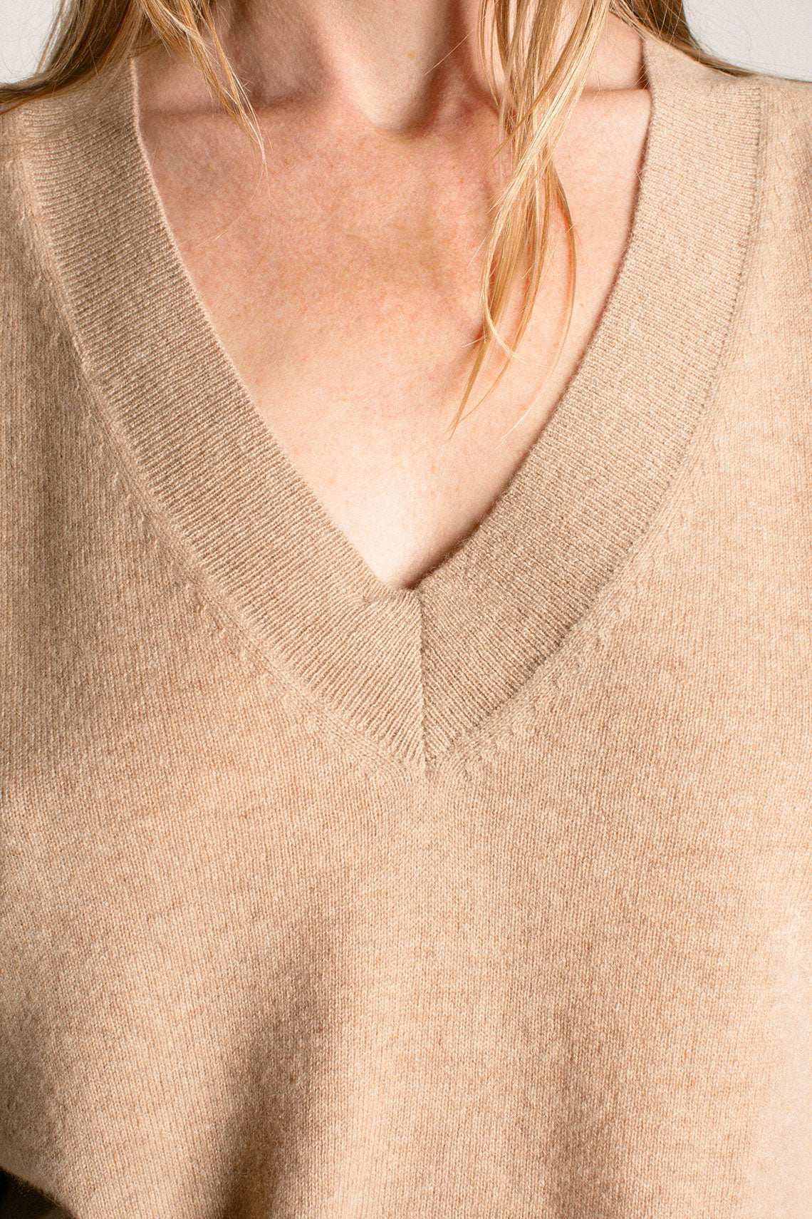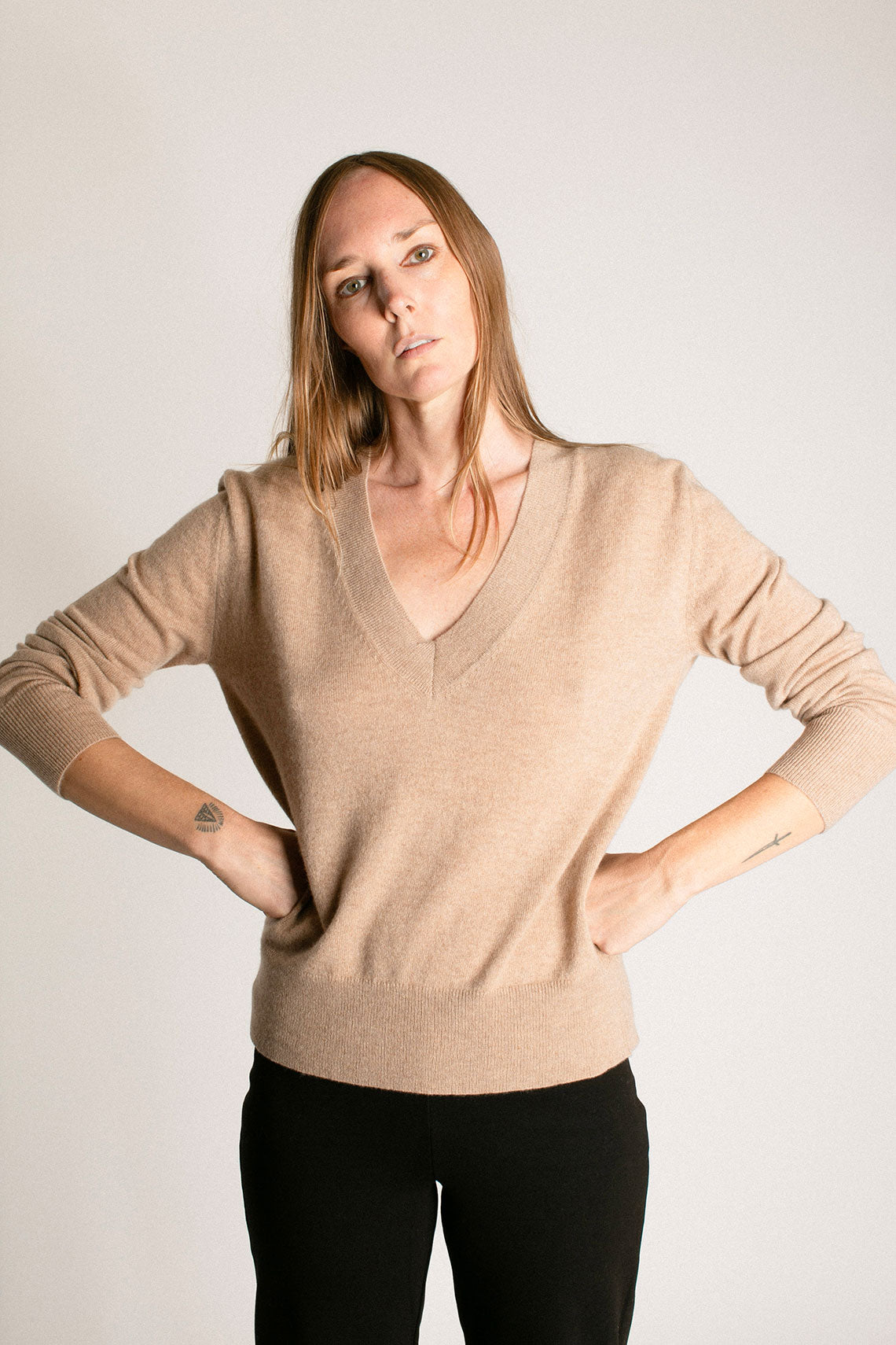 Loose silhouette oversized V-neck. Fabric is 100% Mongolian cashmere.