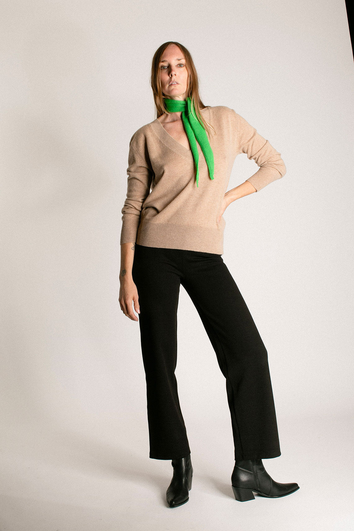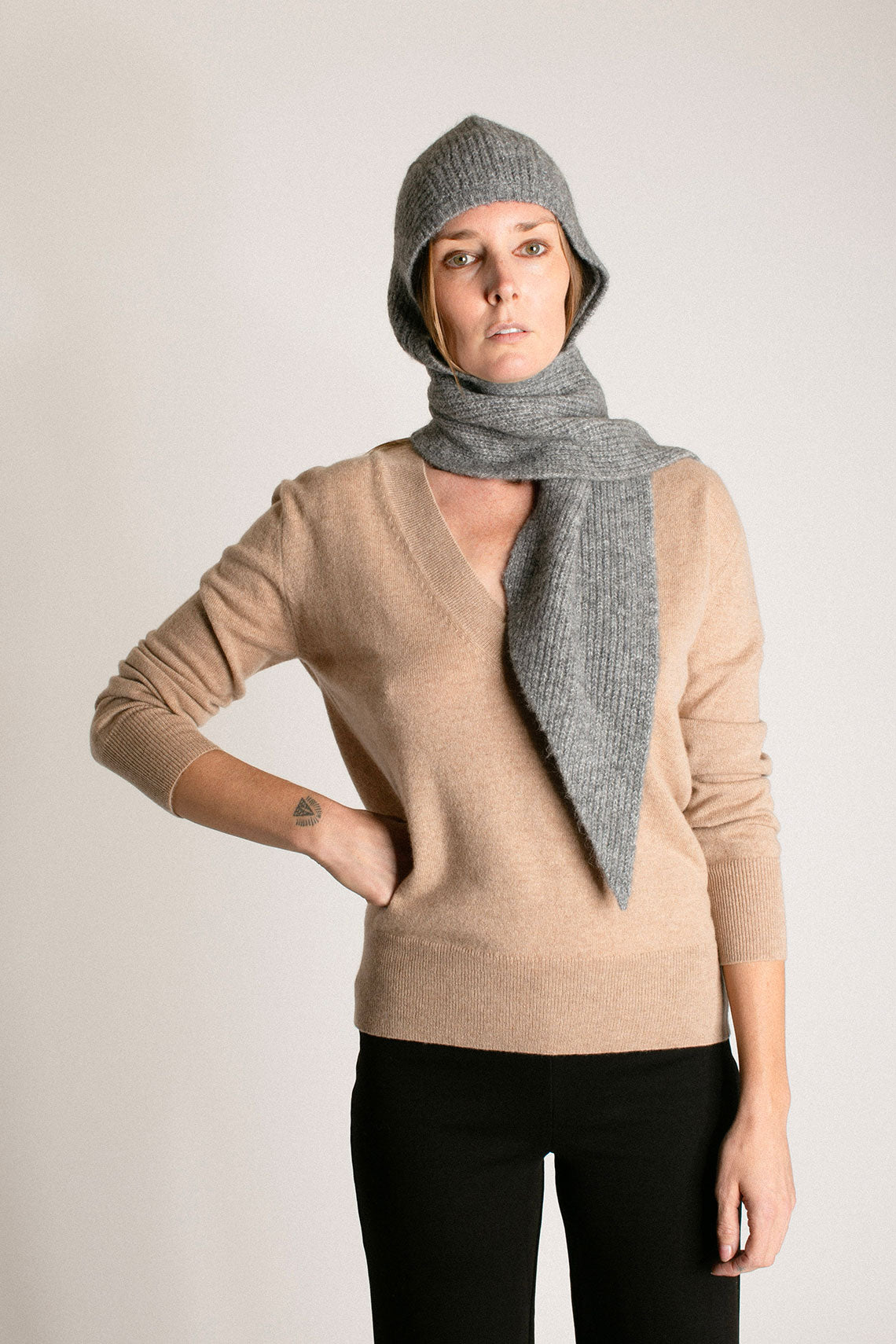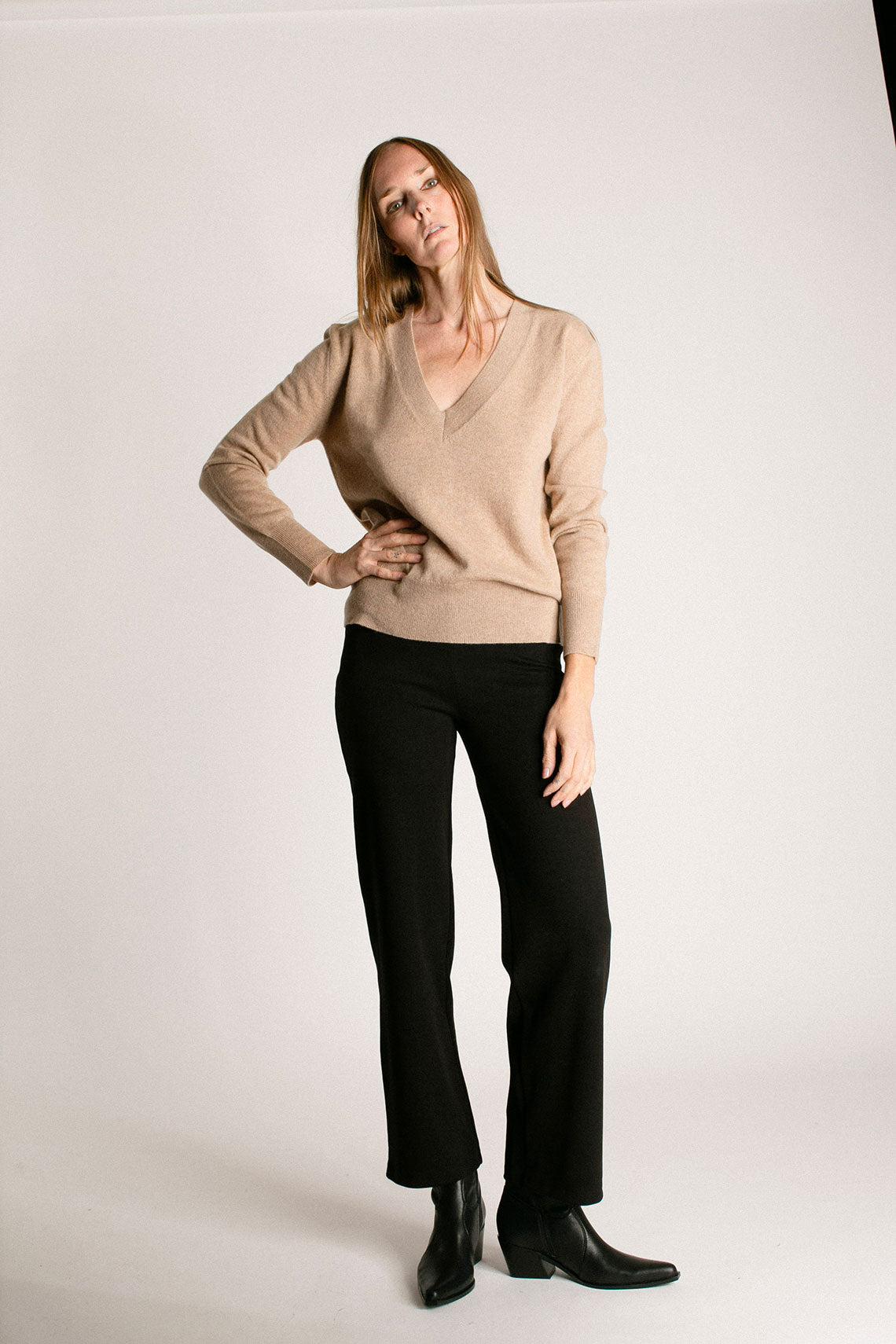 Loose silhouette oversized V-neck. Fabric is 100% Mongolian cashmere.