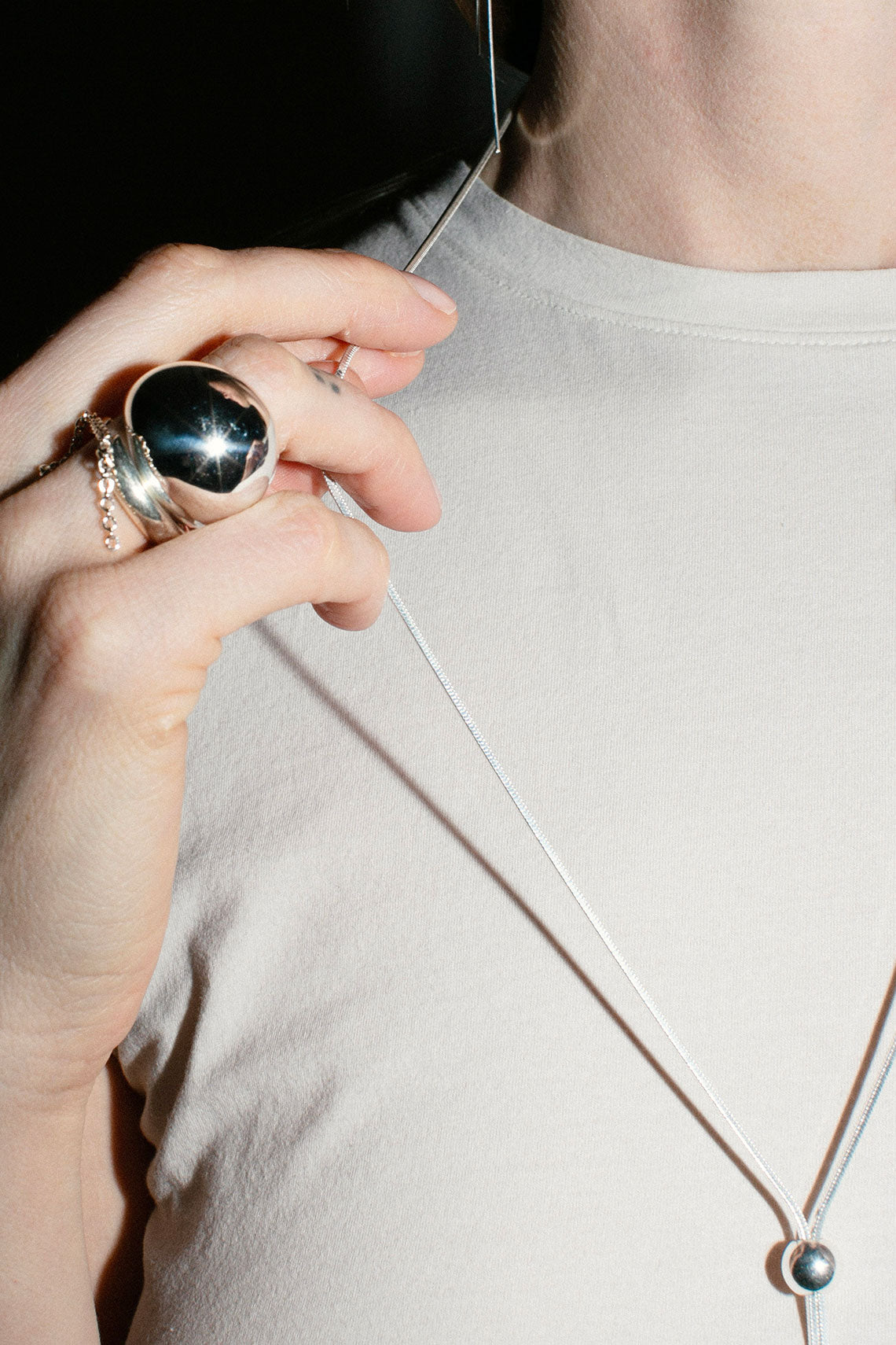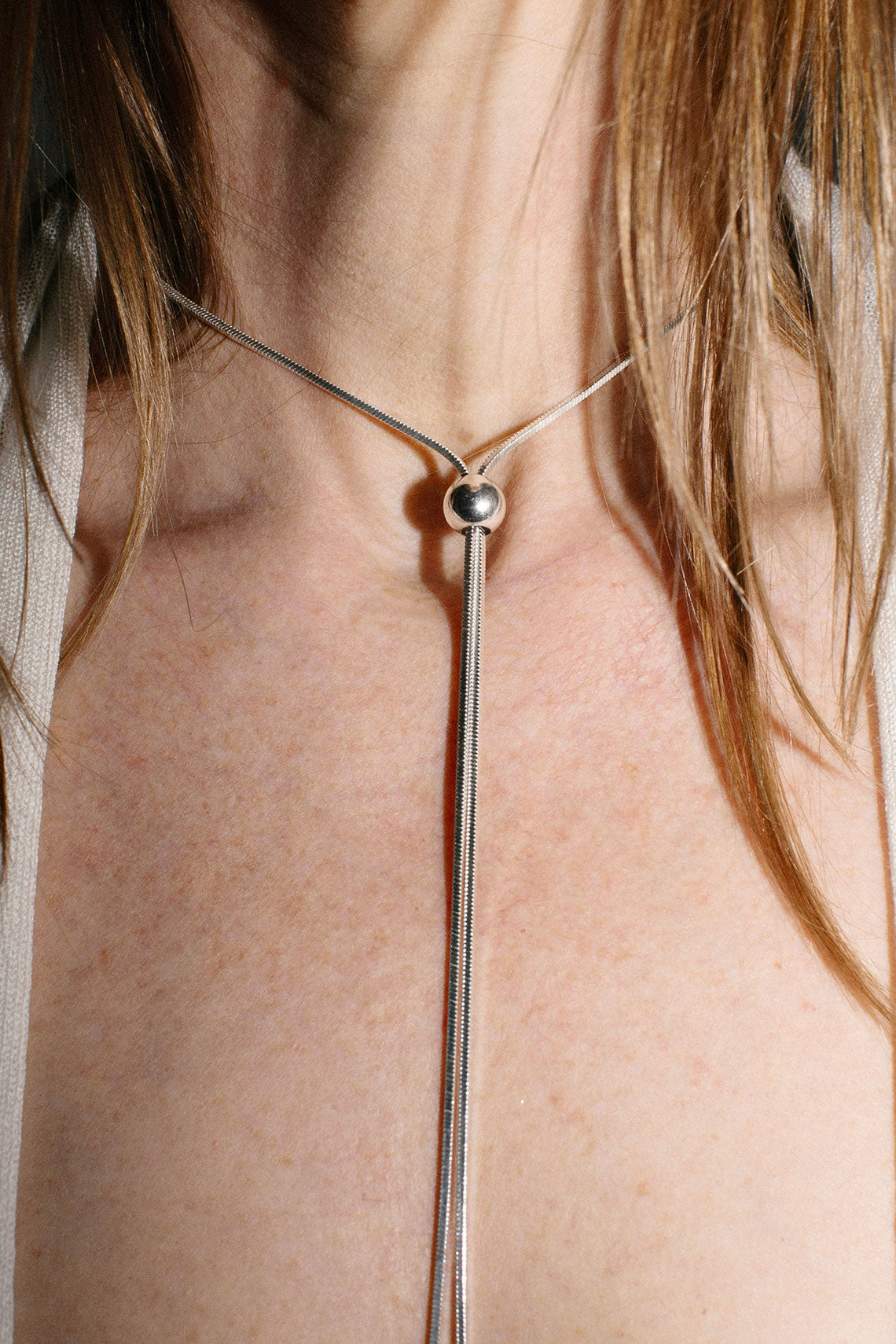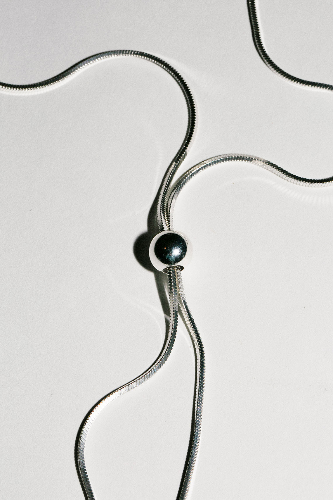 Sterling silver lariat necklace with a functional adjustable silver bead. Square snake chain. No closure. Made in Italy.
