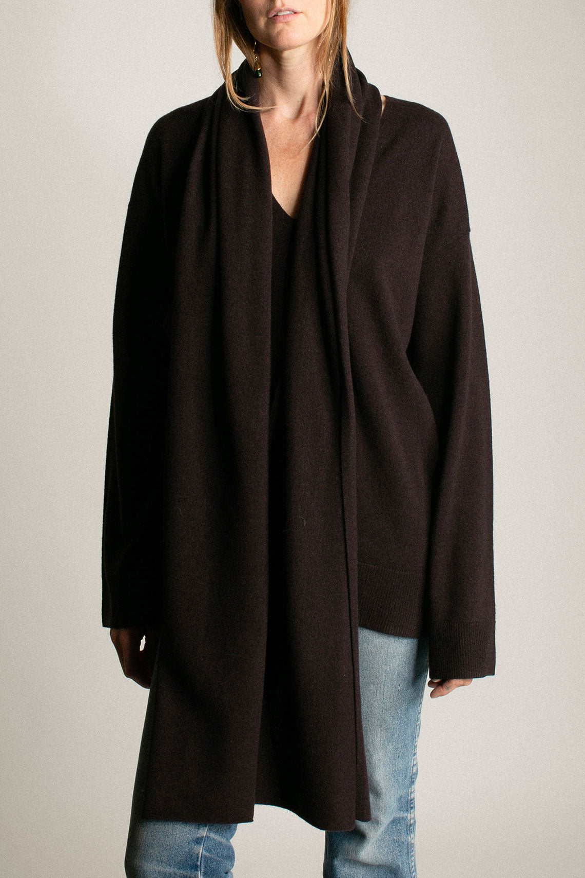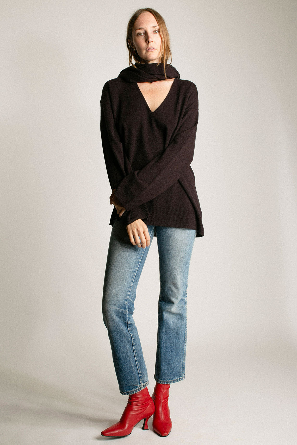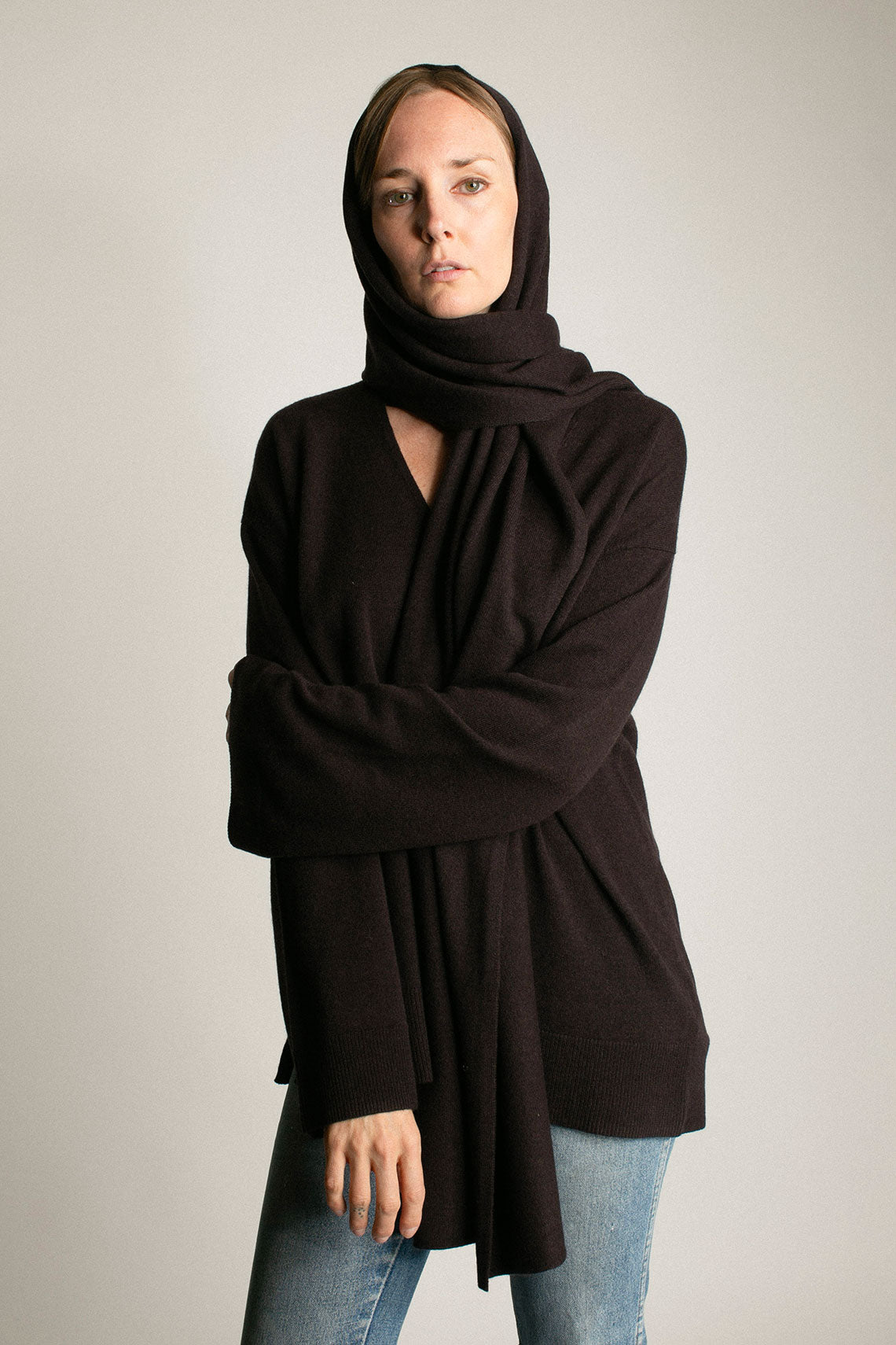 Deep V drape sweater with elongated sleeves and an asymmetrical hemline. Comes with a detachable scarf. Fabric is 100% merino wool.