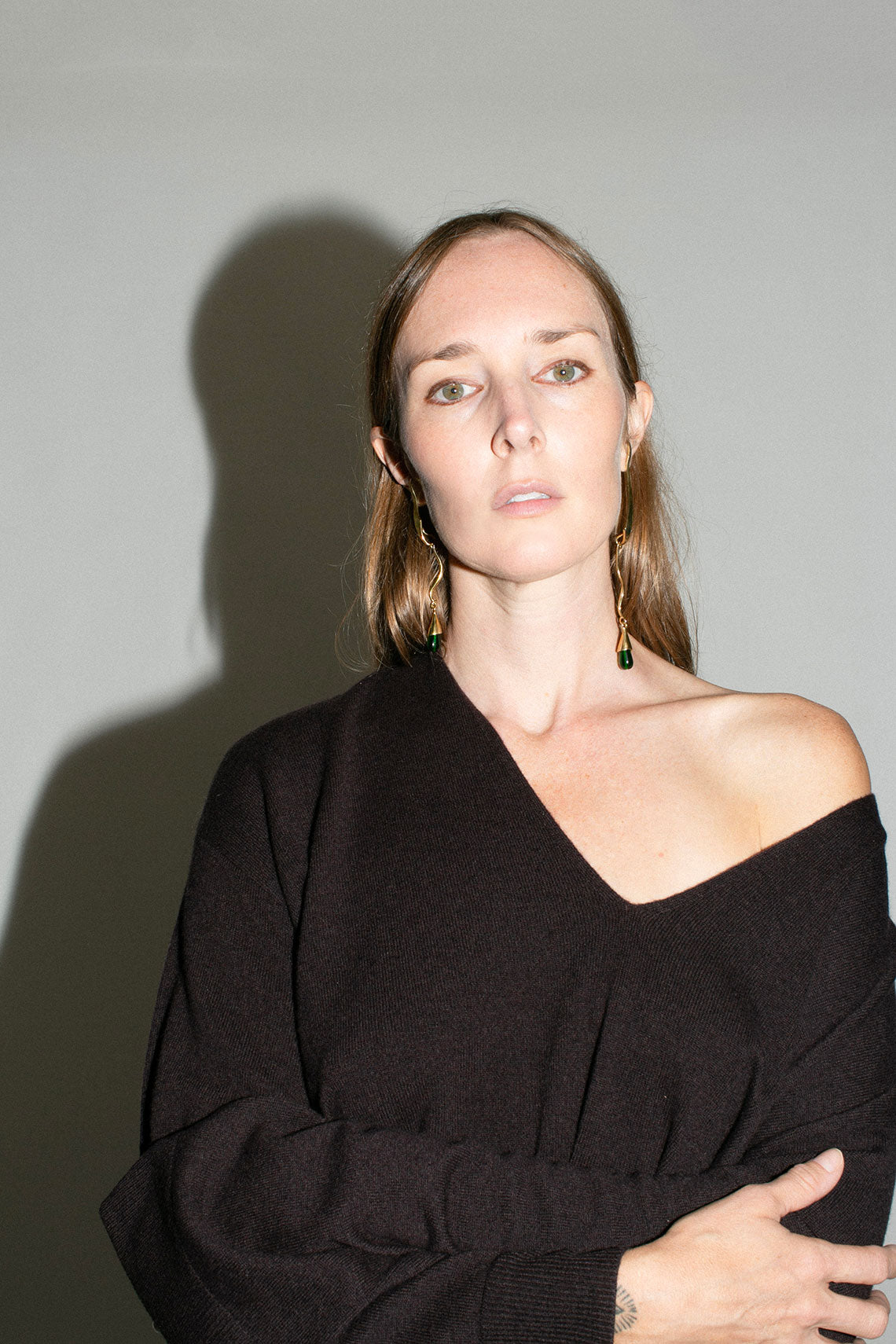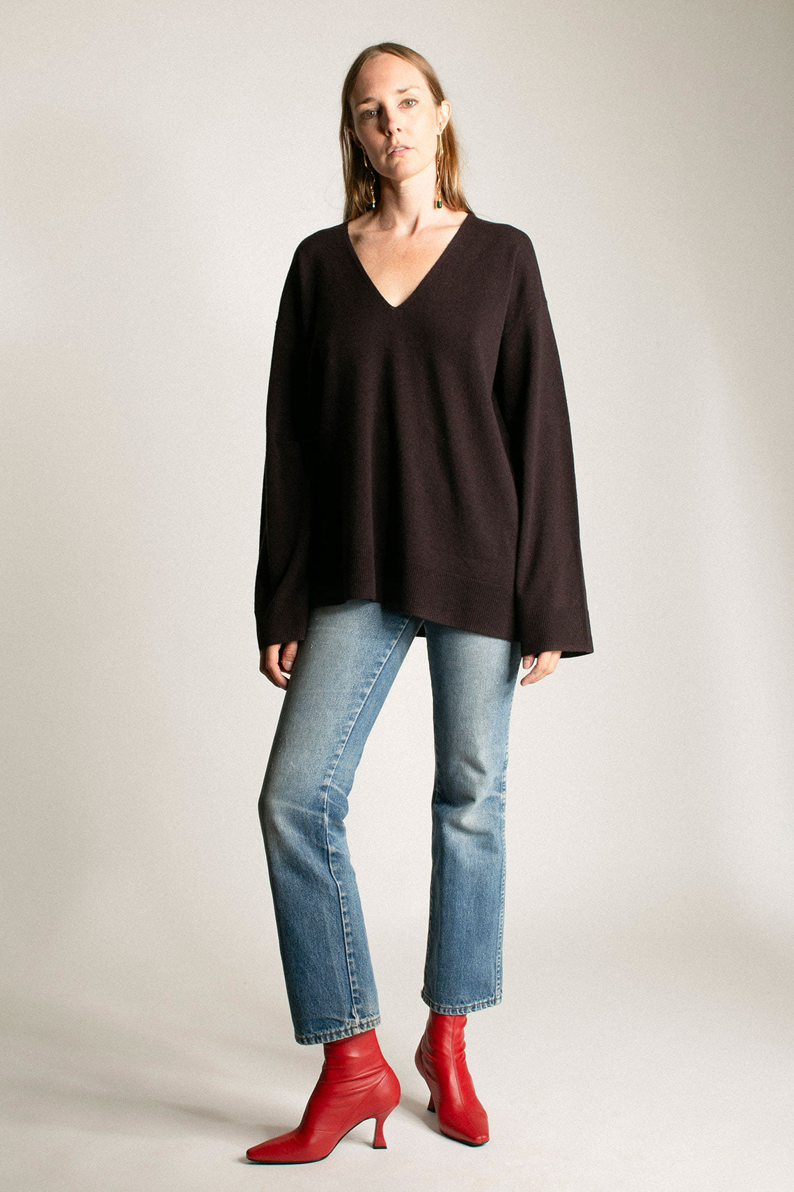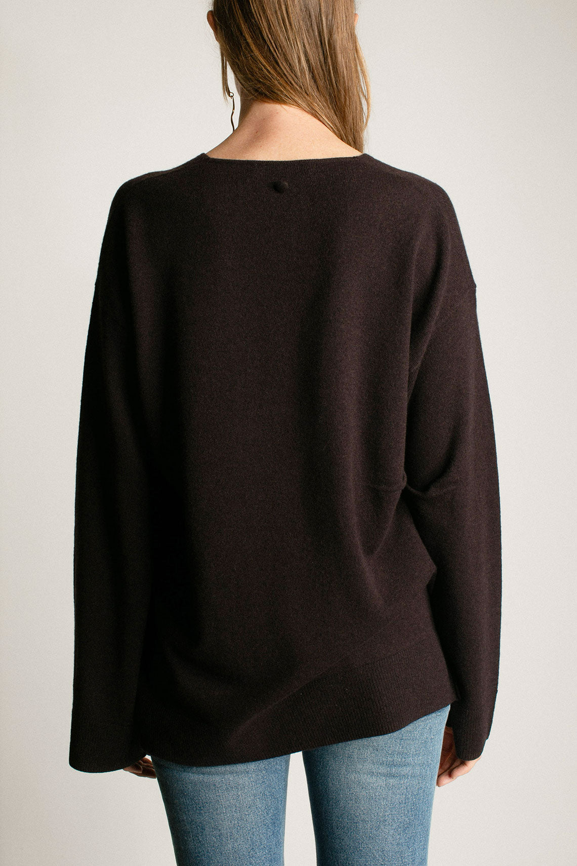 Deep V drape sweater with elongated sleeves and an asymmetrical hemline. Comes with a detachable scarf. Fabric is 100% merino wool.