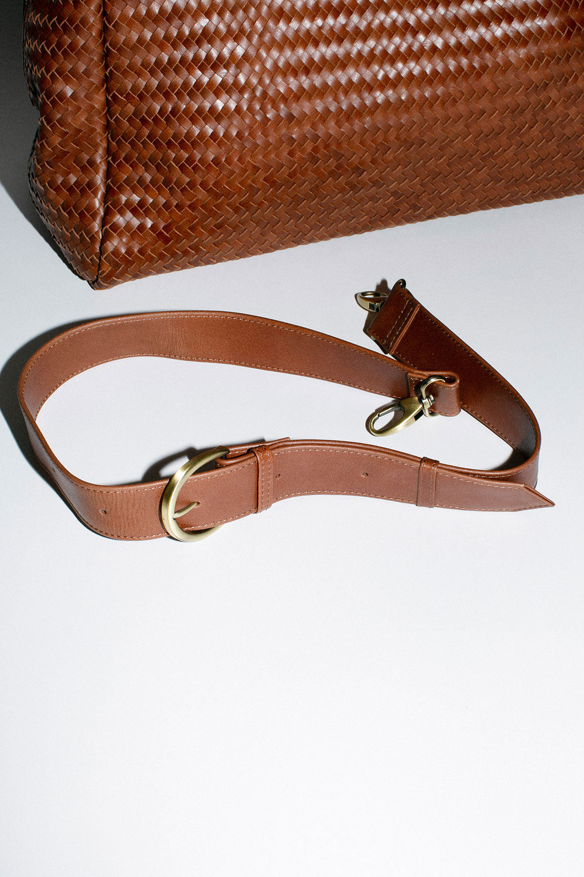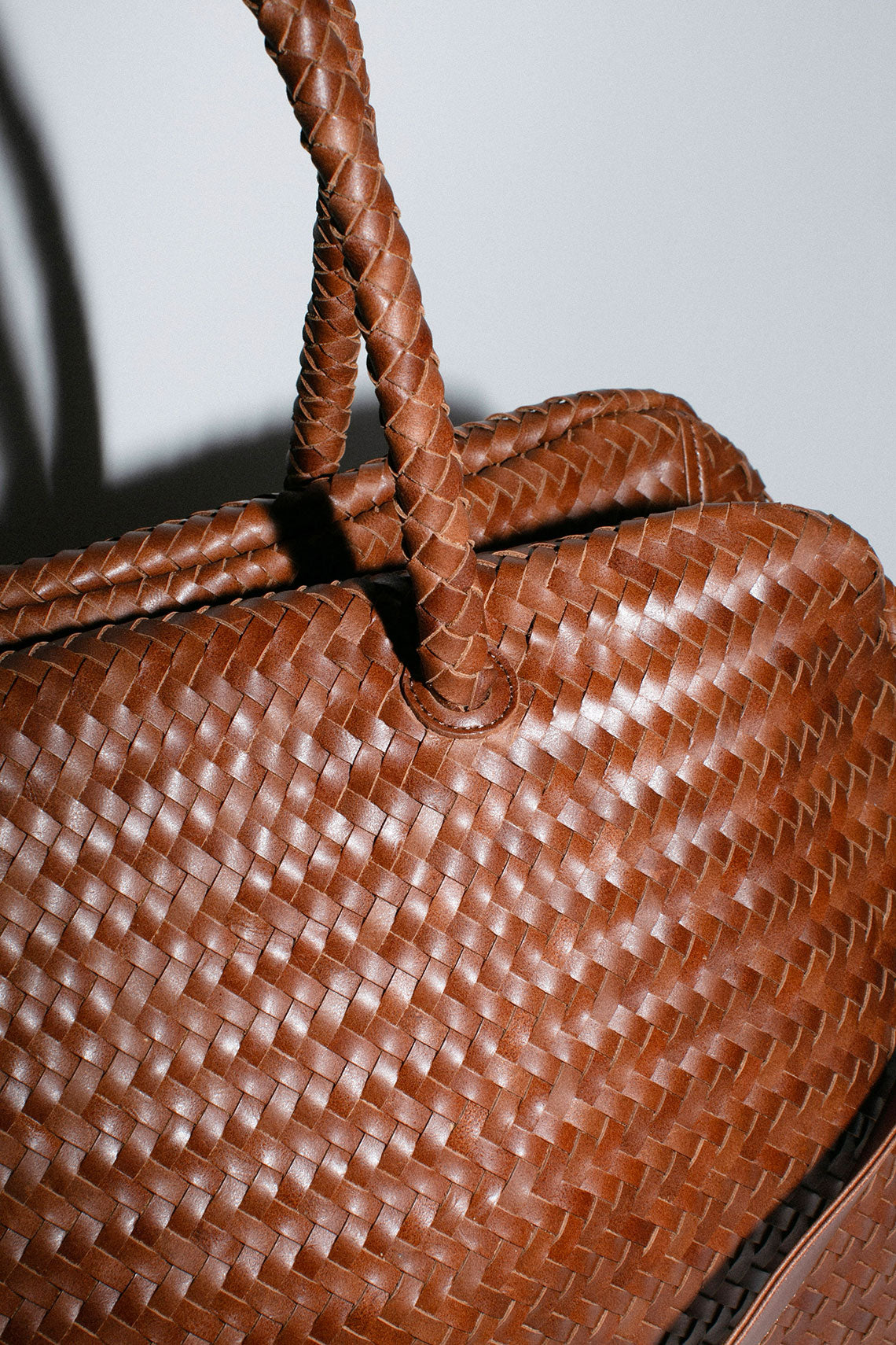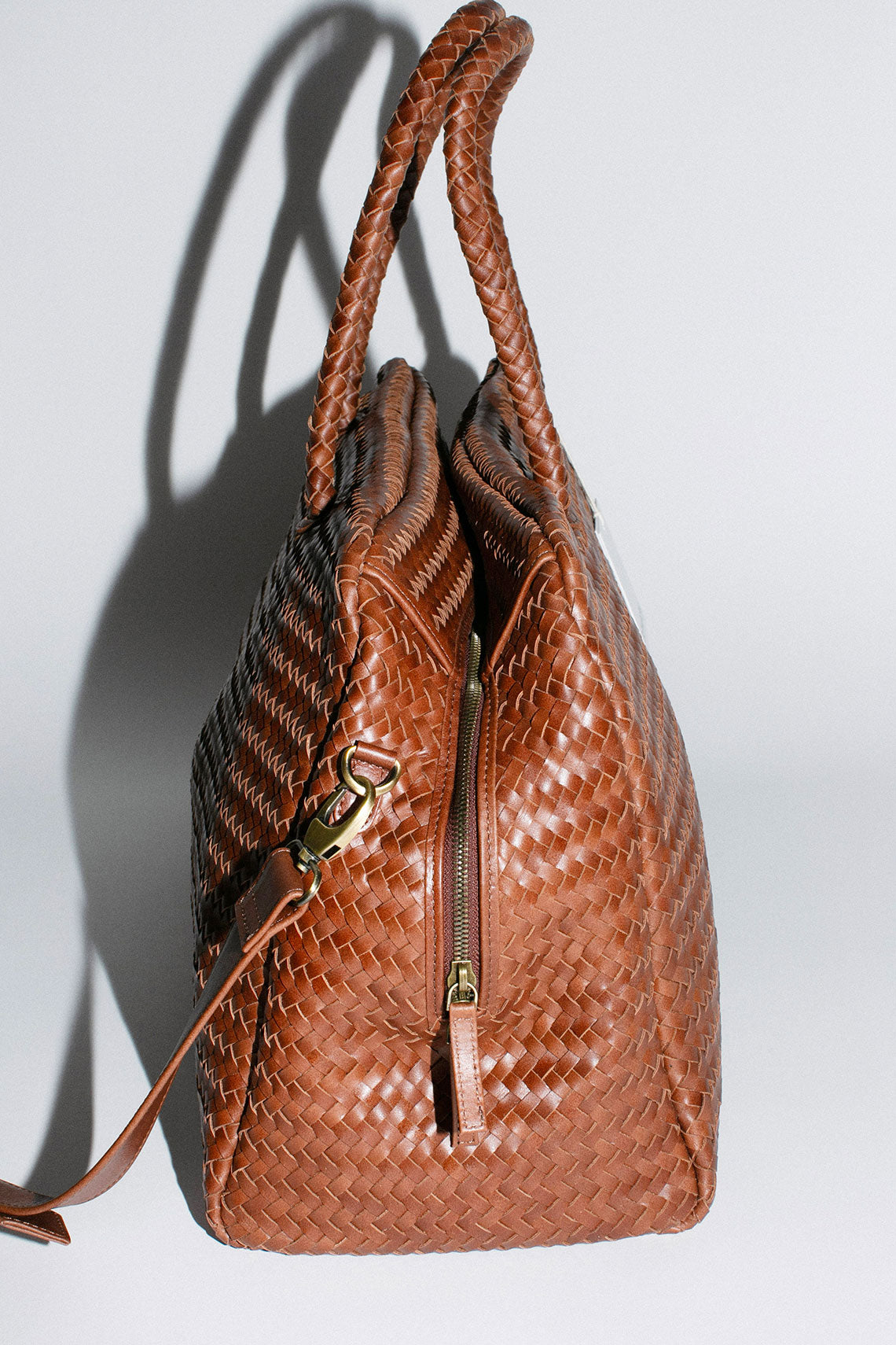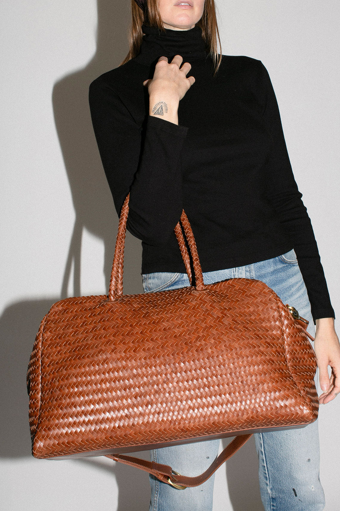 A vintage-inspired bowler bag in hand-woven leather with two braided leather top handles and a detachable long shoulder strap. Magnetic closure, cotton lining and inner pocket, metal hardware. Measures 20” x 11.5”x 8.5” with 8" strap drop.