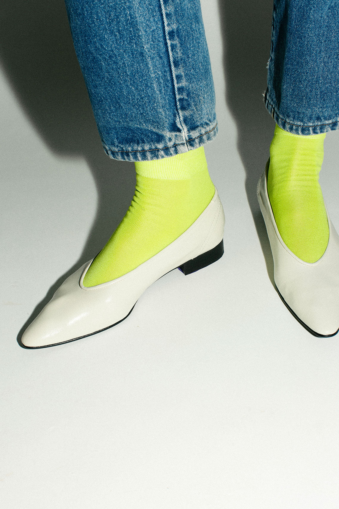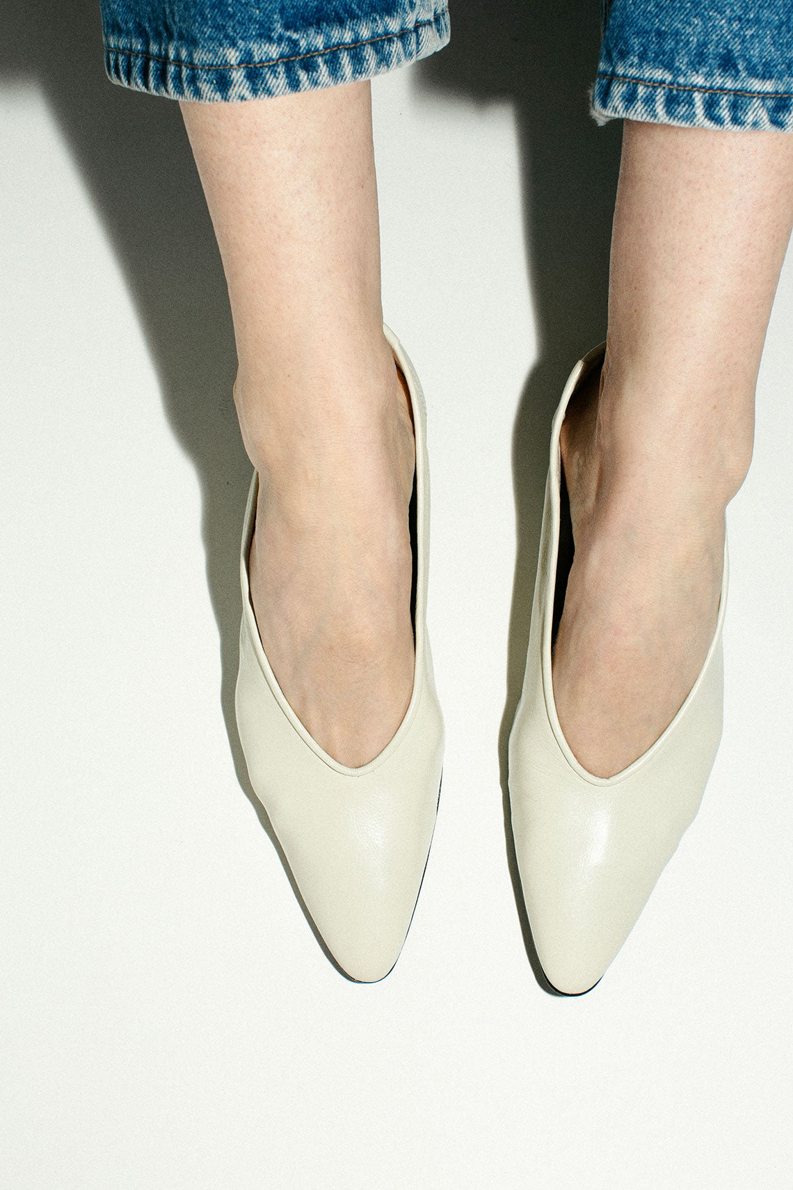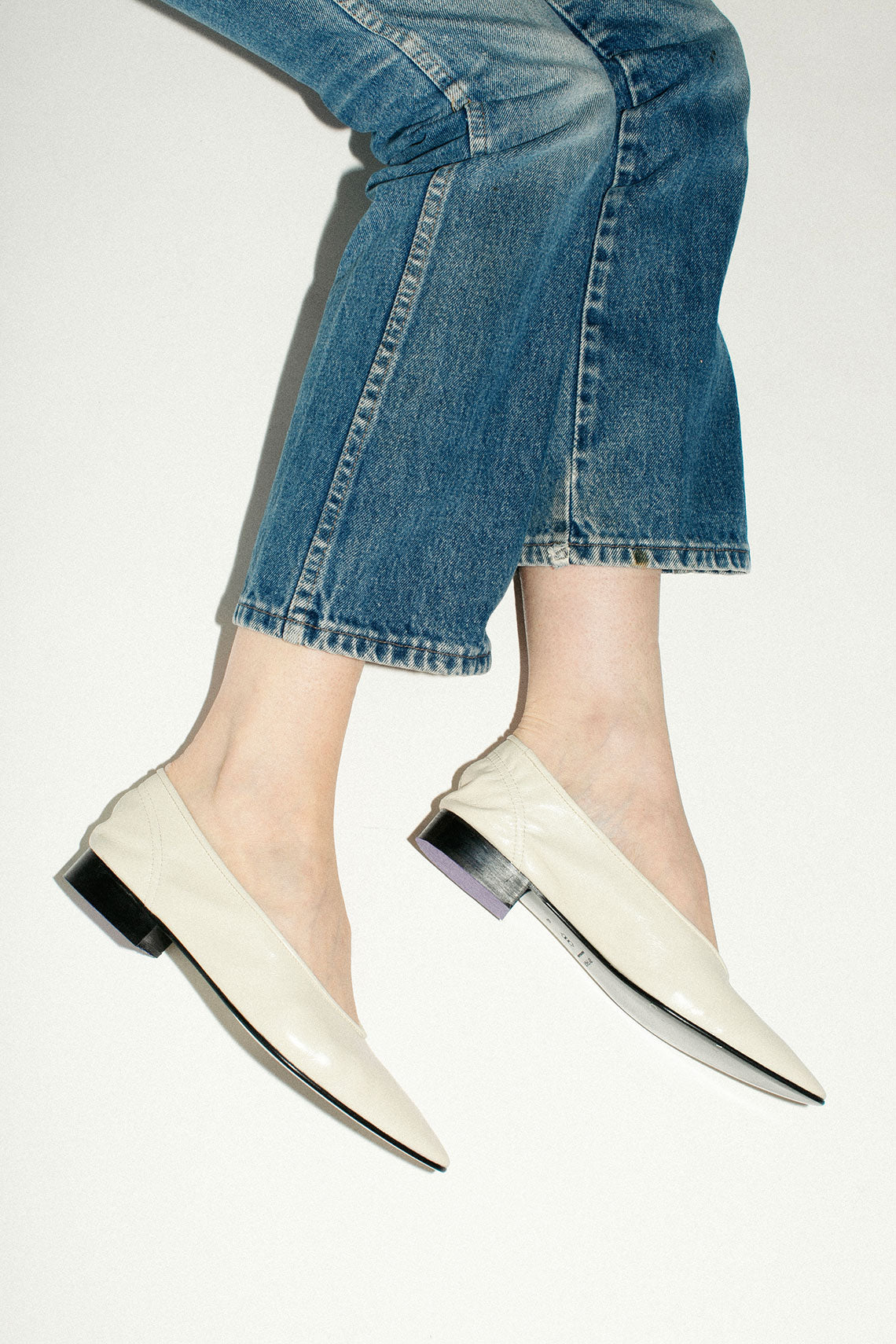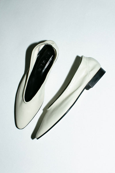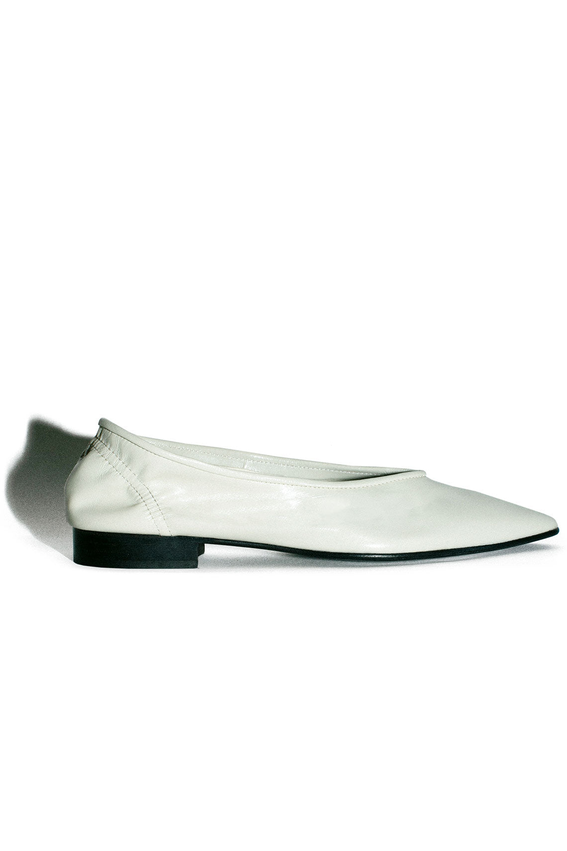 Flattering slim silhouette flat with slight pointed toe. Padded insole and elasticized heel. Fabric is 100% kid leather.