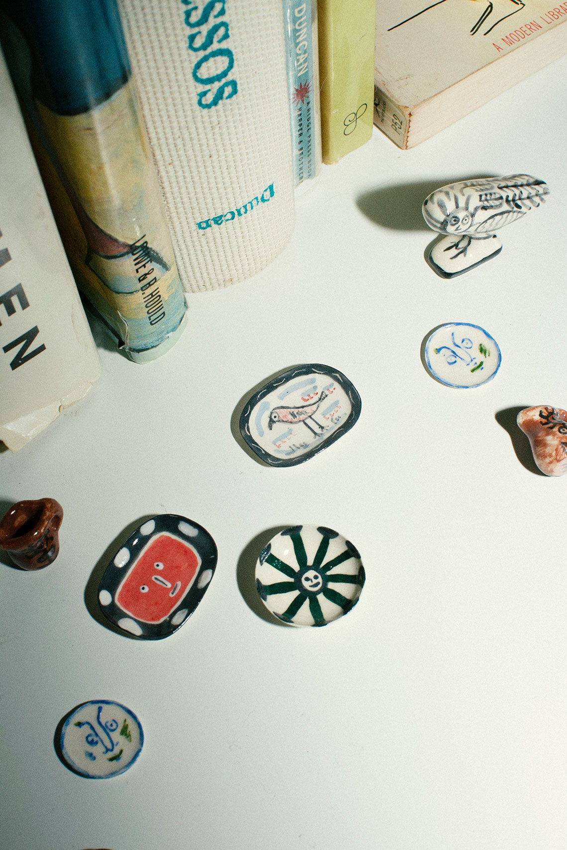 Tiny Picasso-inspired ceramic miniature bowl with blue sun. All items are handmade from start to finish, using clay, underglaze paint, several glazes, china paint. Measures 1 1/4 inch in diameter.  Very fragile.