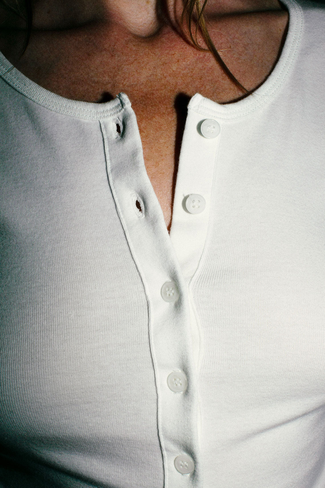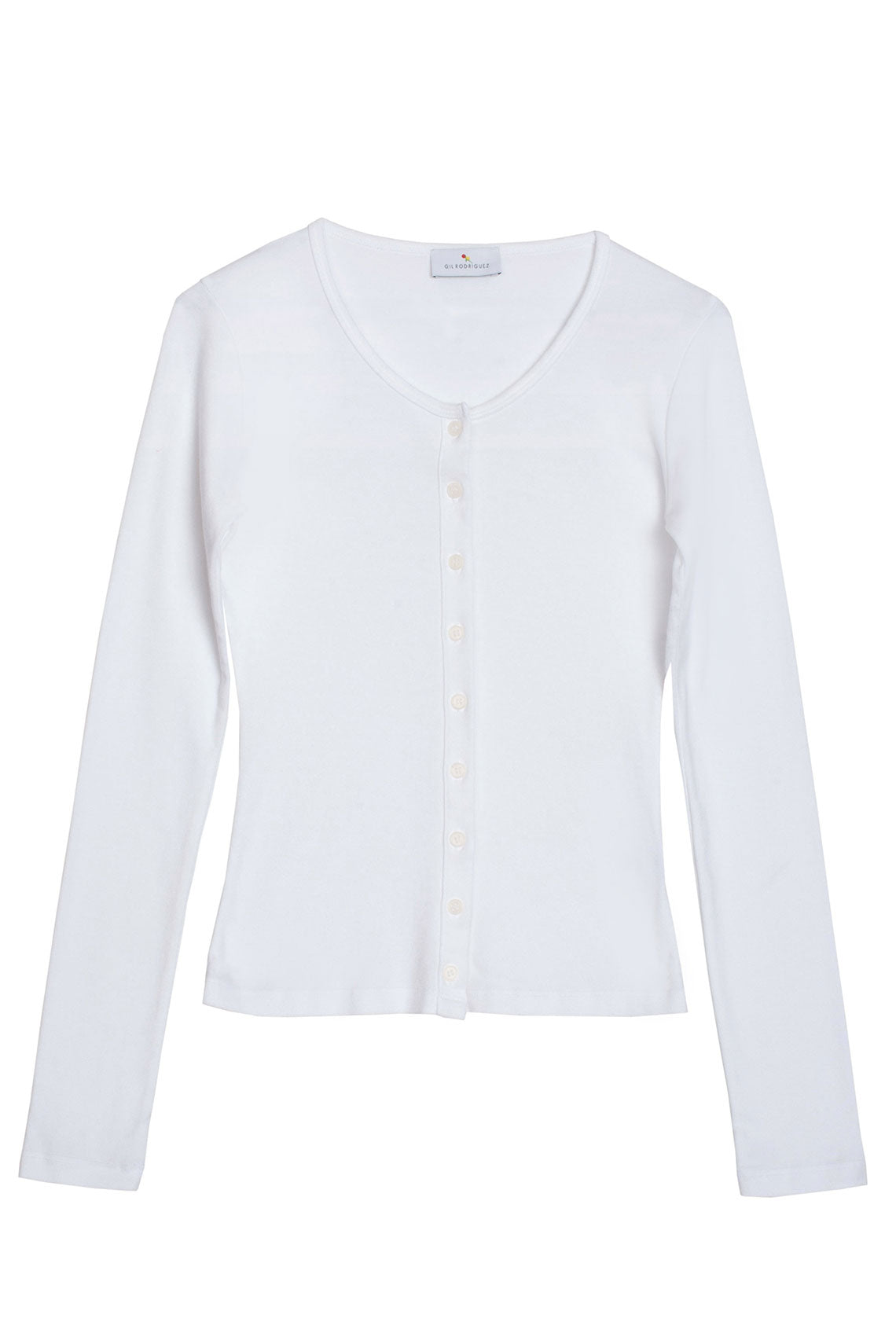 Fitted long-sleeved button up cardigan. Fabric is 100% cotton.