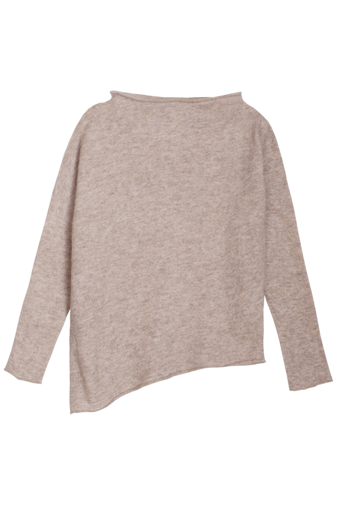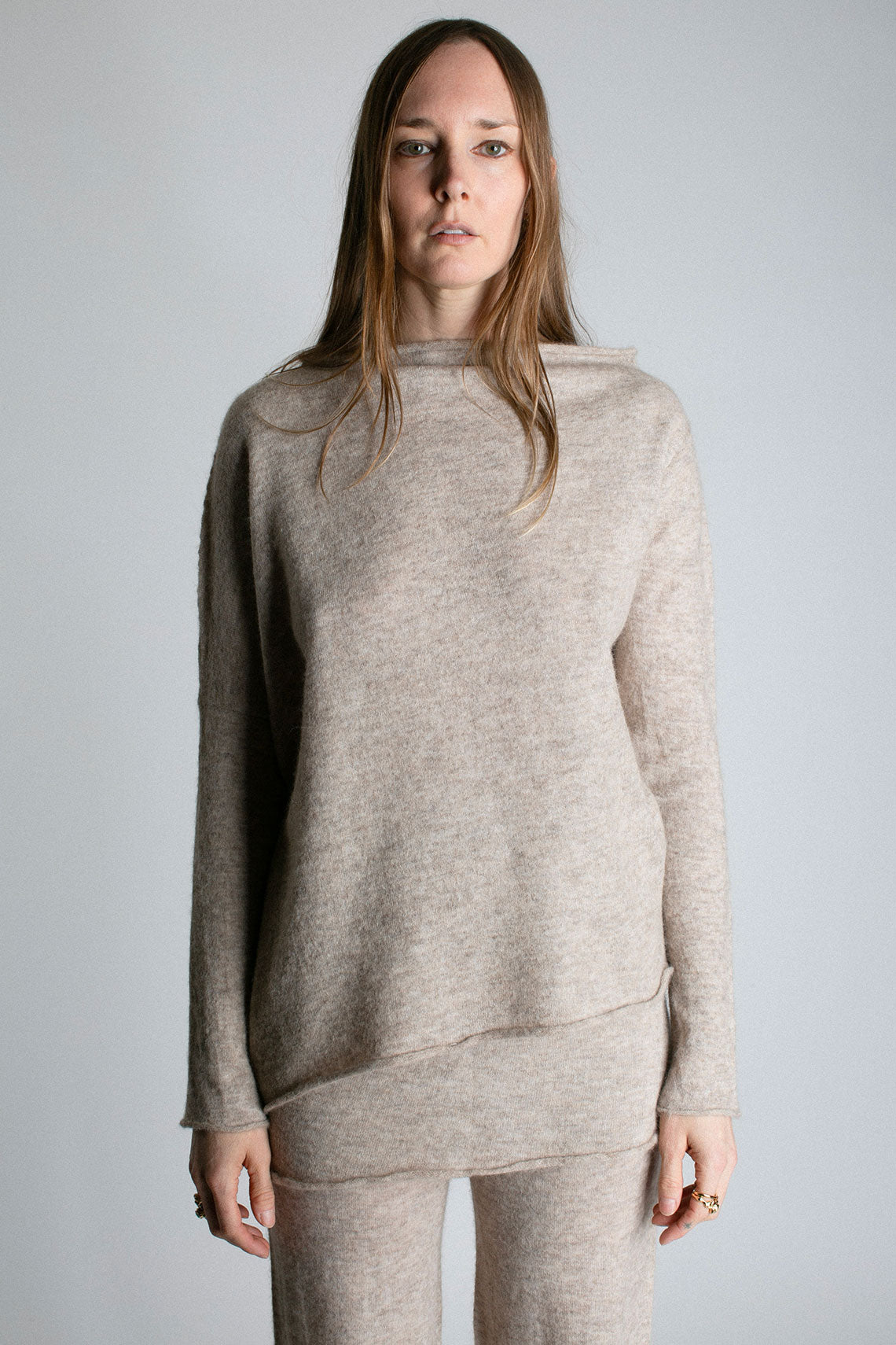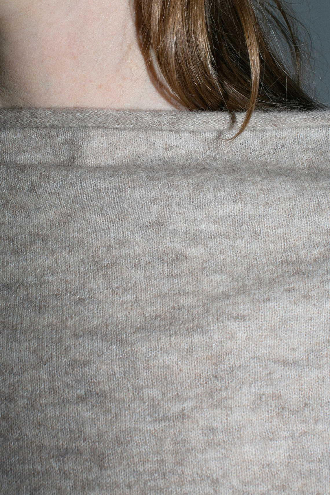 Fuzzy fine knit boatneck sweater with rolled edges with an asymmetric draped silhouette. Fabric is 60% baby alpaca and 35% polyamide, 5% merino wool.