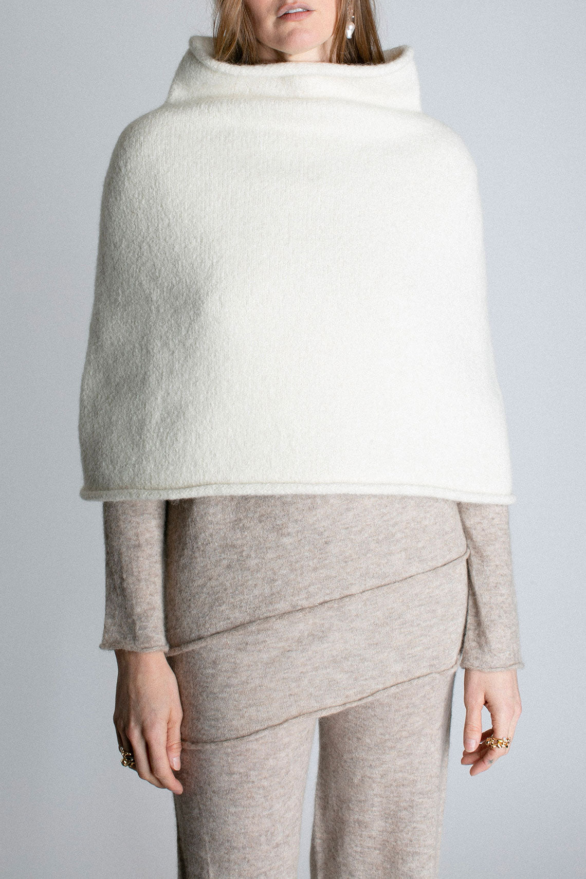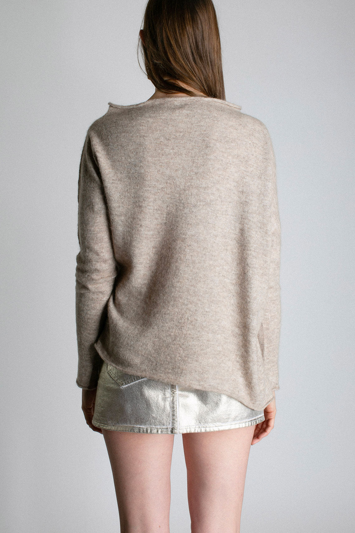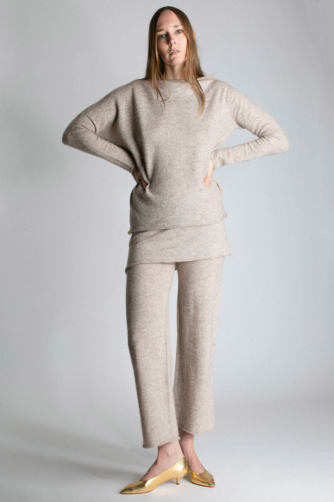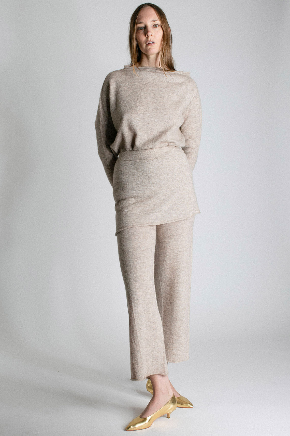 Fuzzy fine knit boatneck sweater with rolled edges with an asymmetric draped silhouette. Fabric is 60% baby alpaca and 35% polyamide, 5% merino wool.