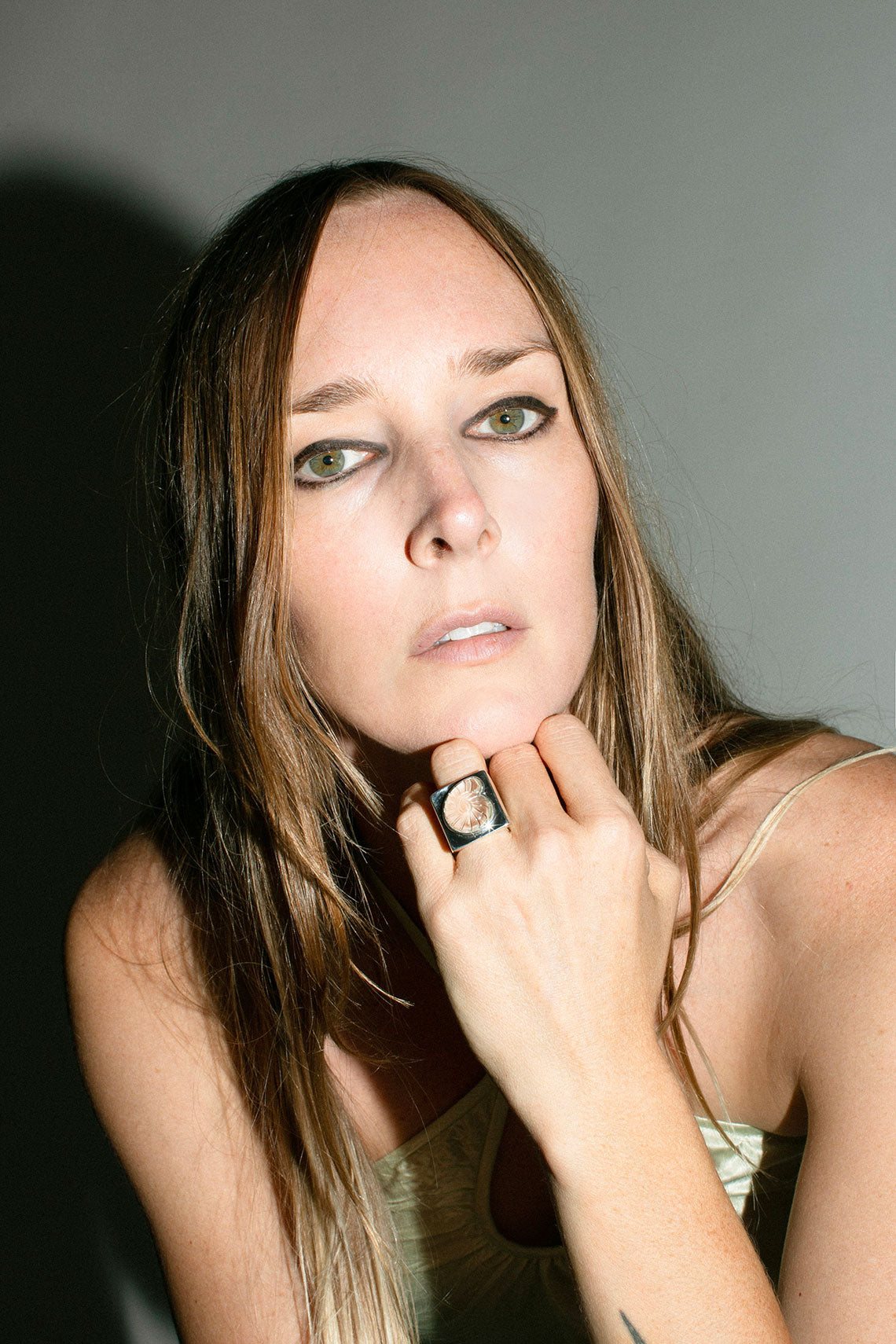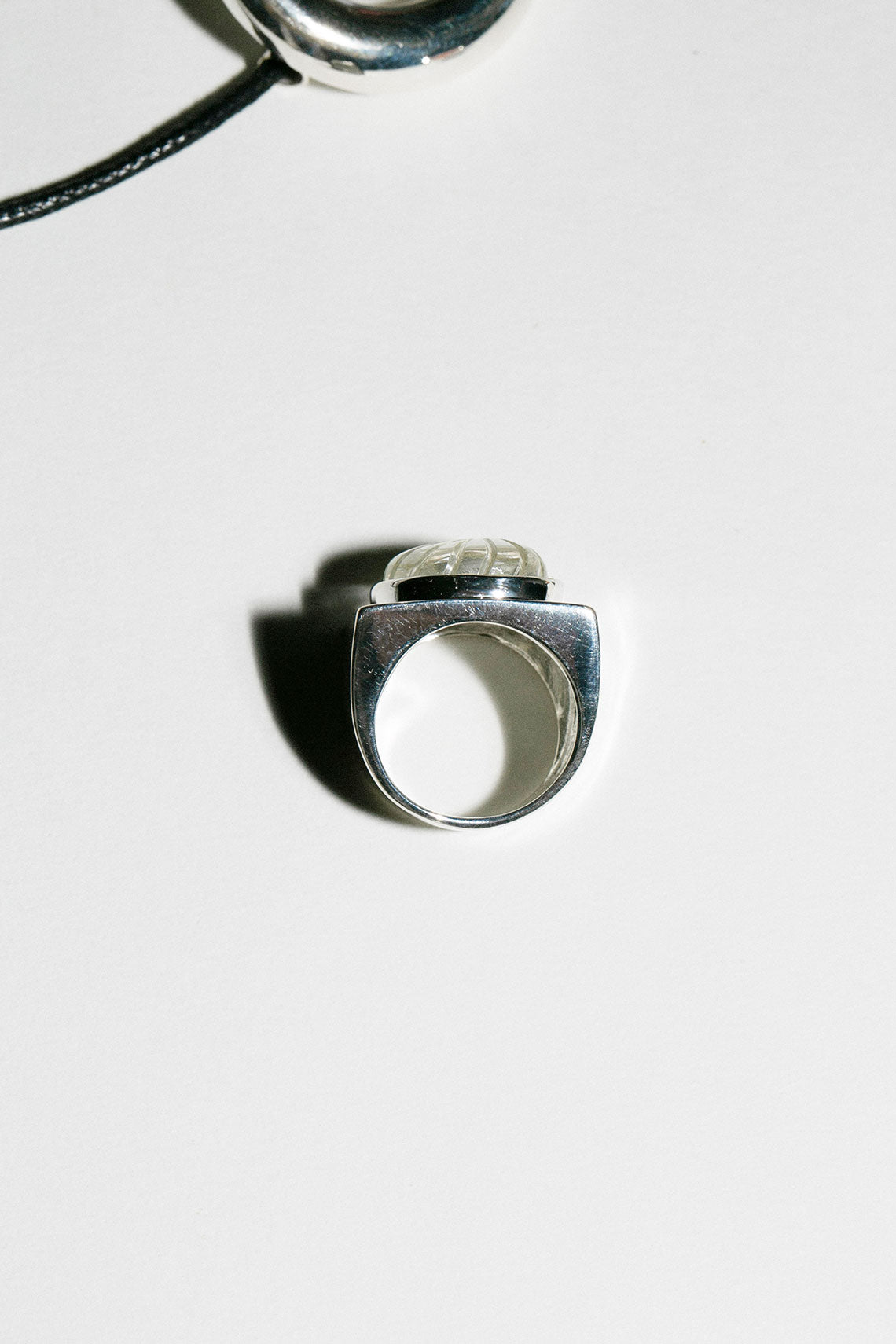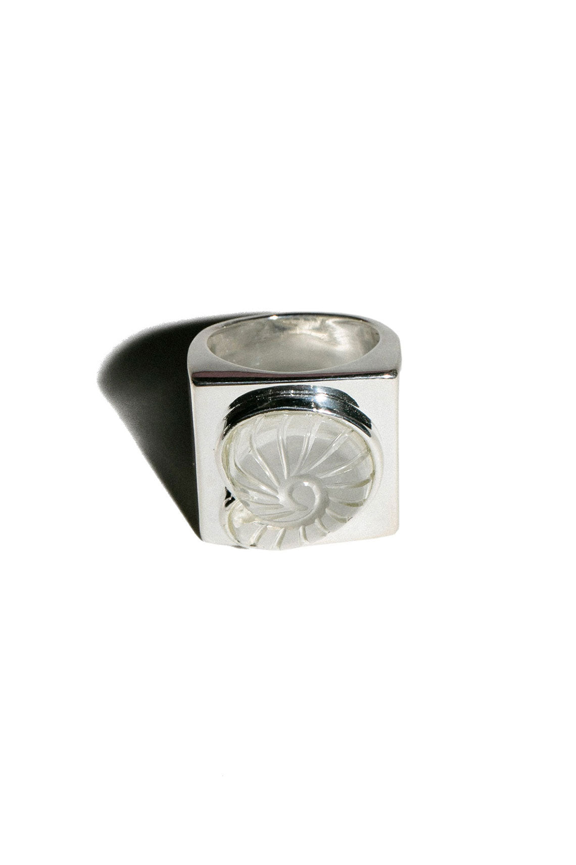 Square cut silver ring with crystal carved shell in the center. 1" x 7/8". Sterling silver & crystal.