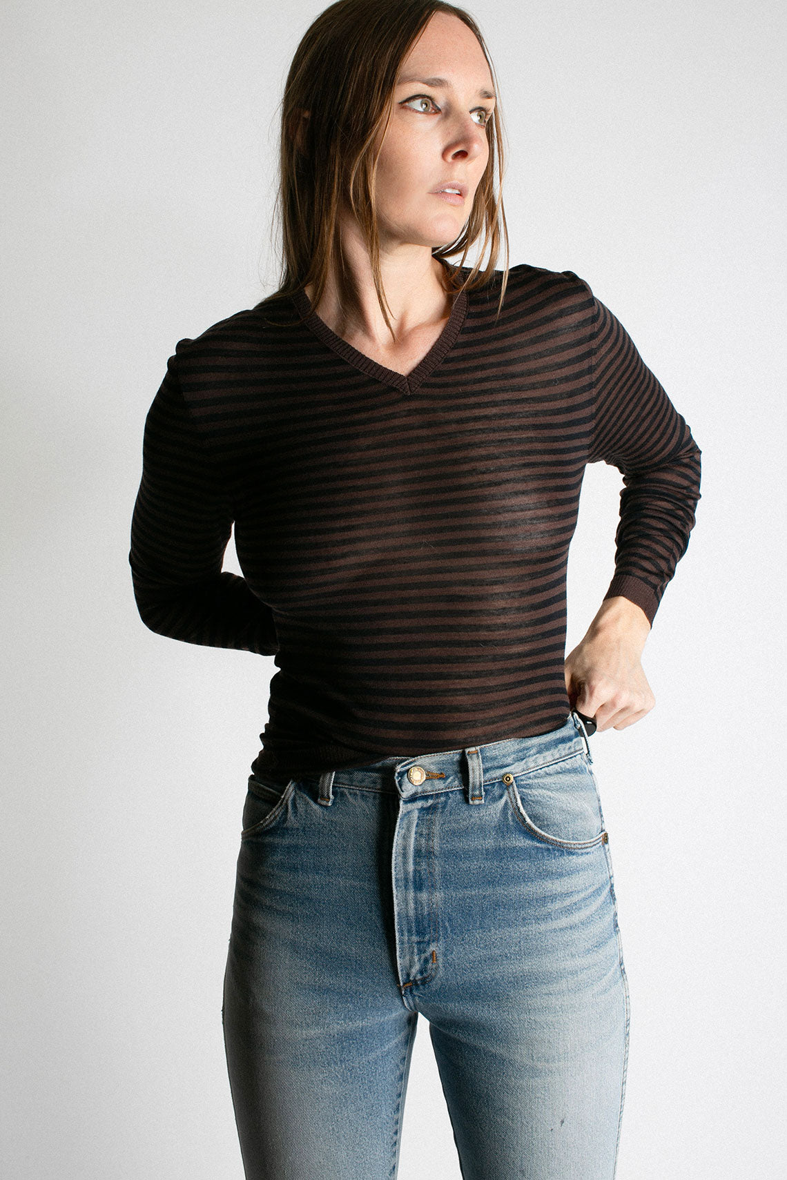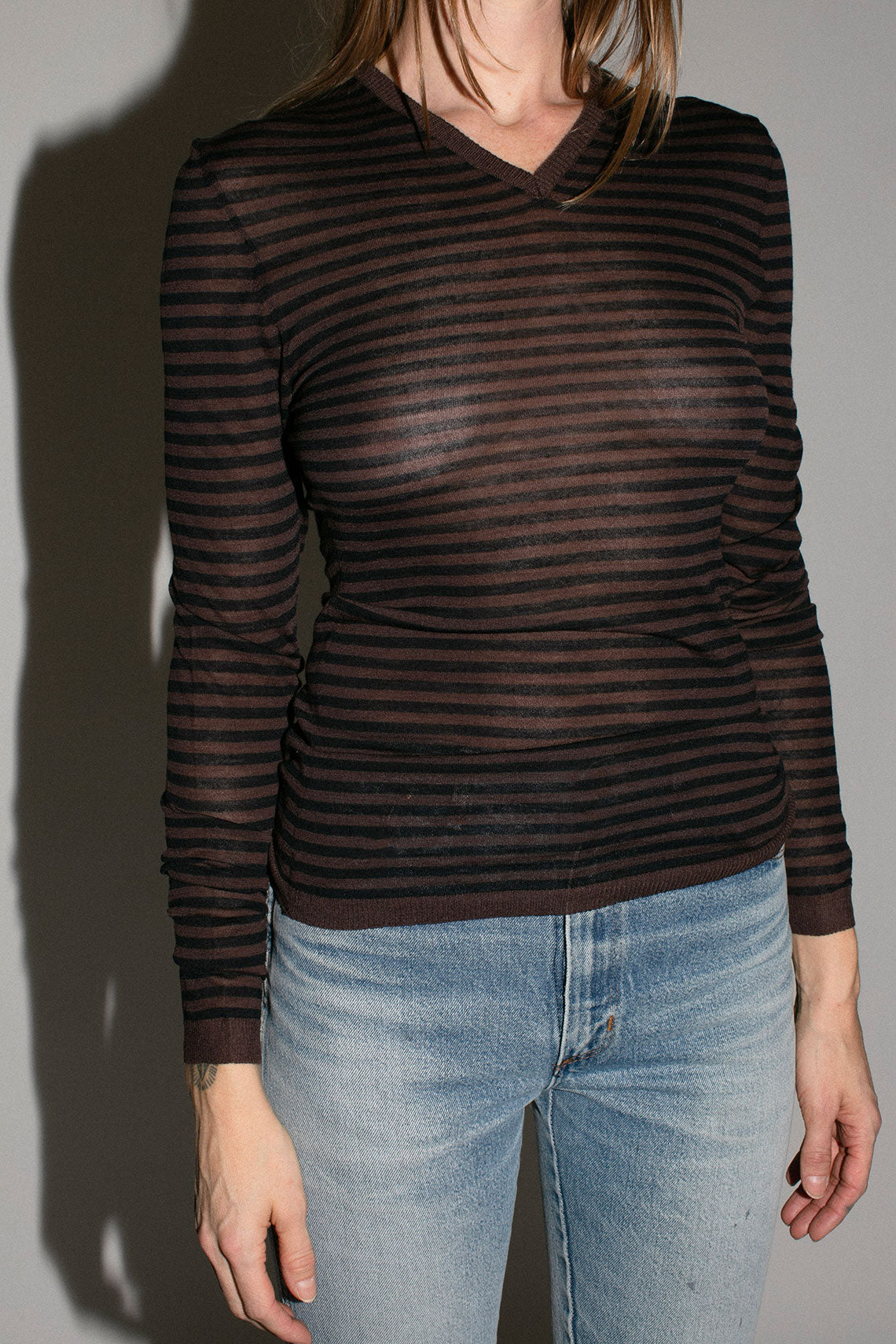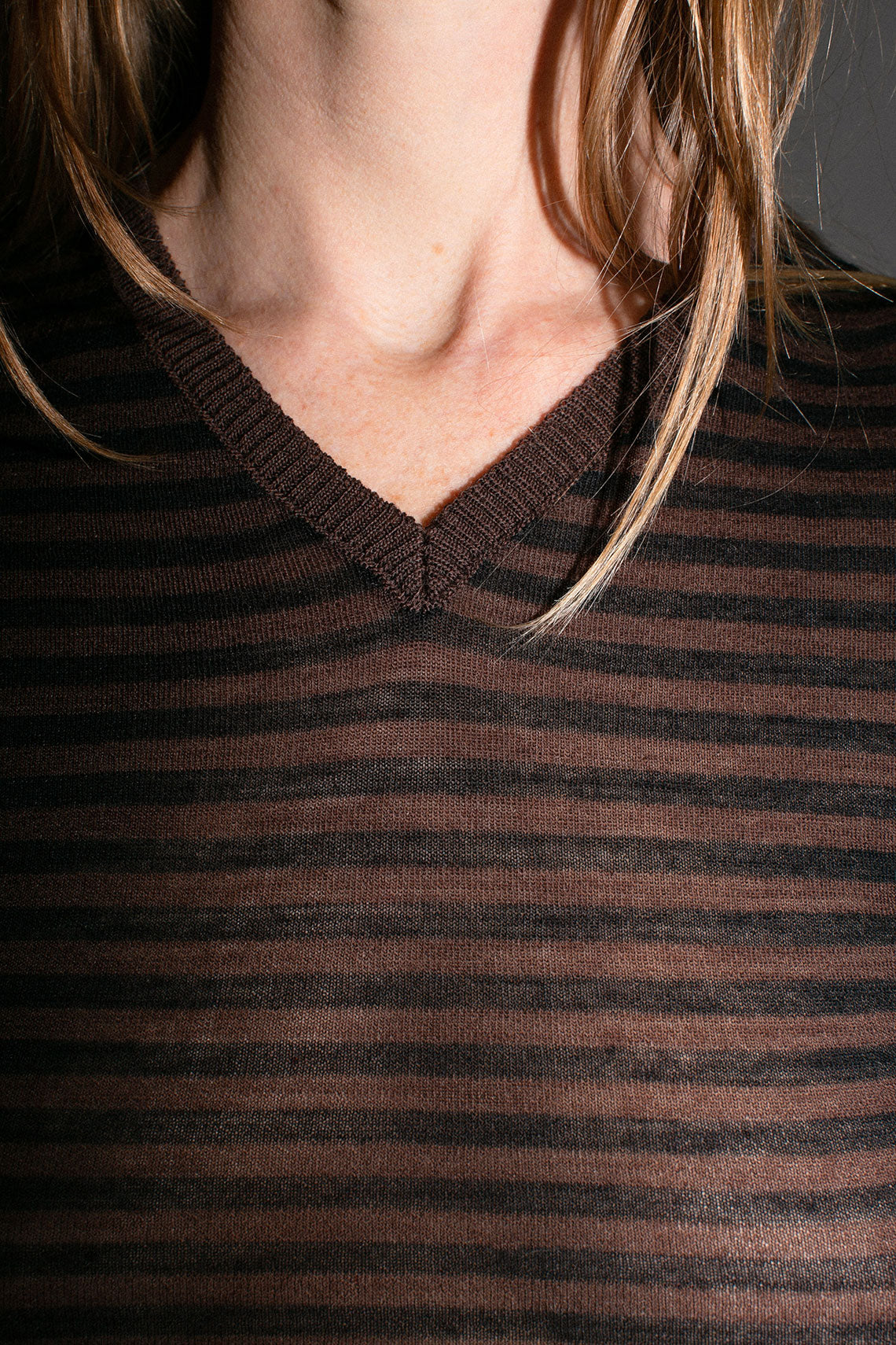 Striped semi-sheer fitted v-neck top. Fabric is 88% merino wool 12% polyamide.