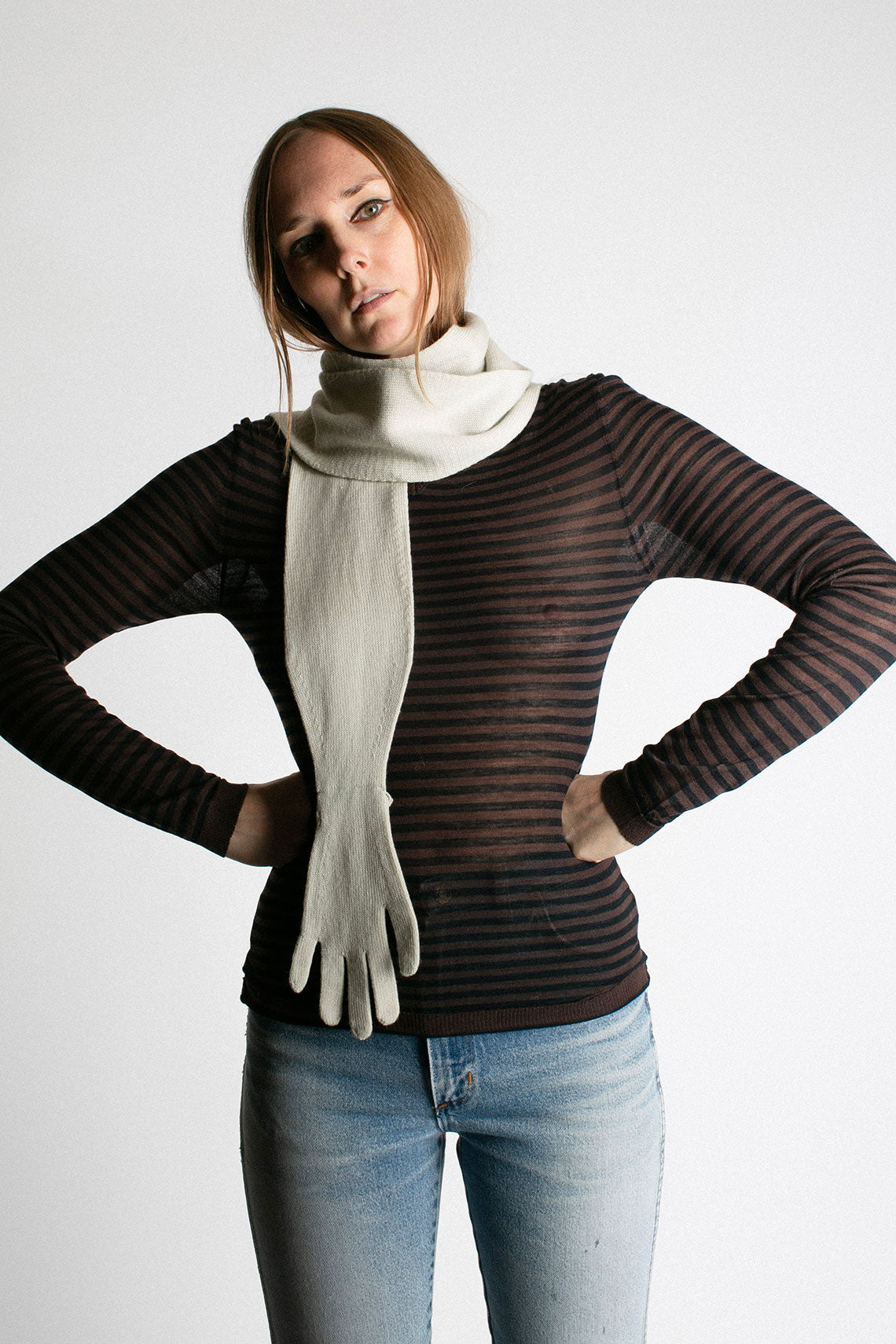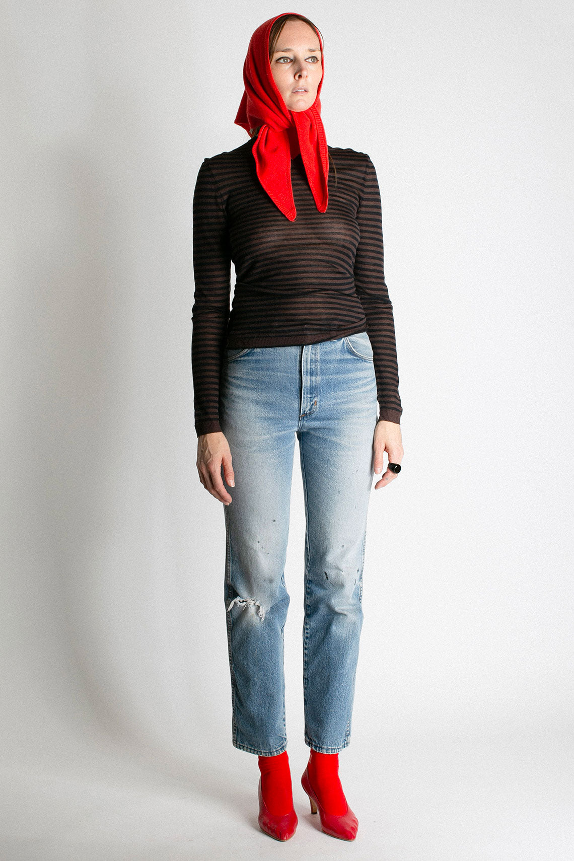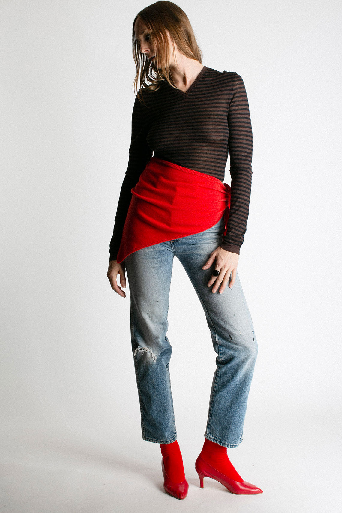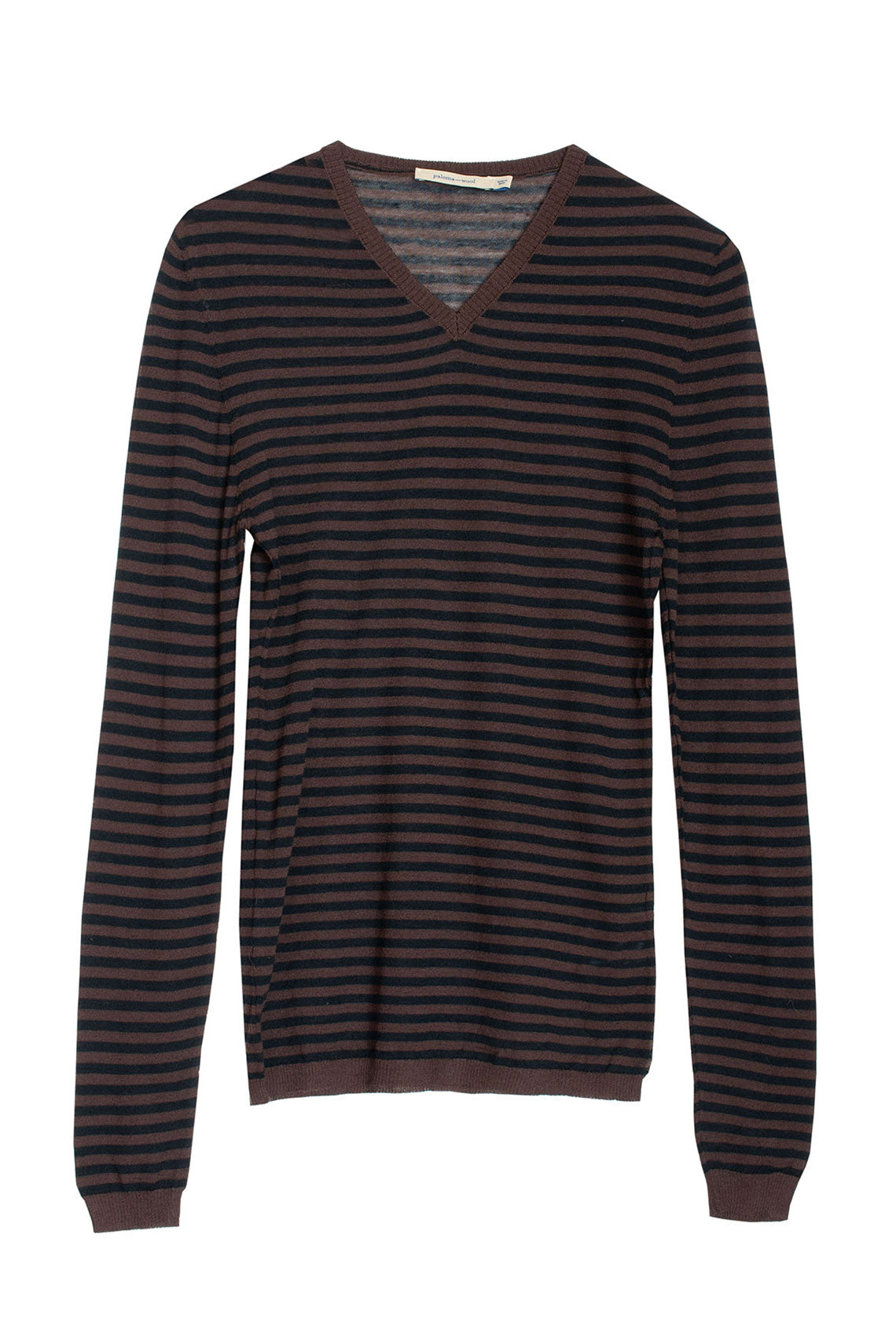Striped semi-sheer fitted v-neck top. Fabric is 88% merino wool 12% polyamide.