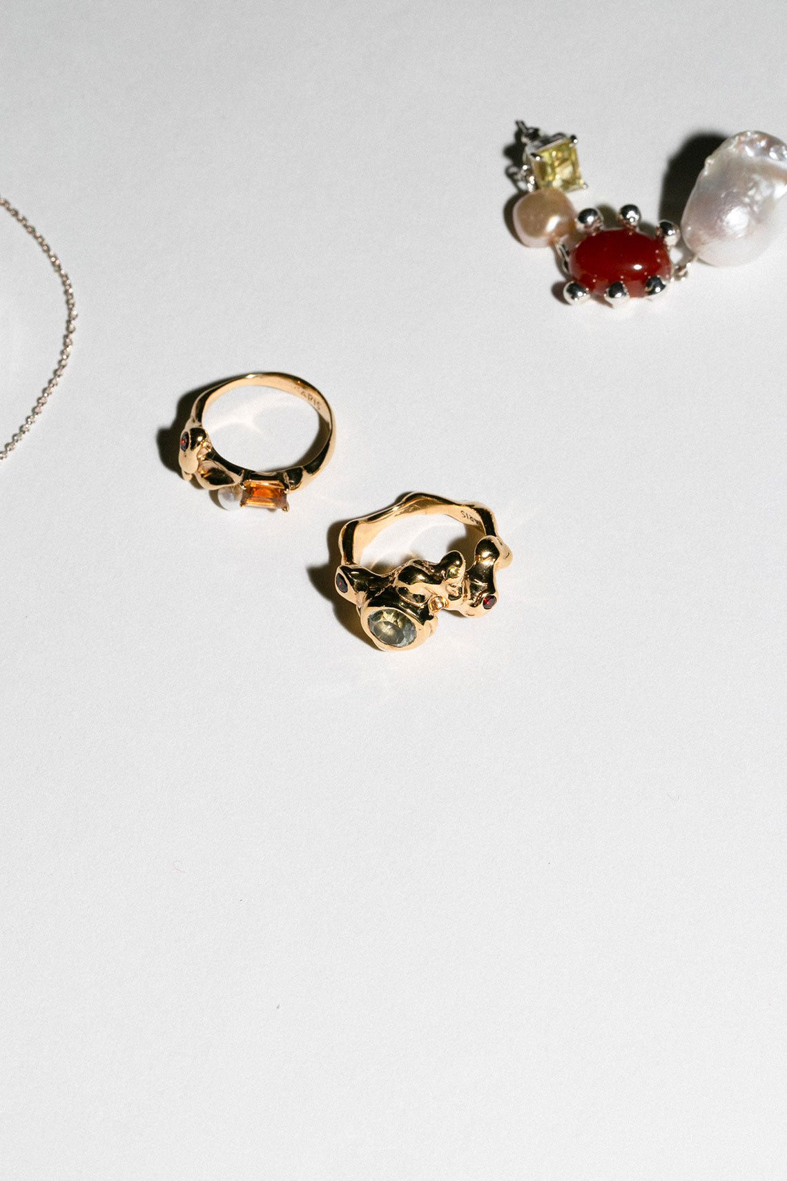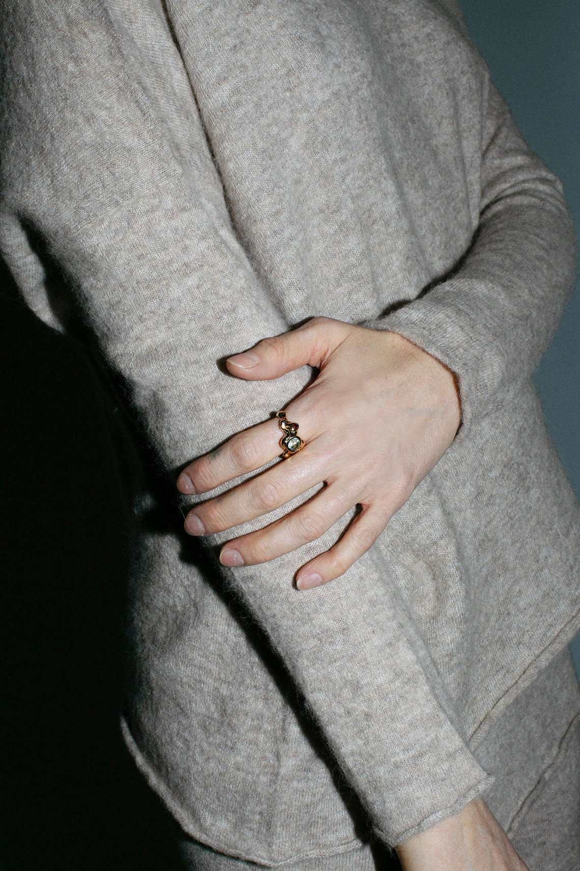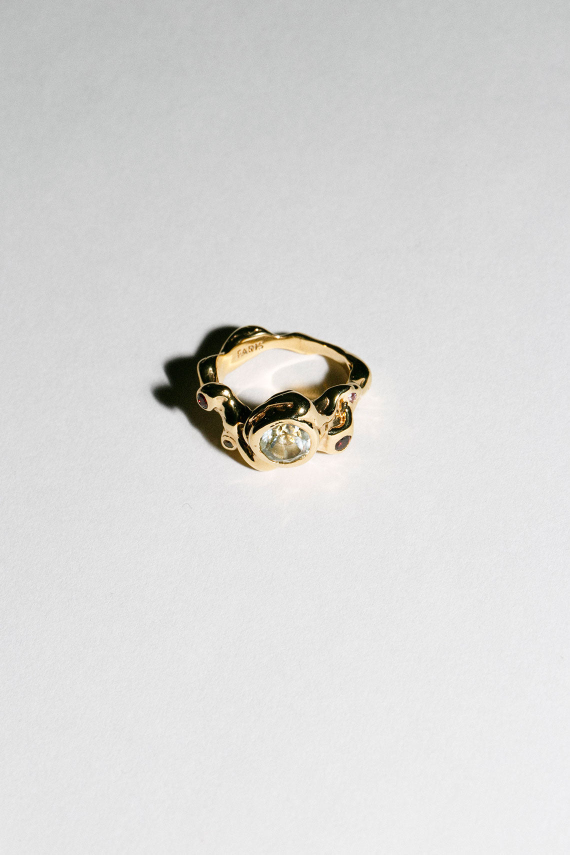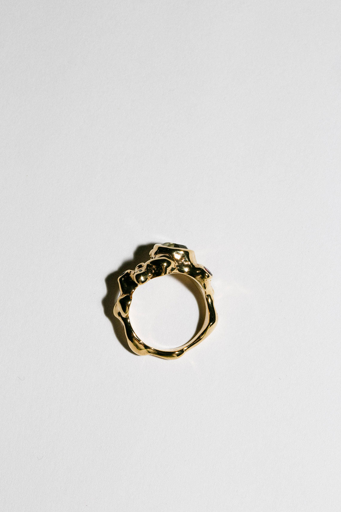 The Caldera takes its shape from molten form with gems suspended in flow. 14K Gold-plated adorned with Green Amethyst.