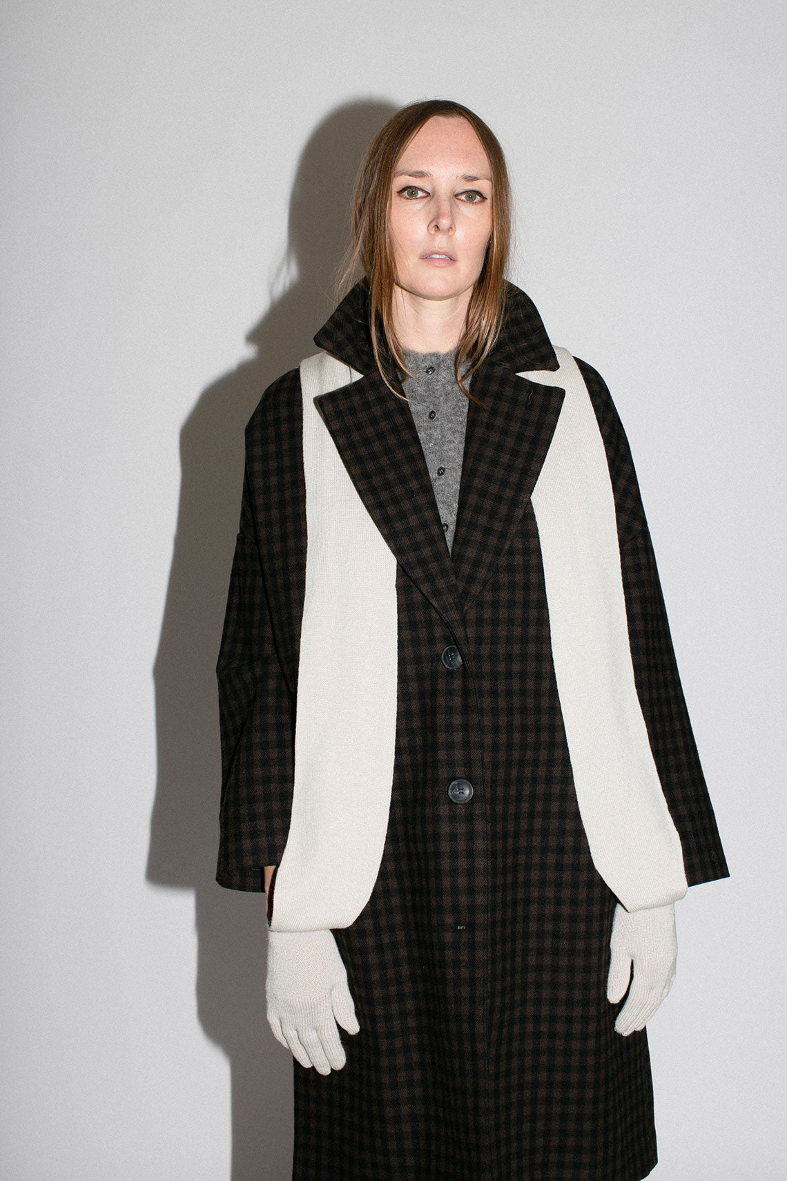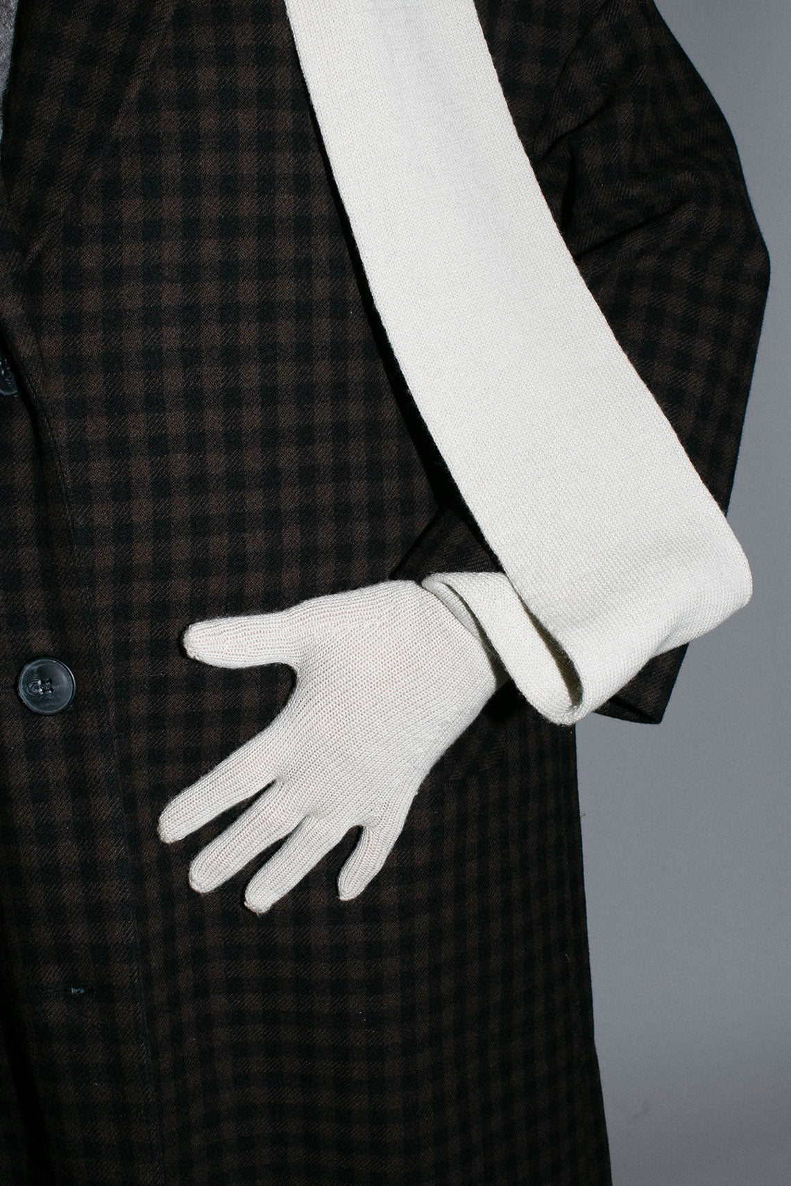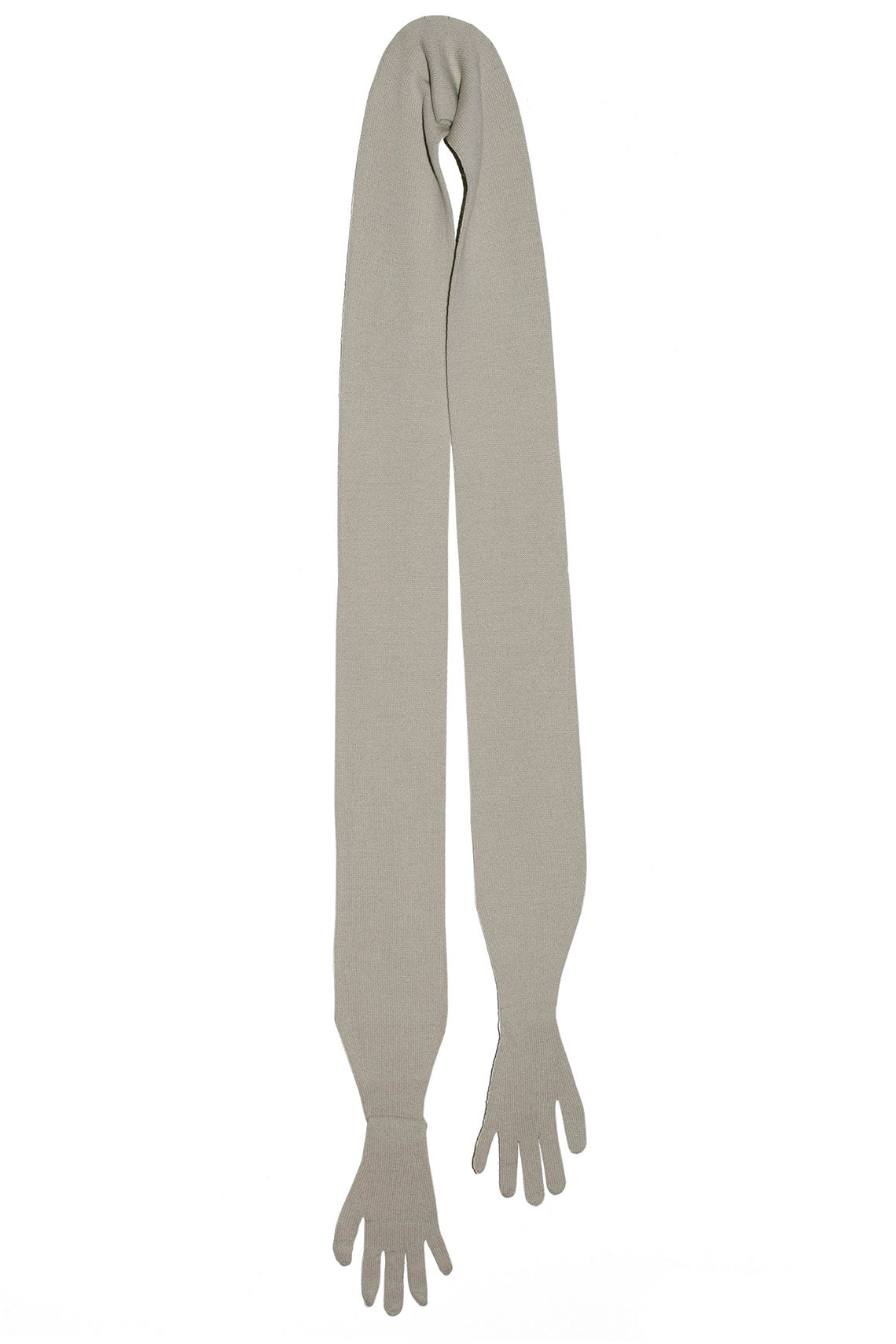 Extra long scarf with gloves at both ends (yes, like when you were a kid). Can be wrapped around the neck, and hands can be slipped into the gloves. Medium-thick texture. Fabric is 100% merino wool.