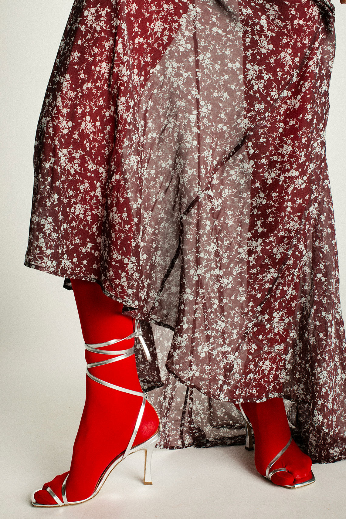 Red opaque footed 80D tights. Reinforced crotch. Fabric is 84% Nylon, and 16% Spandex.