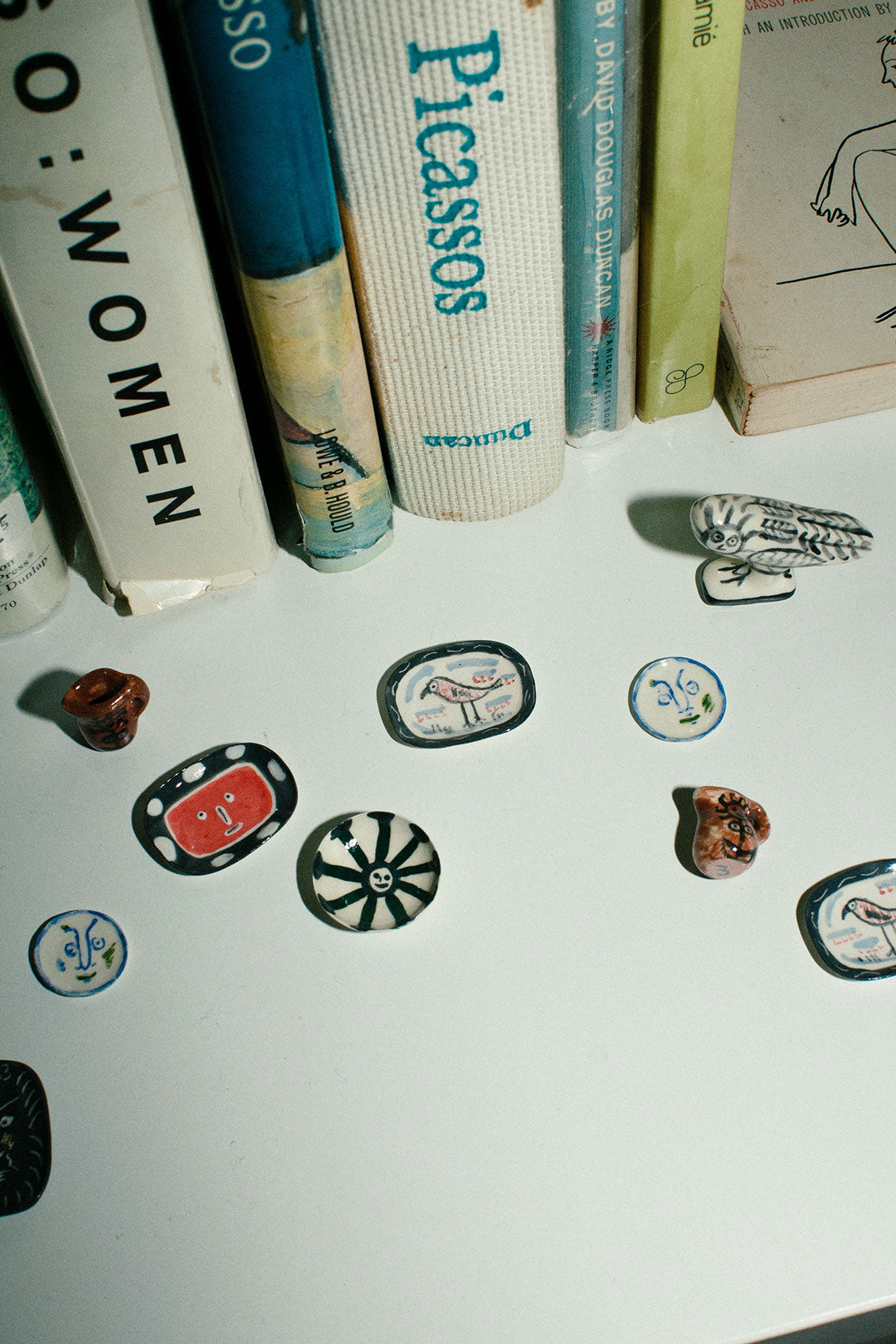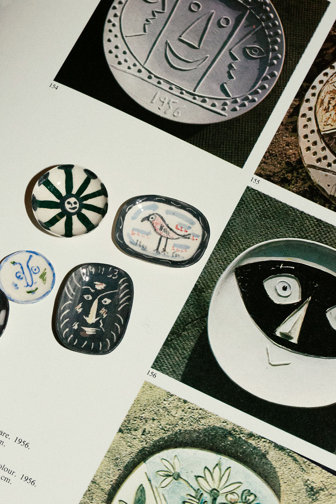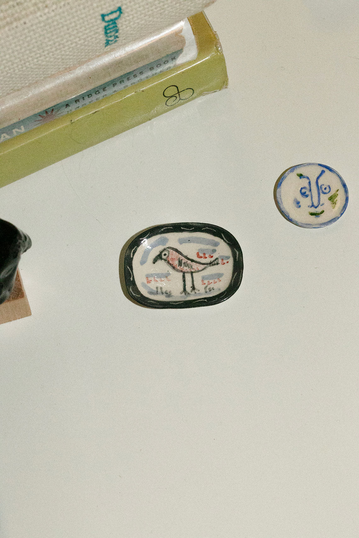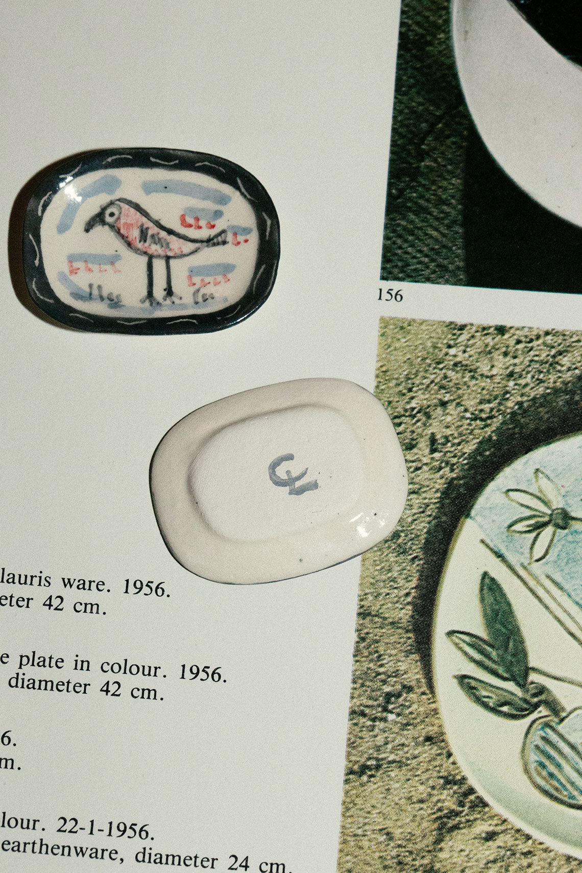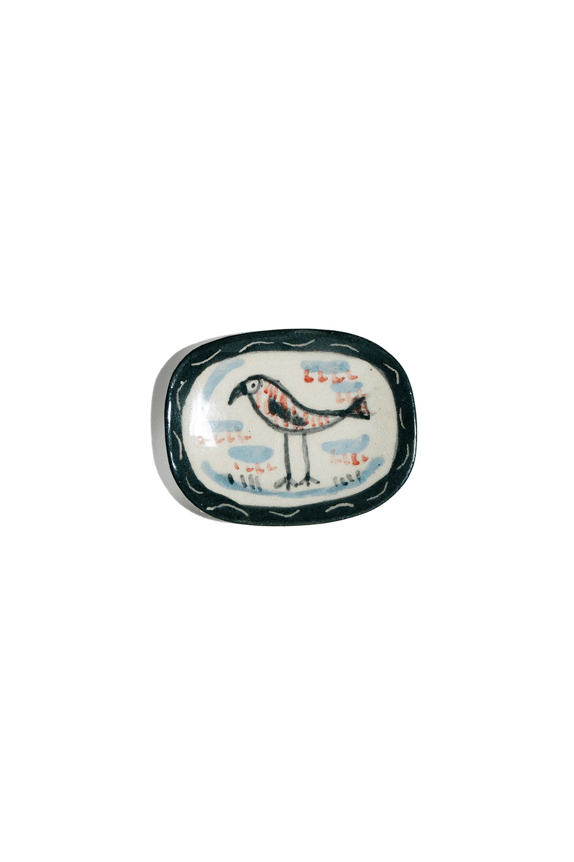 Tiny Picasso-inspired ceramic platter with yellow bird. All items are handmade from start to finish, using clay, underglaze paint, several glazes, china paint. Measures 1" by 1 1/4".  Very fragile.