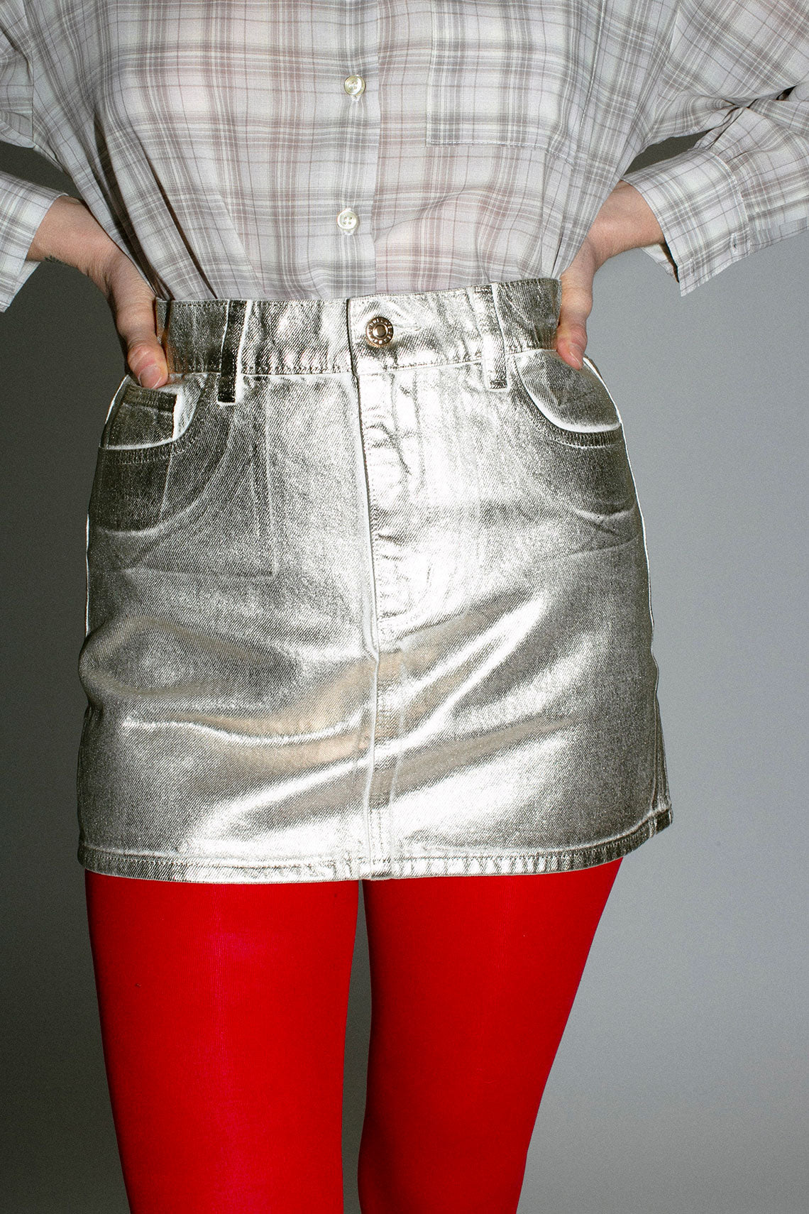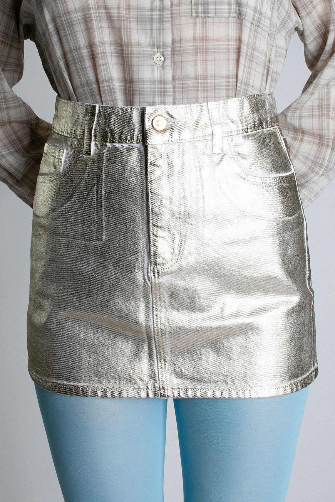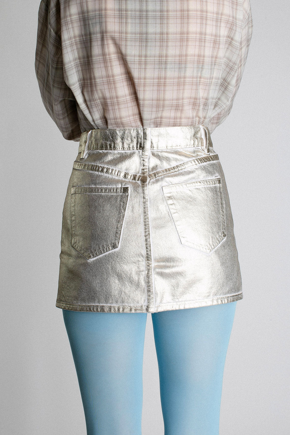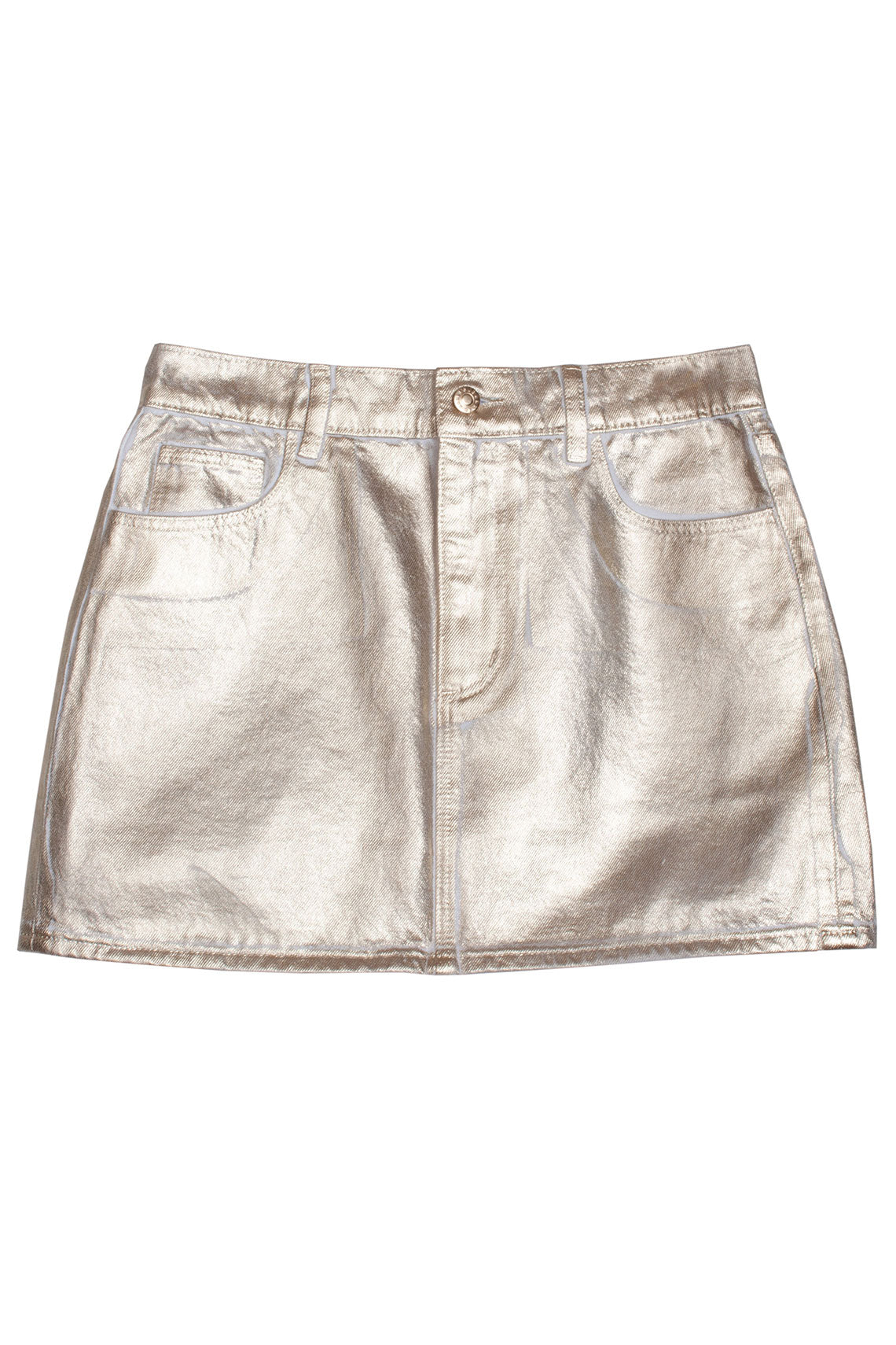 Relaxed fit gold foiled mini skirt with zip & button closure.