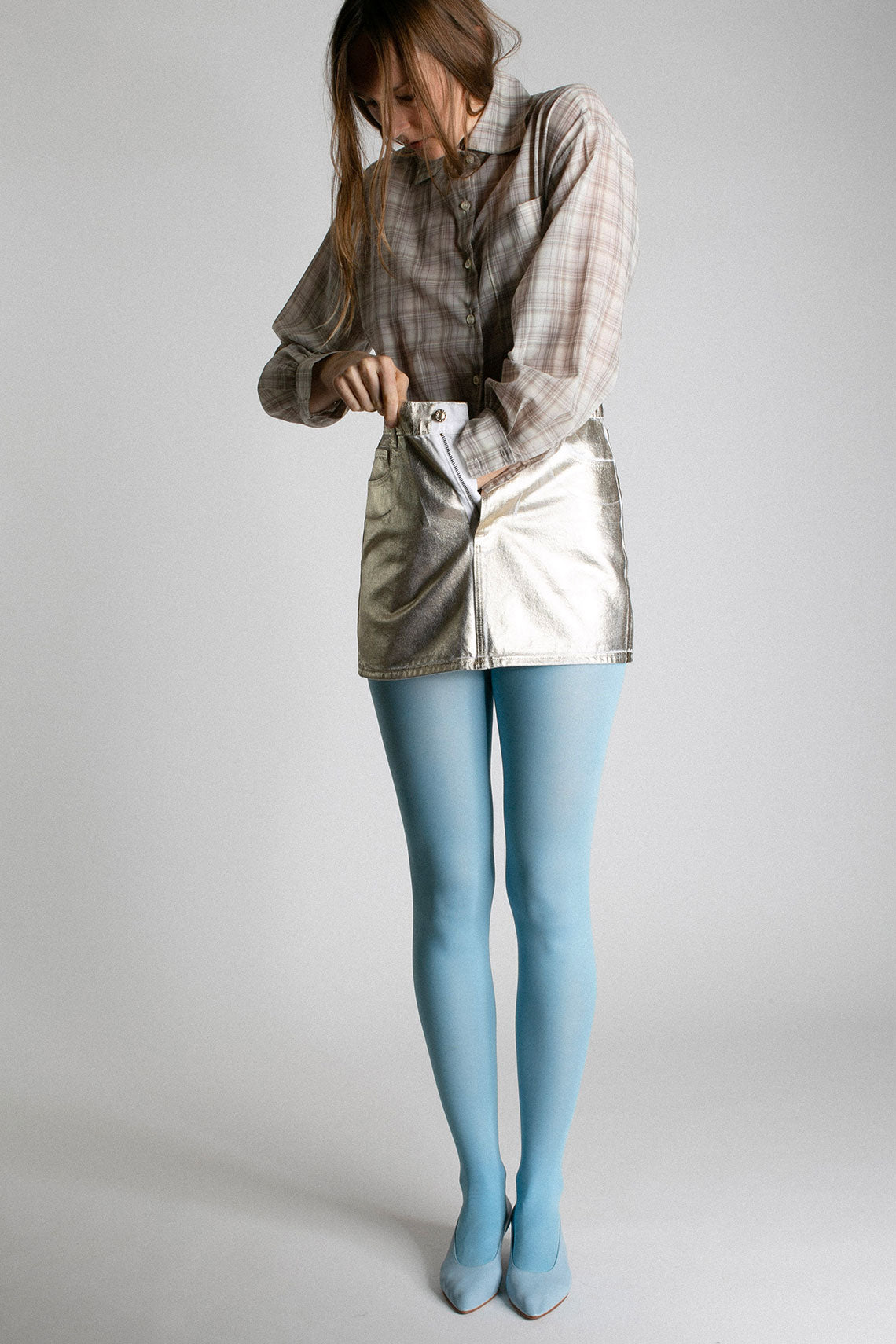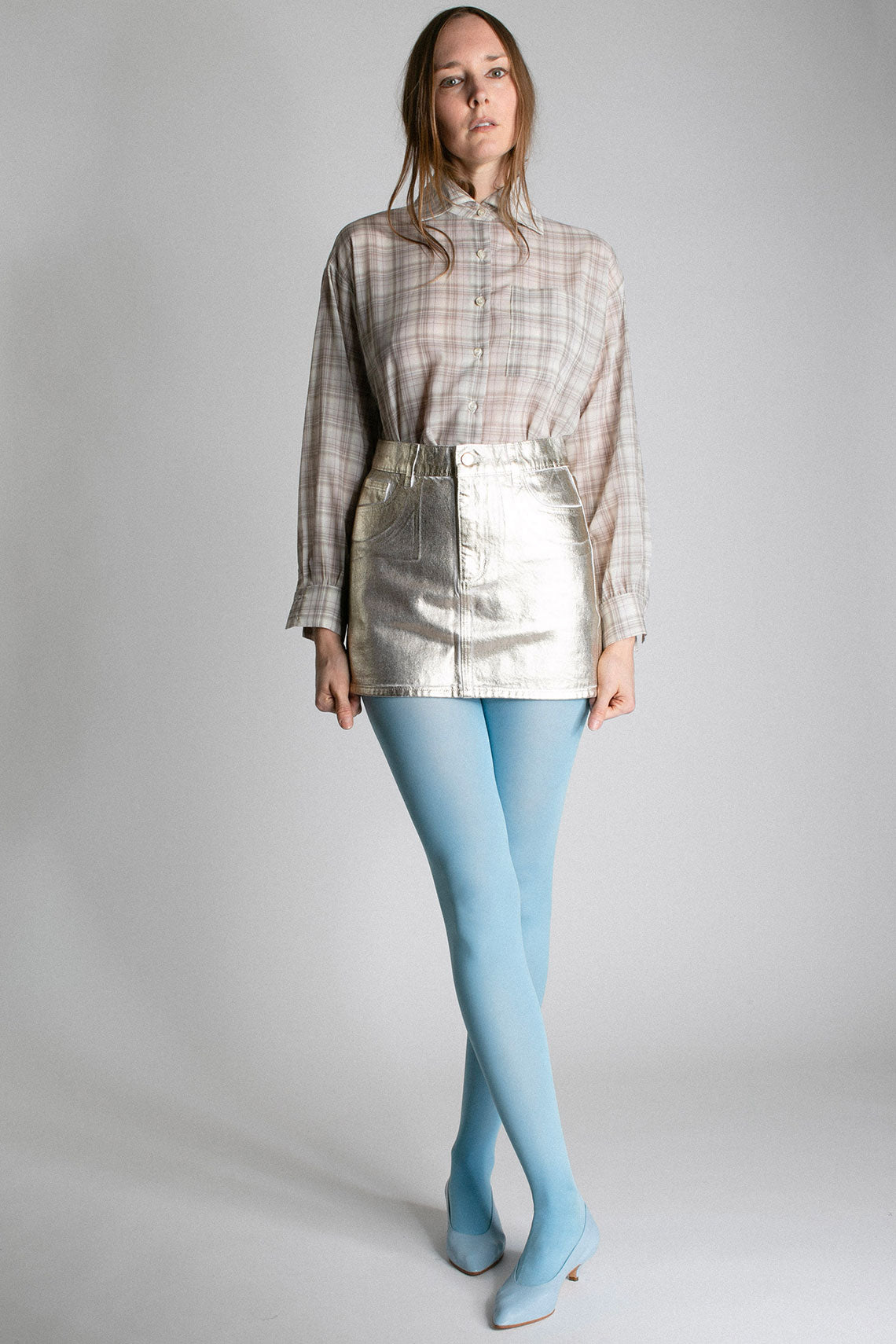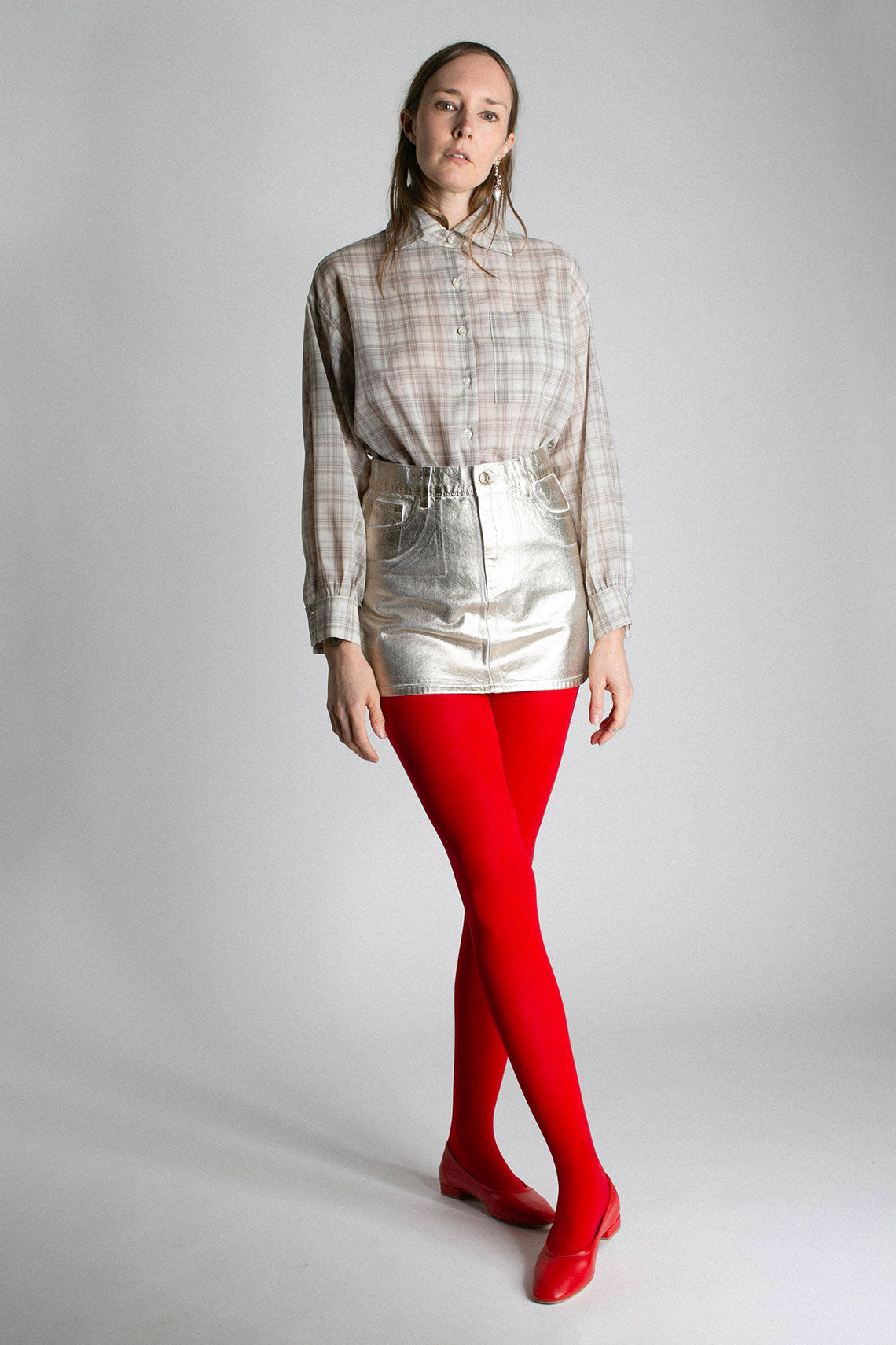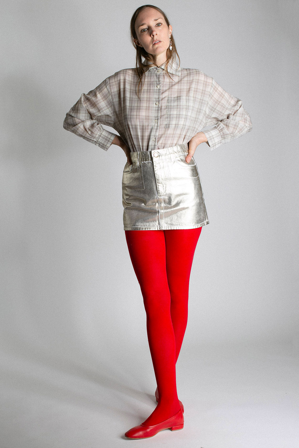 Relaxed fit gold foiled mini skirt with zip & button closure.