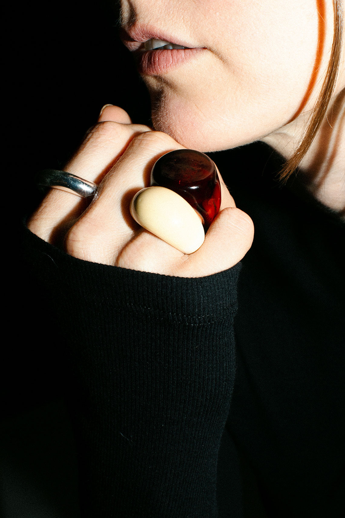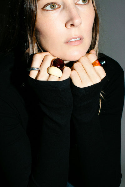 Opaque, cream colored glass with slight variation in tone throughout .75" long, 1" wide across the finger. Bulb shape that sits higher above the finger and tapers at the base of the band.