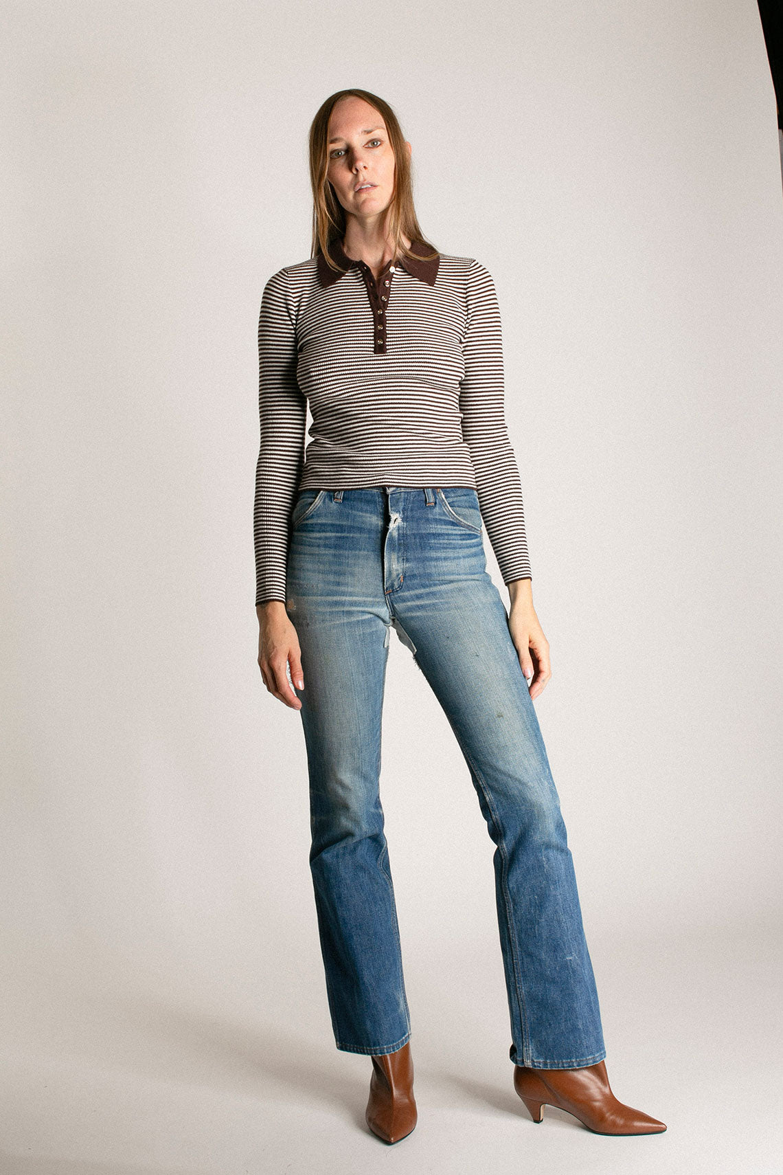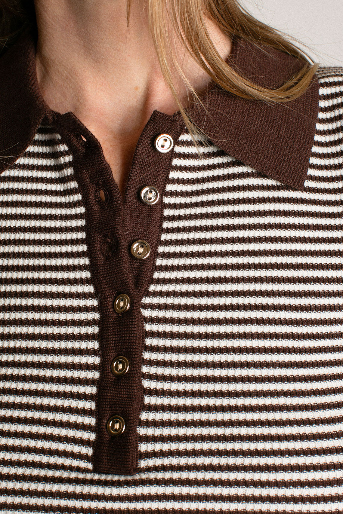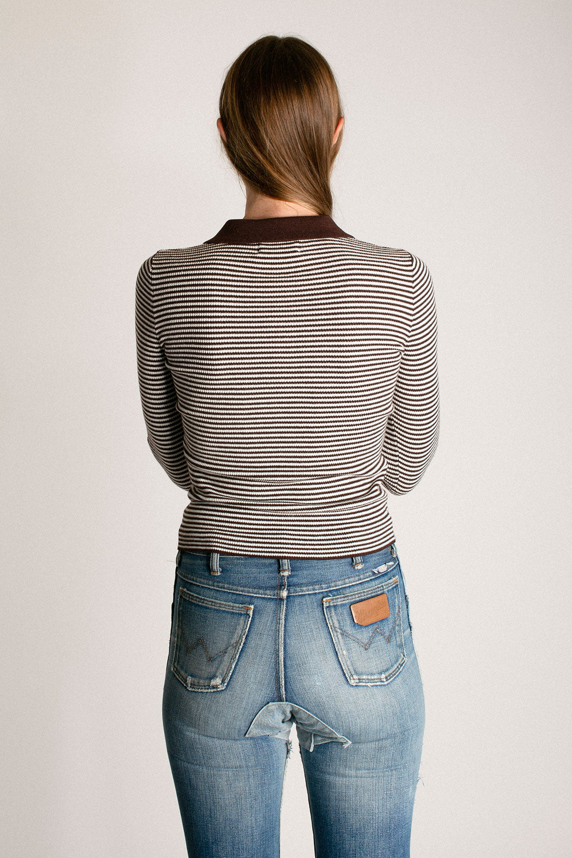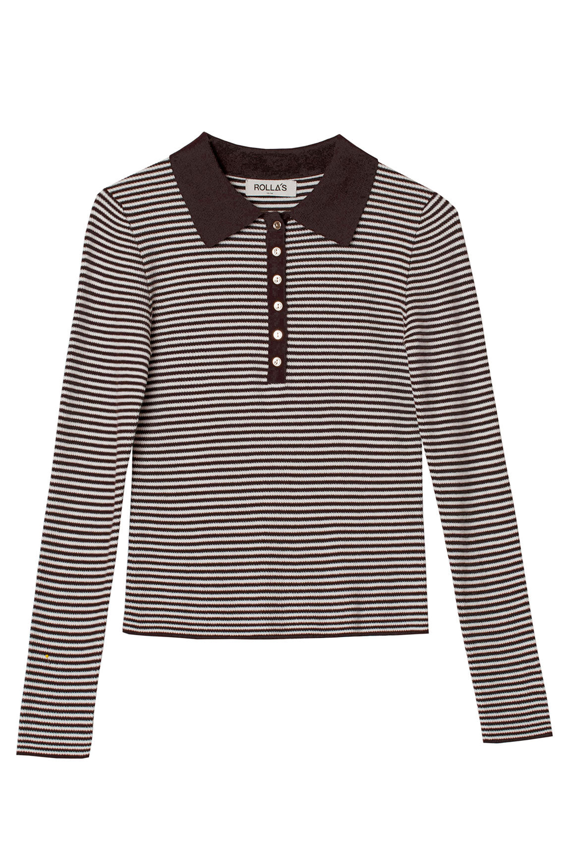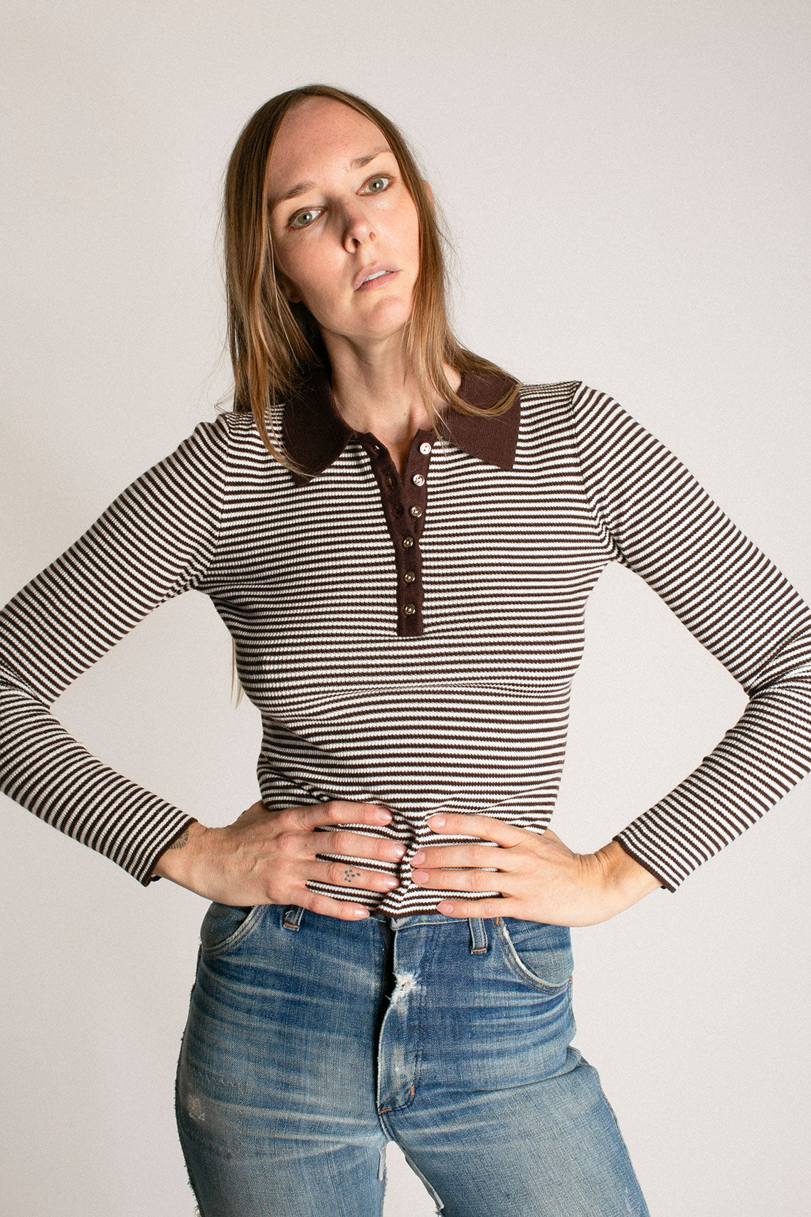 Vintage inspired long sleeve polo in a fitted striped knit. Fabric is 48% viscose, 32% cotton, and 2% elastane.