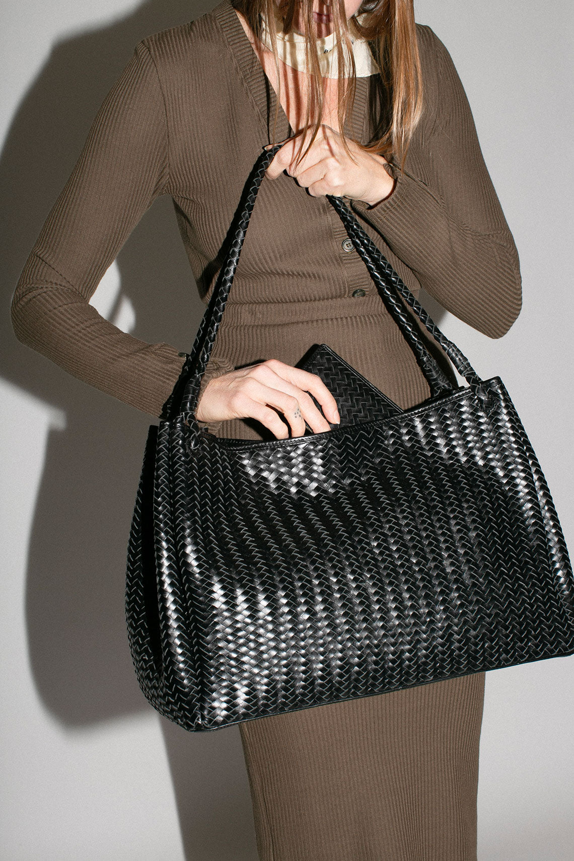 Black woven leather slim, minimalist wallet to hold your essentials. Features even card slots, a zip pouch for change, and a pocket to tuck away loose bills. 6.5” x 3.5”