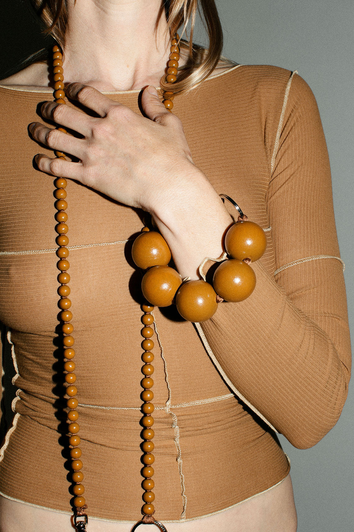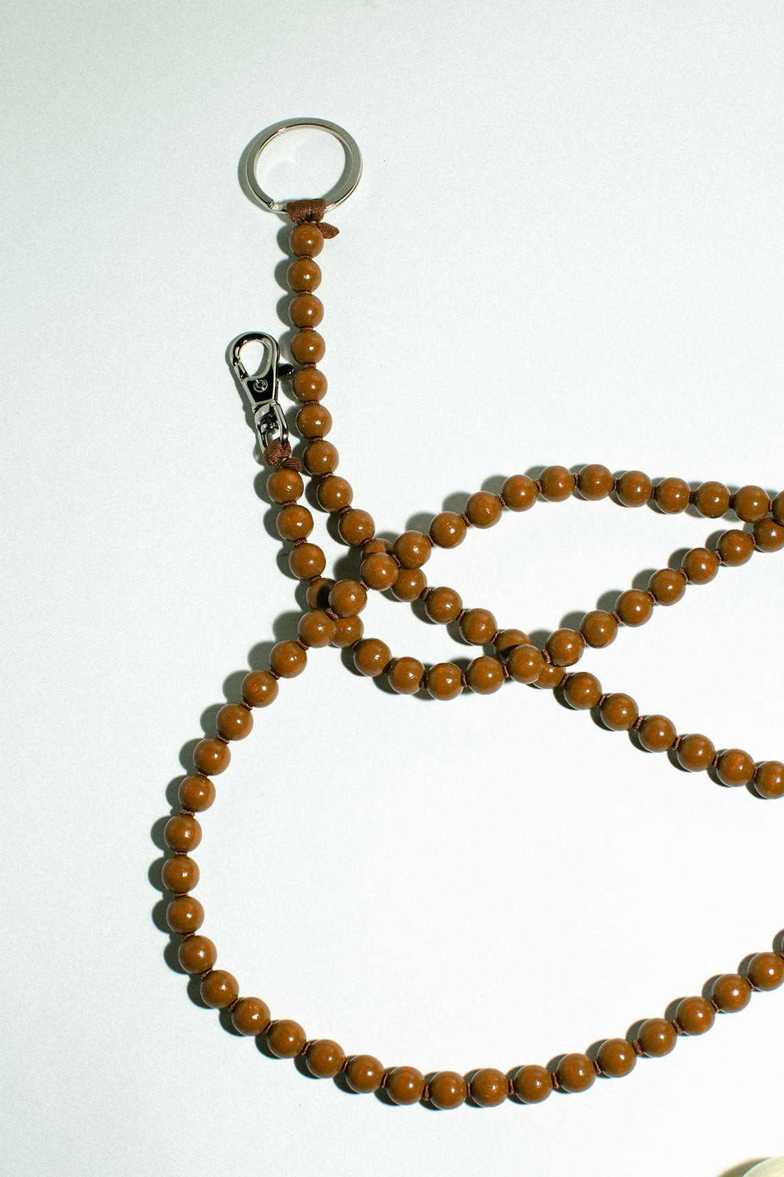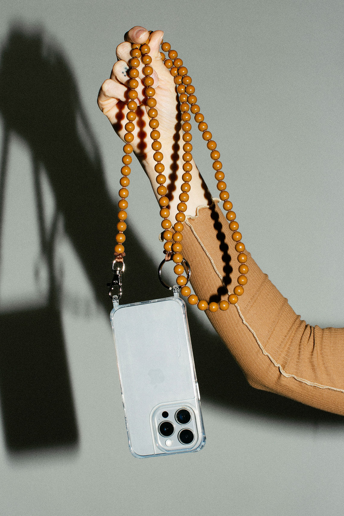 Clear iPhone case with removable beaded strap. 10mm mocca brown wooden beads on an elastic cord for minimal, convenient access. 49" in total length. Varnish is vegan and non-toxic.