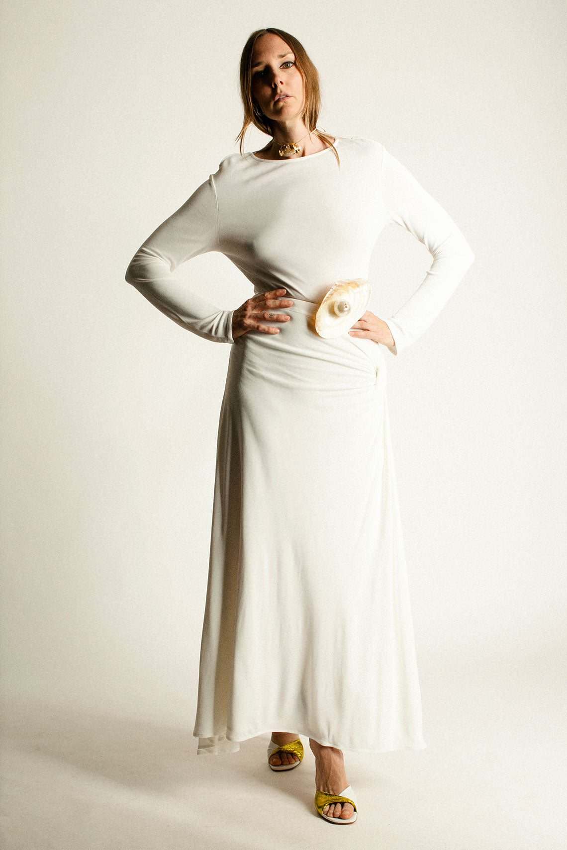 A gorgeous, slinky dress with minimal draped and knotted details. High side slit, long sleeves and a jewel neckline. Fabric is 100% rayon.