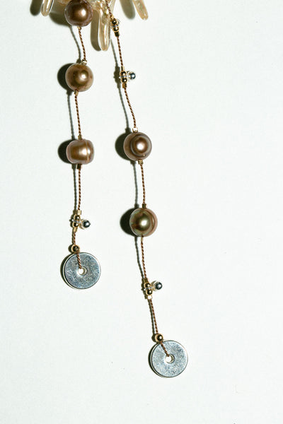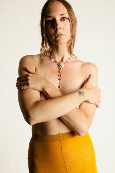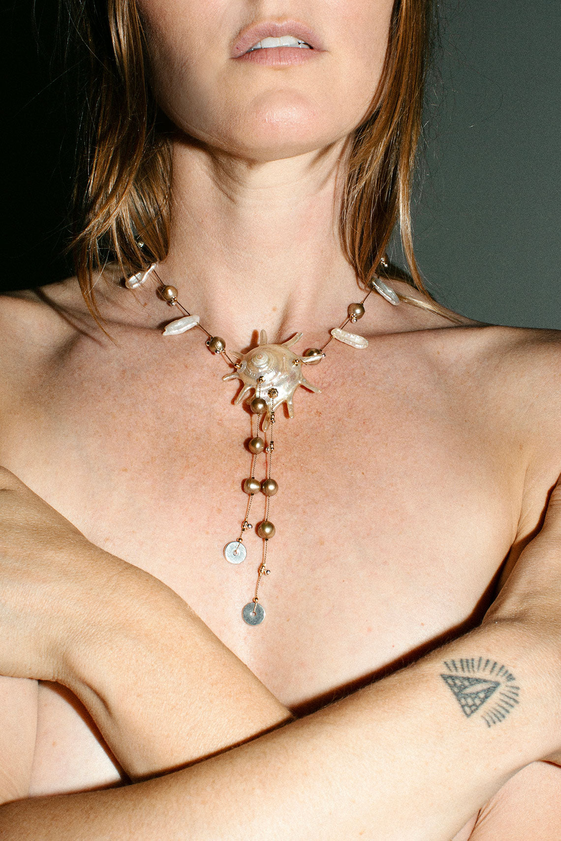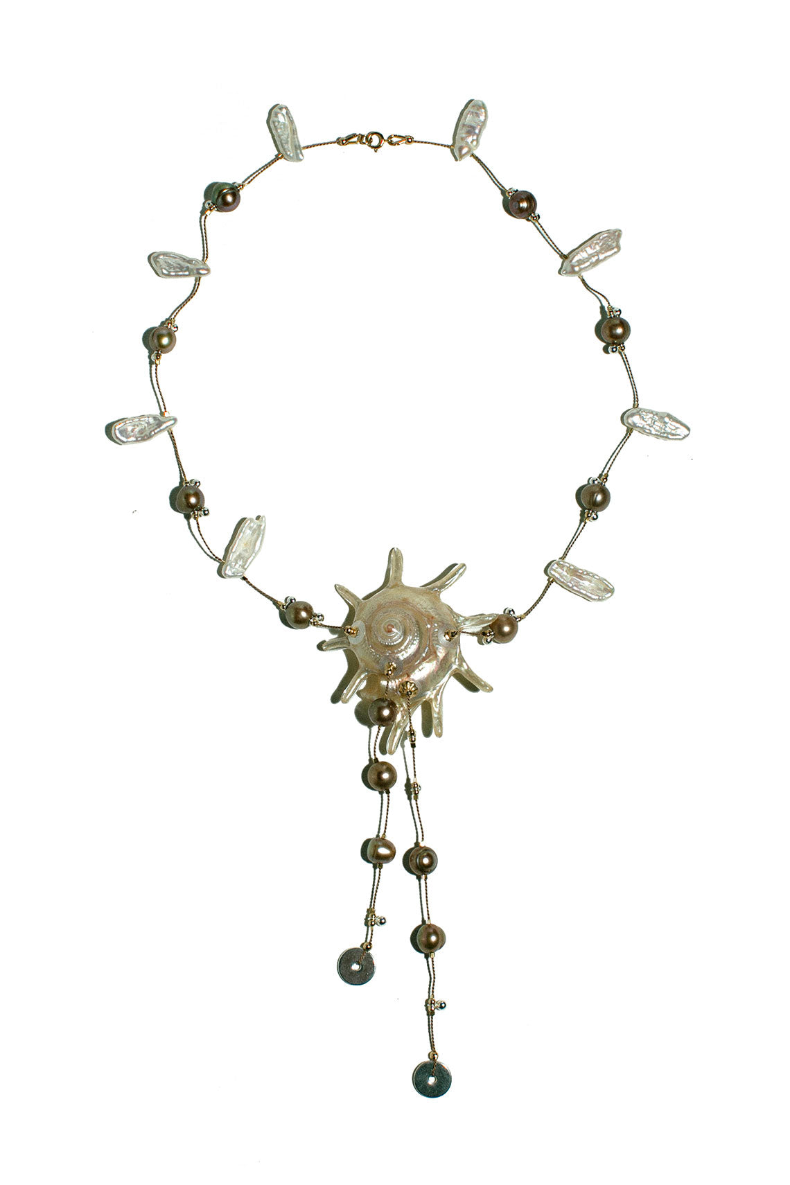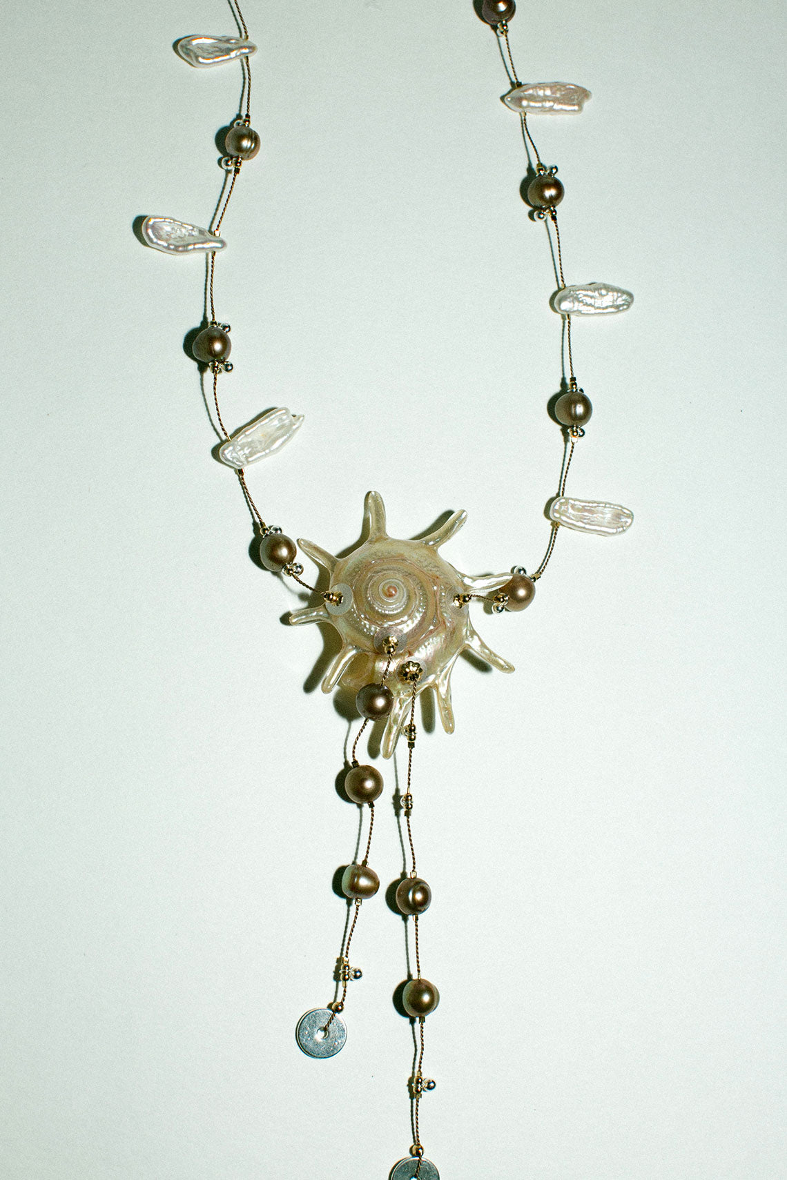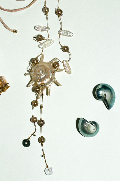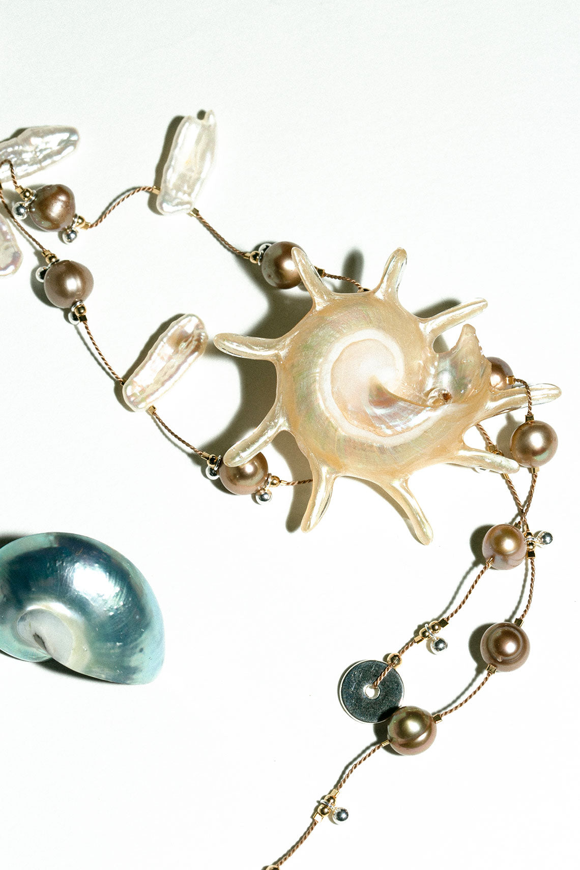 From isshi's collection 011, the limited edition Eclipse Pearl Necklace is made of guildfordia yoka shell dipped in plant based resin on 100% silk cord with freshwater pearls, 14k yellow gold-filled details, sterling silver and fired terracotta beads dipped in fine silver. Centerpiece measures 2.5" x 2.5", neck 17", drop 12".  Handmade in NYC.